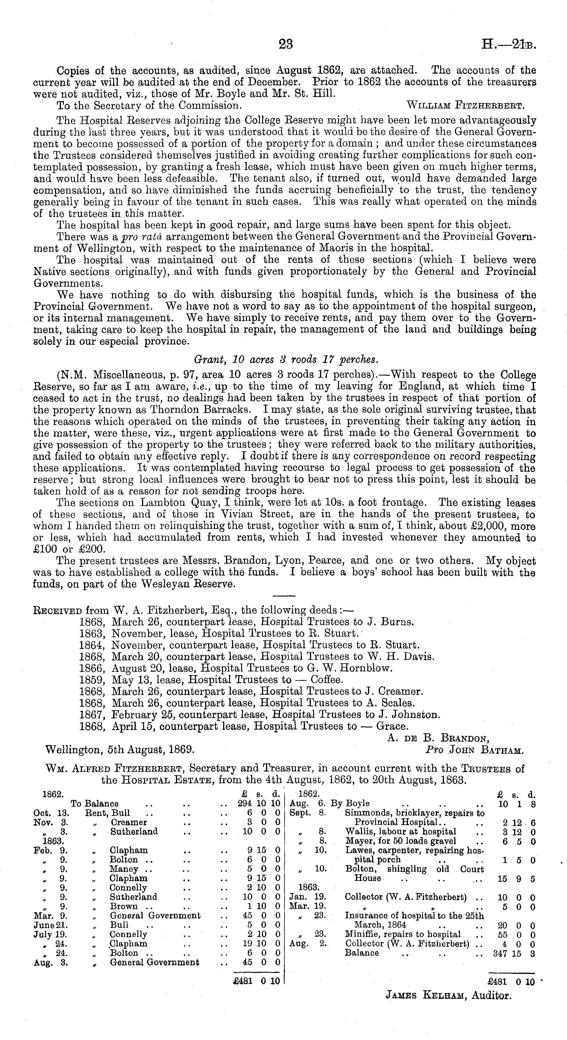 Copies of the accounts, as audited, since August 1862, are attached. The accounts of the current year will be audited at the end of December. Prior to 1862 the accounts of the treasurers were not audited, viz., those of Mr. Boyle and Mr. St. Hill. To the Secretary of the Commission. William Fitzherbeet. The Hospital Eeserves adjoining the College Eeserve might have been let more advantageously during the last three years, but it was understood that it would be the desire of the General Government to become possessed of a portion of the property for a domain ; and under these circumstances the Trustees considered themselves justified in avoiding creating further complications for such contemplated possession, by granting a fresh lease, which must have been given on much higher terms, and would have been less defeasible. The tenant also, if turned out, would have demanded large compensation, and so have diminished the funds accruing beneficially to the trust, the tendency generally being in favour of the tenant in such cases. This was really what operated on the minds of the trustees in this matter. The hospital has been kept in good repair, and large sums have been spent for this object. There was a pro rata arrangement between the General Government and the Provincial Government of Wellington, with respect to the maintenance of Maoris in the hospital. The hospital was maintained out of the rents of these sections (which I believe were Native sections originally), and with funds given proportionately by the General and Provincial Governments. We have nothing to do with disbursing the hospital funds, which is the business of the Provincial Government. We have not a word to say as to the appointment of the hospital surgeon, or its internal management. We have simply to receive rents, and pay them over to the Government, taking care to keep the hospital in repair, the management of the land and buildings being solely in our especial province. Grant, 10 acres 3 roods 17 perches. (N.M. Miscellaneous, p. 97, area 10 acres 3 roods 17 perches).—With respect to the College Reserve, so far as I am aware, i.e., up to the time of my leaving for England, at which time I ceased to act in the trust, no dealings had been taken by the trustees in respect of that portion of the property known as Thorndon Barracks. I may state, as the sole original surviving trustee, that the reasons which operated on the minds of the trustees, in preventing their taking any action in the matter, were these, viz., urgent applications were at first made to the General Government to give possession of the property to the trustees; they were referred back to the military authorities, and failed to obtain any effective reply. I doubt if there is any correspondence on record respecting these applications. It was contemplated having recourse to legal process to get possession of the reserve; but strong local influences were brought to bear not to press this point, lest it should be taken hold of as a reason for not sending troops here. The sections on Lambton Quay, I think, were let at 10s. a foot frontage. The existing leases of these sections, and of those in Vivian Street, are in the hands of the present trustees, to whom I handed them on relinquishing the trust, together with a sum of, I think, about £2,000, more or less, which had accumulated from rents, which I had invested whenever they amounted to £100 or £200. The present trustees are Messrs. Brandon, Lyon, Pearce, and one or two others. My object was to have established a college with the funds. I believe a boys' school has been built with the funds, on part of the Wesleyan Reserve. Received from W. A. Fitzherbert, Esq., the following deeds: — 1868, March 26, counterpart lease, Hospital Trustees to J. Burns. 1863, November, lease, Hospital Trustees to R. Stuart. 1864, November, counterpart lease, Hospital Trustees to R. Stuart. 1868, March 20, counterpart lease, Hospital Trustees to W. H. Davis. 1866, August 20, lease, Hospital Trustees to G. W. Hornblow. 1859, May 13, lease, Hospital Trustees to — Coffee. 1868, March 26, counterpart lease, Hospital Trustees to J. Creamer. 1868, March 26, counterpart lease, Hospital Trustees to A. Scales. 1867, February 25, counterpart lease, Hospital Trustees to J. Johnston. 1868, April 15, counterpart lease, Hospital Trustees to — Grace. A. de B. Beandon, Wellington, sth August, 1869. Pro John Batham. Wμ. Alfred Fitzheebeet, Secretary and Treasurer, in account current with the Trustees of the Hospital Estate, from the 4th August, 1862, to 20th August, 1863. 1862. £ s. d. 1862. £ s . d. To Balance .. .. .. 294 10 10 Aug. 6. By Boyle .. .. .. 10 1 8 Oct. 13. Bent, Bull .. .. .. 6 0 0 Sept. 8. Simmonds, brioklayer, repairs to Nov. 3. „ Creamer .. .. 3 0 0 Provincial Hospital.. .. 212 6 „ 3. , Sutherland .. .. 10 0 0 „ 8. Wallis, labour at hospital .. 312 0 1863. „ 8. Mayer, for 50 loads gravel .. 6 5 0 Feb. 9. „ Olapham .. .. 915 0 ,10. Lawes, carpenter, repairing hos9. „ Bolton .. .. .. 6 0 0 pital porch .. ~ 15 0 9. „ Maney .. .. .. 5 0 0 ~10. Bolton, shingling old Court „ 9. „ Clapham .. .. 915 0 House .. .. .. 15 9 5 „ 9. „ Connelly .. .. 210 0 1863. 9. „ Sutherland .. .. 10 0 0 Jan. 19. Collector (W. A. Fitzherbert) .. 10 0 0 9. „ Brown .. .. .. 110 0 Mar. 19. „ „ ..500 Mar. 9. „ General Government .. 45 0 0 23. Insurance of hospital to the 25th June2l. „ Bull .. .. .'. 5 0 0 March, 1864 .. .. 20 0 0 July 19. „ Connelly .. .. 210 0 „ 23. Miniffie, repairs to hospital .. 55 0 0 , 24. „ Clapham .. .. 19 10 0 Aug. 2. Collector (W. A. Fitzherbert) .. 4 0 0 , 24. „ Bolton .. .. .. 6 0 0 Balance .. .. .. 347 15 3 Aug. 3. , General Government .. 45 0 0 £481 0 10 £481 0 10 James Kblham, Auditor.