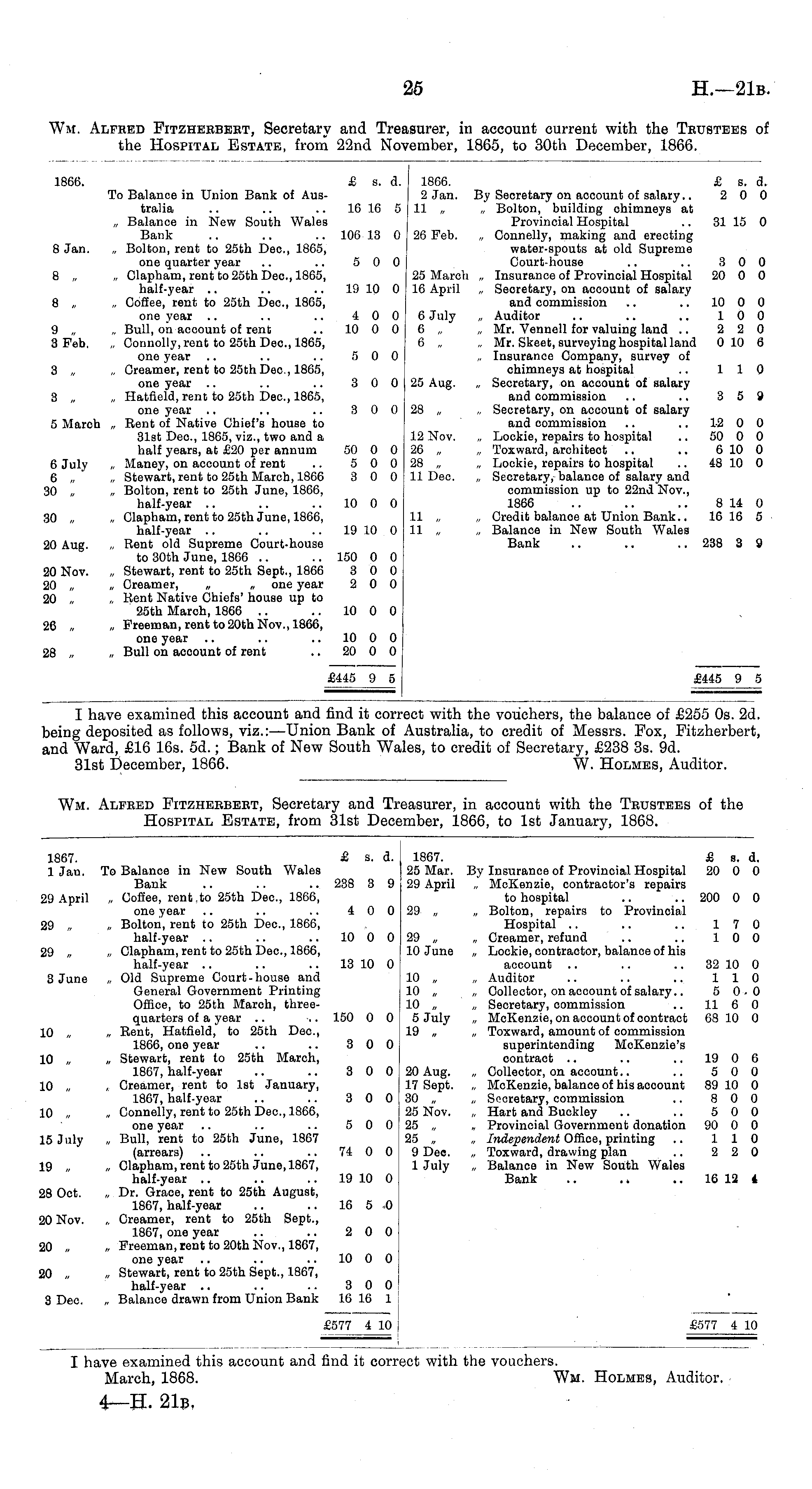 I have examined this account and find it correct with the vouchers, the balance of £255 os. 2d. being deposited as follows, viz.:—Union Bank of Australia, to credit of Messrs. Pox, Fitzherbert, and Ward, £16 16s. 5d.; Bank of New South Wales, to credit of Secretary, £238 3s. 9d. 31st December, 1866. W. Holmes, Auditor.