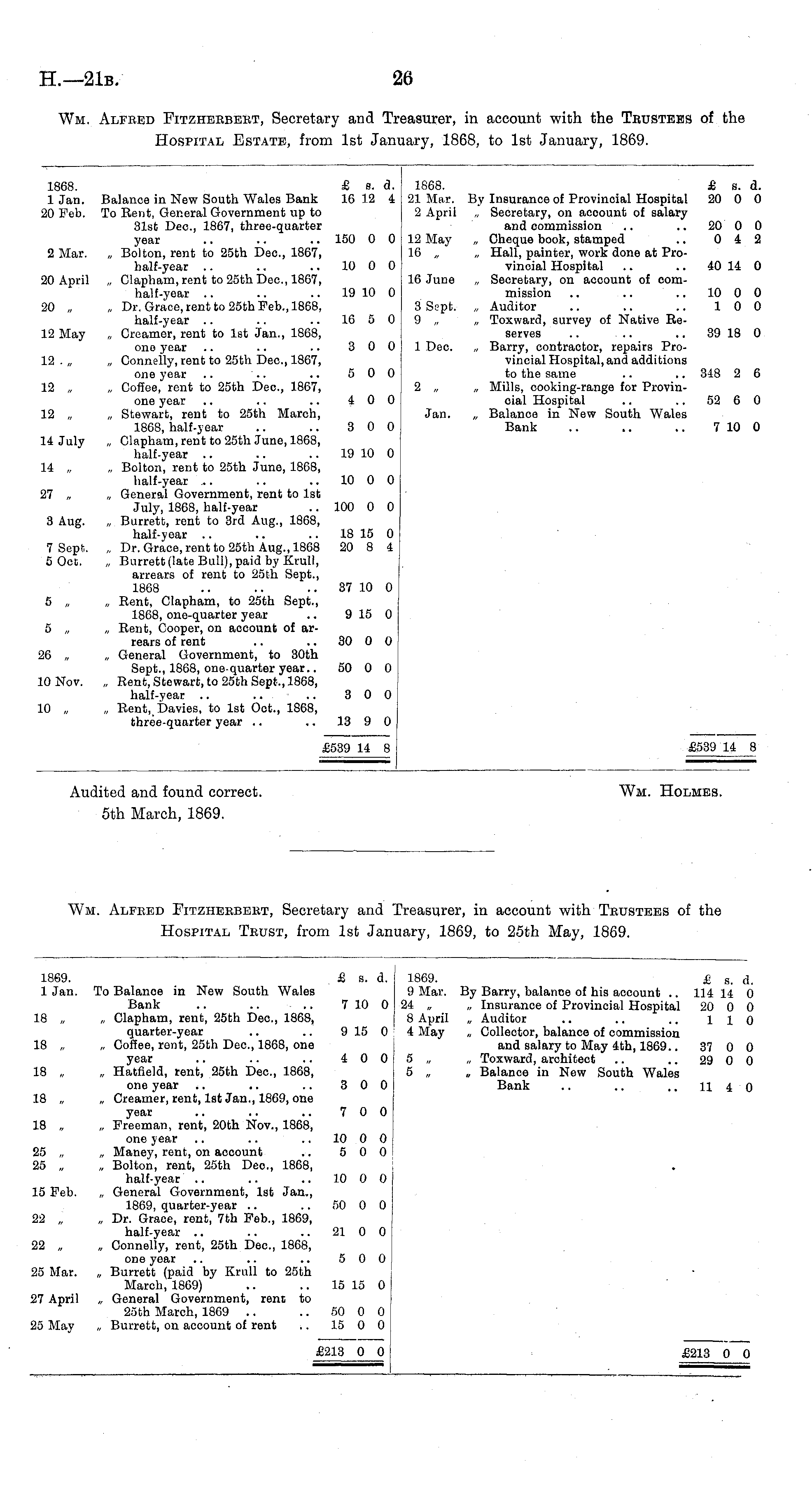 1869. 1 Jan. 18 „ 18 „ 18 „ 18 „ 18 „ 25 „ 25 „ 15 Feb. 22 „ 22 „ 25 Mar. 27 April 25 May £ s. d. To Balanoe in New South Wales Bank .. .. .. 7 10 0 „ Clapham, rent, 25th Dec, 1868, quarter-year .. .. 9 15 0 „ Coffee, rent, 25th Dec, 1868, one year .. .. .. 4 0 0 „ Hatfield, rent, 25th Dec, 1868, one year .. .. .. 3 0 0 „ Creamer, rent, 1st Jan., 1869, one year .. .. .. 7 0 0 „ Freeman, rent, 20th Nov., 1868, one year .. .. .. 10 0 0 „ Maney, rent, on account .. 5 0 0 „ Bolton, rent, 25th Dec, 1868, half-year .. .. .. 10 0 0 „ General Government, 1st Jan., 1869, quarter-year .. .. 50 0 0 „ Dr. Grace, rent, 7th Feb., 1869, half-year .. .. .. 21 0 0 „ Connelly, rent, 25th Dec, 1868, one year .. .. .. 5 0 0 „ Burrett (paid by Krull to 25th March, 1869) .. .. 15 15 0 „ General Government, rent to 25th March, 1869 .. .. 50 0 0 „ Burrett, on account of rent .. 15 0 0 1869. 9 Mar. By Barry, balance of his account .. 24 „ „ Insurance of Provincial Hospital 8 April „ Auditor 4 May „ Collector, balance of commission and salary to May 4th, 1869.. 5 „ „ Toxward, architect 5 „ „ Balance in New South Wales Bank £ s. d. 114 14 0 I 20 0 0 110 i 37 0 0 29 0 0 11 4 0 £213 0 0 £213 0 0
