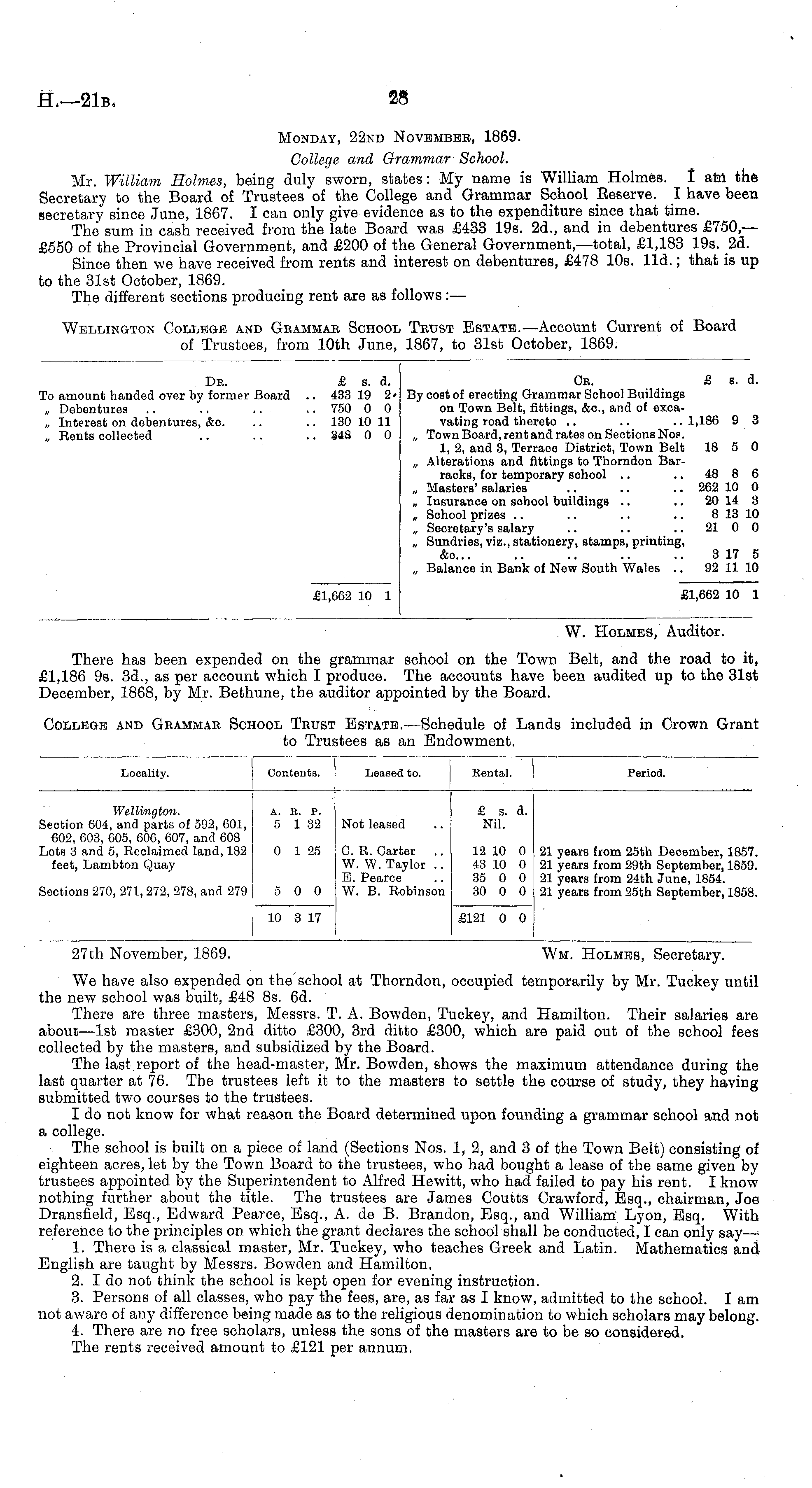 27th November, 1869. Wμ. Holmes, Secretary. We have also expended on the school at Thorndon, occupied temporarily by Mr. Tuckey until the new school was built, £48 Bs. 6d. There are three masters, Messrs. T. A. Bowden, Tuckey, and Hamilton. Their salaries are about —Ist master £300, 2nd ditto £300, 3rd ditto £300, which are paid out of the school fees collected by the masters, and subsidized by the Board. The last report of the head-master, Mr. Bowden, shows the maximum attendance during the last quarter at 76. The trustees left it to the masters to settle the course of study, they having submitted two courses to the trustees. I do not know for what reason the Board determined upon founding a grammar school and not a college. . The school is built on a piece of land (Sections Nos. 1, 2, and 3 of the Town Belt) consisting of eighteen acres, let by the Town Board to the trustees, who had bought a lease of the same given by trustees appointed by the Superintendent to Alfred Hewitt, who had failed to pay his rent. I know nothing further about the title. The trustees are James Coutts Crawford, Esq., chairman, Joe Dransfield, Esq., Edward Pearce, Esq., A. de B. Brandon, Esq., and William Lyon, Esq. With reference to the principles on which the grant declares the school shall be conducted, I can only say —■ 1. There is a classical master, Mr. Tuckey, who teaches Greek and Latin. Mathematics and English are taught by Messrs. Bowden and Hamilton. 2. I do not think the school is kept open for evening instruction. 3. Persons of all classes, who pay the fees, are, as far as I know, admitted to the school. lam not aware of any difference being made as to the religious denomination to which scholars may belong. 4. There are no free scholars, unless the sons of the masters are to be so considered. The rents received amount to £121 per annum.