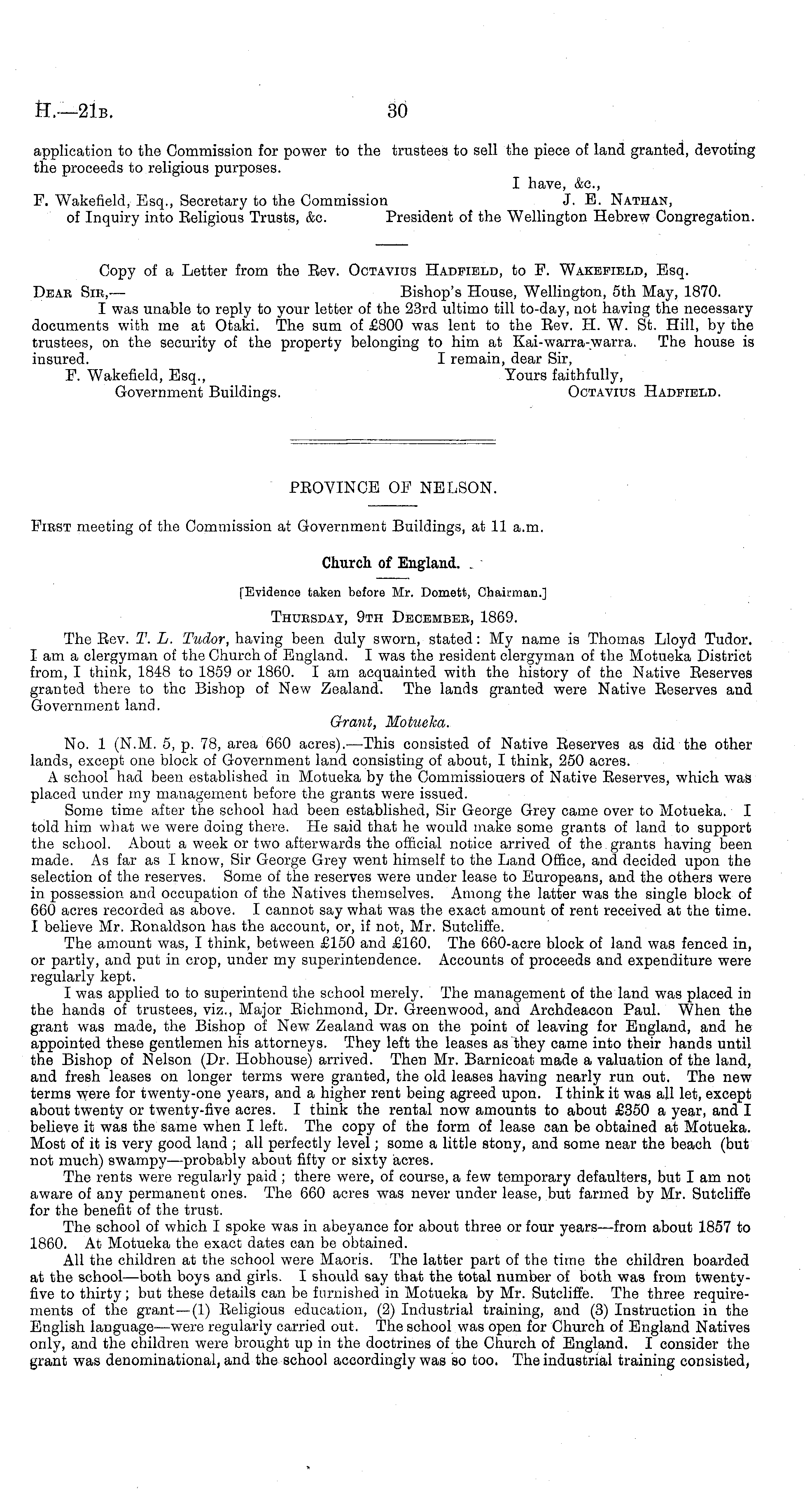 [Evidence taken before Mr. Domett, Chairman.] Thursday, 9th December, 1869. The Eev. T. L. Tudor, having been duly sworn, stated: My name is Thomas Lloyd Tudor. lam a clergyman of the Church of England. I was the resident clergyman of the Motueka District from, I think, 1848 to 1859 or 1860. I am acquainted with the history of the Native Eeserves granted there to the Bishop of New Zealand. The lands granted were Native Eeserves and Government land. Grant, Motueka. No. 1 (N.M. 5, p. 78, area 660 acres). —This consisted of Native Eeserves as did the other lands, except one block of Government land consisting of about, I think, 250 acres. A school had been established in Motueka by the Commissiouers of Native Eeserves, which was placed under my management before the grants were issued. Some time after the school had been established, Sir George Grey came over to Motueka. I told him what we were doing there. He said that he would make some grants of land to support the school. About a week or two afterwards the official notice arrived of the. grants having been made. As far as I know, Sir George Grey went himself to the Land Office, and decided upon the selection of the reserves. Some of the reserves were under lease to Europeans, and the others were in possession and occupation of the Natives themselves. Among the latter was the single block of 660 acres recorded as above. I cannot say what was the exact amount of rent received at the time. I believe Mr. Eonaldson has the account, or, if not, Mr. Sutcliffe. The amount was, I think, between £150 and £160. The 660-acre block of land was fenced in, or partly, and put in crop, under my superintendence. Accounts of proceeds and expenditure were regularly kept. I was applied to to superintend the school merely. The management of the land was placed in the hands of trustees, viz., Major Richmond, Dr. Greenwood, and Archdeacon Paul. When the grant was made, the Bishop of New Zealand was on the point of leaving for England, and he appointed these gentlemen his attorneys. They left the leases as they came into their hands until the Bishop of Nelson (Dr. Hobhouse) arrived. Then Mr. Barnicoat made a valuation of the land, and fresh leases on longer terms were granted, the old leases having nearly run out. The new terms were for twenty-one years, and a higher rent being agreed upon. I think it was all let, except about twenty or twenty-five acres. I think the rental now amounts to about £350 a year, and I believe it was the same when I left. The copy of the form of lease can be obtained at Motueka. Most of it is very good land ; all perfectly level; some a little stony, and some near the beach (but not much) swampy —probably about fifty or sixty acres. The rents were regularly paid ; there were, of course, a few temporary defaulters, but I am not aware of any permanent ones. The 660 acres was never under lease, but farmed by Mr. Sutcliffe for the benefit of the trust. The school of which I spoke was in abeyance for about three or four years—from about 1857 to 1860. At Motueka the exact dates can be obtained. All the children at the school were Maoris. The latter part of the time the children boarded at the school —both boys and girls. I should say that the total number of both was from twentyfive to thirty; but these details can be furnished in Motueka by Mr. Sutcliffe. The three requirements of the grant—(l) Eeligious education, (2) Industrial training, and (3) Instruction in the English language—were regularly carried out. The school was open for Church of England Natives only, and the children were brought up in the doctrines of the Church of England. I consider the grant was denominational, and the school accordingly was so too. The industrial training consisted,