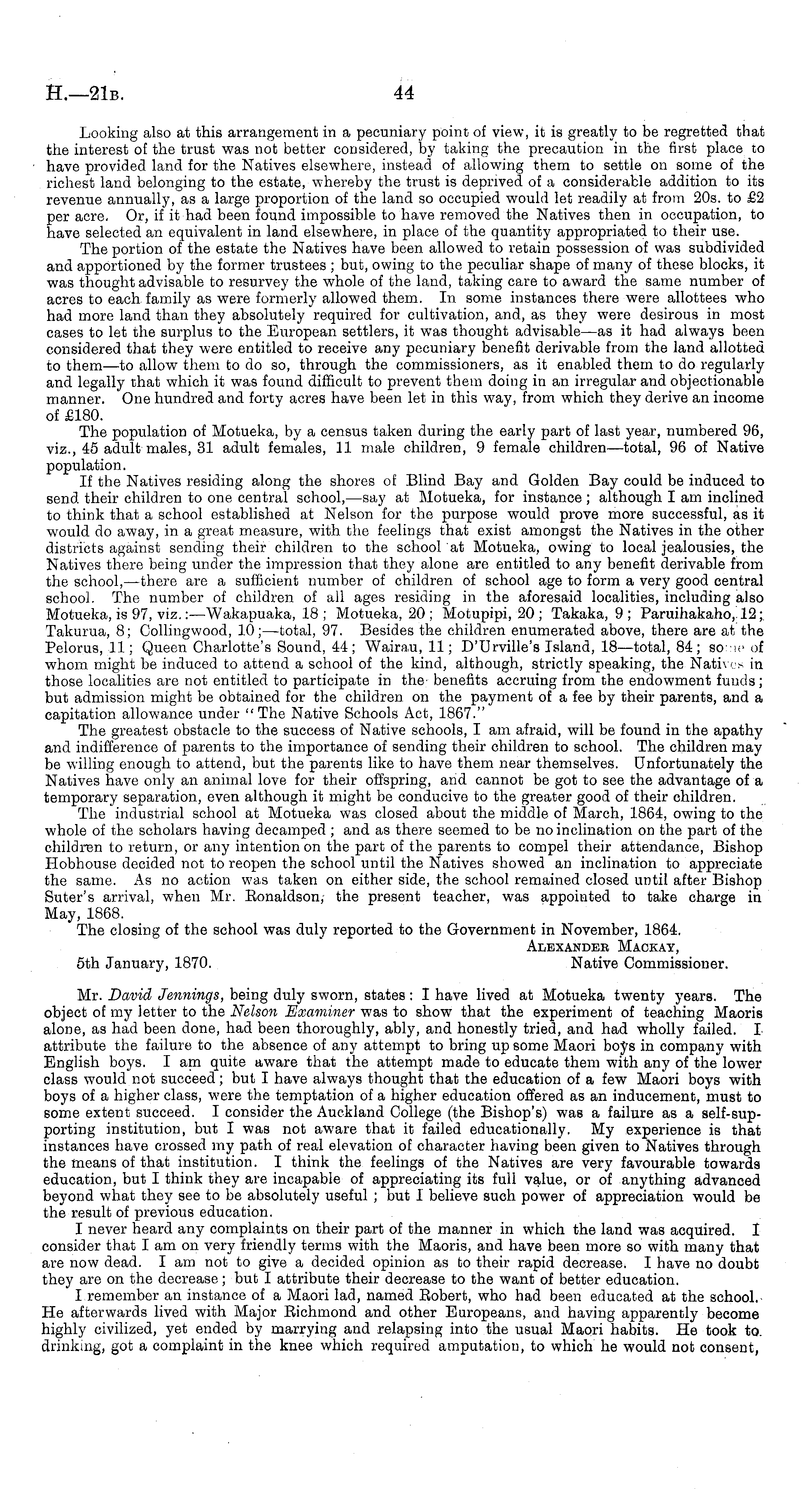 Looking also at this arrangement in a pecuniary point of view, it is greatly to be regretted that the interest of the trust was not better considered, by taking the precaution in the first place to have provided land for the Natives elsewhere, instead of allowing them to settle on some of the richest land belonging to the estate, whereby the trust is deprived of a considerable addition to its revenue annually, as a large proportion of the land so occupied would let readily at from 20s. to £2 per acre. Or, if it had been found impossible to have removed the Natives then in occupation, to have selected an equivalent in land elsewhere, in place of the quantity appropriated to their use. The portion of the estate the Natives have been allowed to retain possession of was subdivided and apportioned by the former trustees ; but, owing to the peculiar shape of many of these blocks, it was thought advisable to resurvey the whole of the land, taking care to award the same number of acres to each family as were formerly allowed them. In some instances there were allottees who had more land than they absolutely required for cultivation, and, as they were desirous in most cases to let the surplus to the European settlers, it was thought advisable—as it had always been considered that they were entitled to receive any pecuniary benefit derivable from the land allotted to them—to allow them to do so, through the commissioners, as it enabled them to do regularly and legally that which it was found difficult to prevent them doing in an irregular and objectionable manner. One hundred and forty acres have been let in this way, from which they derive an income of £180. The population of Motueka, by a census taken during the early part of last year, numbered 96, viz., 45 adult males, 31 adult females, 11 male children, 9 female children—total, 96 of Native population. If the Natives residing along the shores of Blind Bay and Golden Bay could be induced to send their children to one central school, —say at Motueka, for instance ; although I am inclined to think that a school established at Nelson for the purpose would prove more successful, as it would do away, in a great measure, with the feelings that exist amongst the Natives in the other districts against sending their children to the school at Motueka, owing to local jealousies, the Natives there being under the impression that they alone are entitled to any benefit derivable from the school, —there are a sufficient number of children of school age to form a very good central school. The number of children of all ages residing in the aforesaid localities, including also Motueka, is 97, viz.: —Wakapuaka, 18 ; Motueka, 20 ; Motupipi, 20 ; Takaka, 9 ; Paruihakaho, 12; Takurua, 8; Collingwood, 10; —total, 97. Besides the children enumerated above, there are at the Pelorus, 11; Queen Charlotte's Sound, 44; Wairau, 11; D'Urville's Island, 18—total, 84; so :ie of whom might be induced to attend a school of the kind, although, strictly speaking, the Natives in those localities are not entitled to participate in the benefits accruing from the endowment funds; but admission might be obtained for the children on the payment of a fee by their parents, and a capitation allowance under "The Native Schools Act, 1867." The greatest obstacle to the success of Native schools, I am afraid, will be found in the apathy and indifference of parents to the importance of sending their children to school. The children may be willing enough to attend, but the parents like to have them near themselves. Unfortunately the Natives have only an animal love for their offspring, and cannot be got to see the advantage of a temporary separation, even although it might be conducive to the greater good of their children. The industrial school at Motueka was closed about the middle of March, 1864, owing to the whole of the scholars having decamped ; and as there seemed to be no inclination on the part of the children to return, or any intention on the part of the parents to compel their attendance, Bishop Hobhouse decided not to reopen the school until the Natives showed an inclination to appreciate the same. As no action was taken on either side, the school remained closed until after Bishop Suter's arrival, when Mr. Eonaldson, the present teacher, was appointed to take charge in May, 1868. The closing of the school was duly reported to the Government in November, 1864. Alexander Mackay, sth January, 1870. Native Commissioner. Mr. David Jennings, being duly sworn, states: I have lived at Motueka twenty years. The object of my letter to the Nelson Examiner was to show that the experiment of teaching Maoris alone, as had been done, had been thoroughly, ably, and honestly tried, and had wholly failed. I attribute the failure to the absence of any attempt to bring up some Maori boys in company with English boys. I am quite aware that the attempt made to educate them with any of the lower class would not succeed; but I have always thought that the education of a few Maori boys with boys of a higher class, were the temptation of a higher education offered as an inducement, must to some extent succeed. I consider the Auckland College (the Bishop's) was a failure as a self-sup-porting institution, but I was not aware that it failed educationally. My experience is that instances have crossed my path of real elevation of character having been given to Natives through the means of that institution. I think the feelings of the Natives are very favourable towards education, but I think they are incapable of appreciating its full value, or of anything advanced beyond what they see to be absolutely useful ; but I believe such power of appreciation would be the result of previous education. I never heard any complaints on their part of the manner in which the land was acquired. I consider that I am on very friendly terms with the Maoris, and have been more so with many that are now dead. I