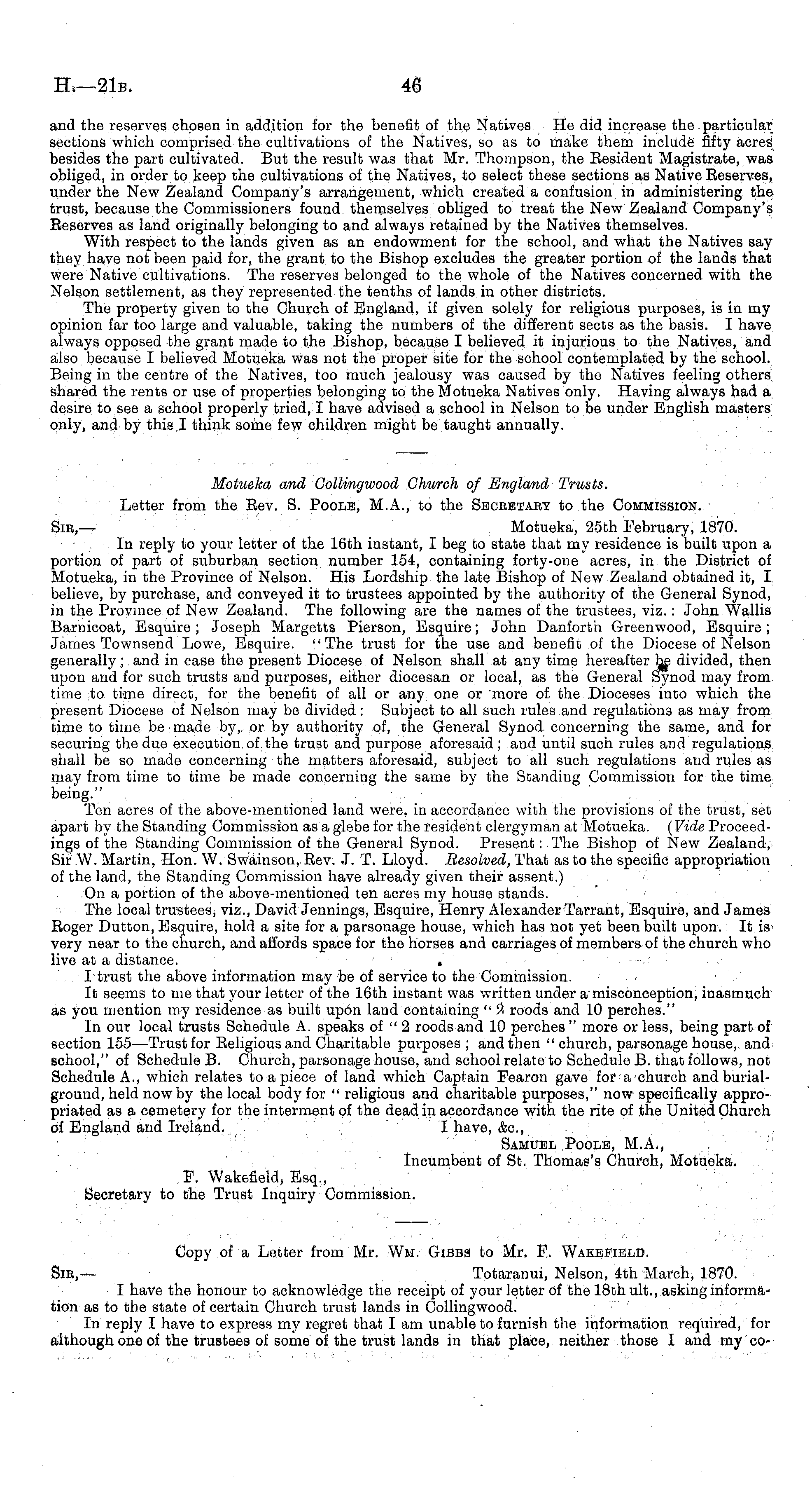 Copy of a Letter from Mr. Wμ. Gibbb to Mr. F. Wakefield. Sir,— Totaranui, Nelson, 4th March, 1870. I have the honour to acknowledge the receipt of your letter of the 18th ult., asking information as to the state of certain Church trust lands in Collingwood. In reply I have to express my regret that I am unable to furnish the information required, for although one of the trustees of some of the trust lands in that place, neither those I and my co-