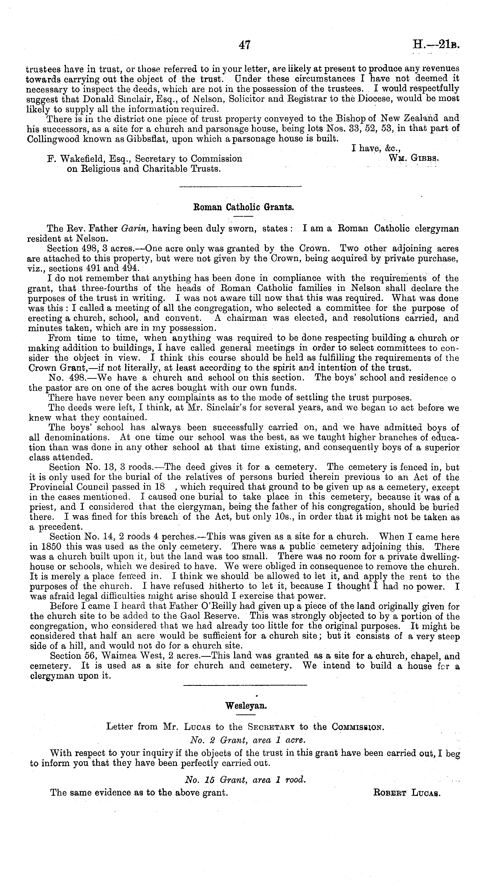The Rev. Father Garin, having been duly sworn, states : lam a Eoman Catholic clergyman resident at Nelson. Section 498, 3 acres.—One acre only was granted by the Crown. Two other adjoining acres are attached to this property, but were not given by the Crown, being acquired by private purchase, viz., sections 491 and 494. I do not remember that anything has been done in compliance with the requirements of the grant, that three-fourths of the heads of Eoman Catholic families in Nelson shall declare the purposes of the trust in writing. I was not aware till now that this was required. What was done was this : I called a meeting of all the congregation, who selected a committee for the purpose of erecting a church, school, and convent. A chairman was elected, and resolutions carried, and minutes taken, which are in my possession. From time to time, when anything was required to be done respecting building a church or making addition to buildings, I have called general meetings in order to select committees to consider the object in view. I think this course should be held as fulfilling the requirements of the Crown Grant, —if not literally, at least according to the spirit and intention of the trust. No. 498. —We have a church and school on this section. The boys' school and residence o the pastor are on one of the acres bought with our own funds. There have never been any complaints as to the mode of settling the trust purposes. The deeds were left, I think, at Mr. Sinclair's for several years, and we began to act before we knew what they contained. The boys' school has always been successfully carried on, and we have admitted boys of all denominations. At one time our school was the best, as we taught higher branches of education than was done in any other school at that time existing, and consequently boys of a superior class attended. Section No. 13, 3 roods.—The deed gives it for a cemetery. The cemetery is fenced in, but it is only used for the burial of the relatives of persons buried therein previous to an Act of the Provincial Council passed in 18 , which required that ground to be given up as a cemetery, except in the cases mentioned. I caused one burial to take place in this cemetery, because it was of a priest, and I considered that the clergyman, being the father of his congregation, should be buried there. I was fined for this breach of the Act, but only 10s., in order that it might not be taken as a precedent. Section No. 14, 2 roods 4 perches.—This was given as a site for a church. When I came here in 1850 this was used as the only cemetery. There was a public cemetery adjoining this. There was a church built upon it, but the land was too small. There was no room for a private dwellinghouse or schools, which we desired to have. We were obliged in consequence to remove the church. It is merely a place fenced in. I think we should be allowed to let it, and apply the rent to the purposes of the church. I have refused hitherto to let it, because I thought I had no power. I was afraid legal difficulties might arise should I exercise that power. Before I came I heard that Father O'Reilly had given up a piece of the land originally given for the church site to be added to the Gaol Reserve. This was strongly objected to by a portion of the congregation, who considered that we had already too little for the original purposes. It might be considered that half an acre would be sufficient for a church site; but it consists of a very steep side of a hill, and would not do for a church site. Section 56, Waimea West, 2 acres.—This land was granted as a site for a church, chapel, and cemetery. It is used as a site for church and cemetery. We intend to build a house for a clergyman upon it.