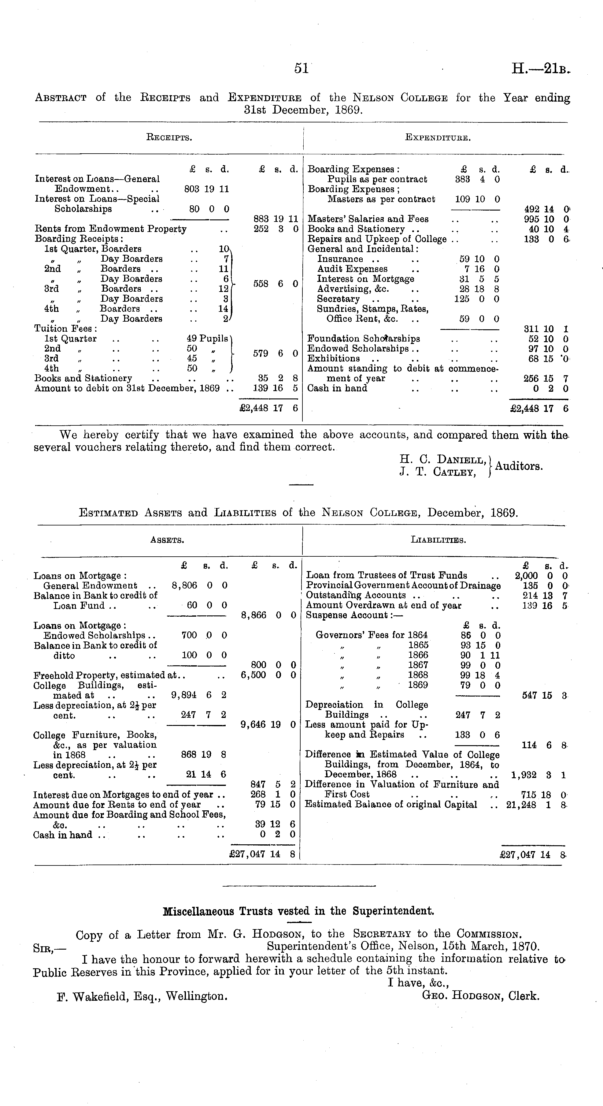 Estimated Assets and Liabilities of the Nelson College, December, 1869.