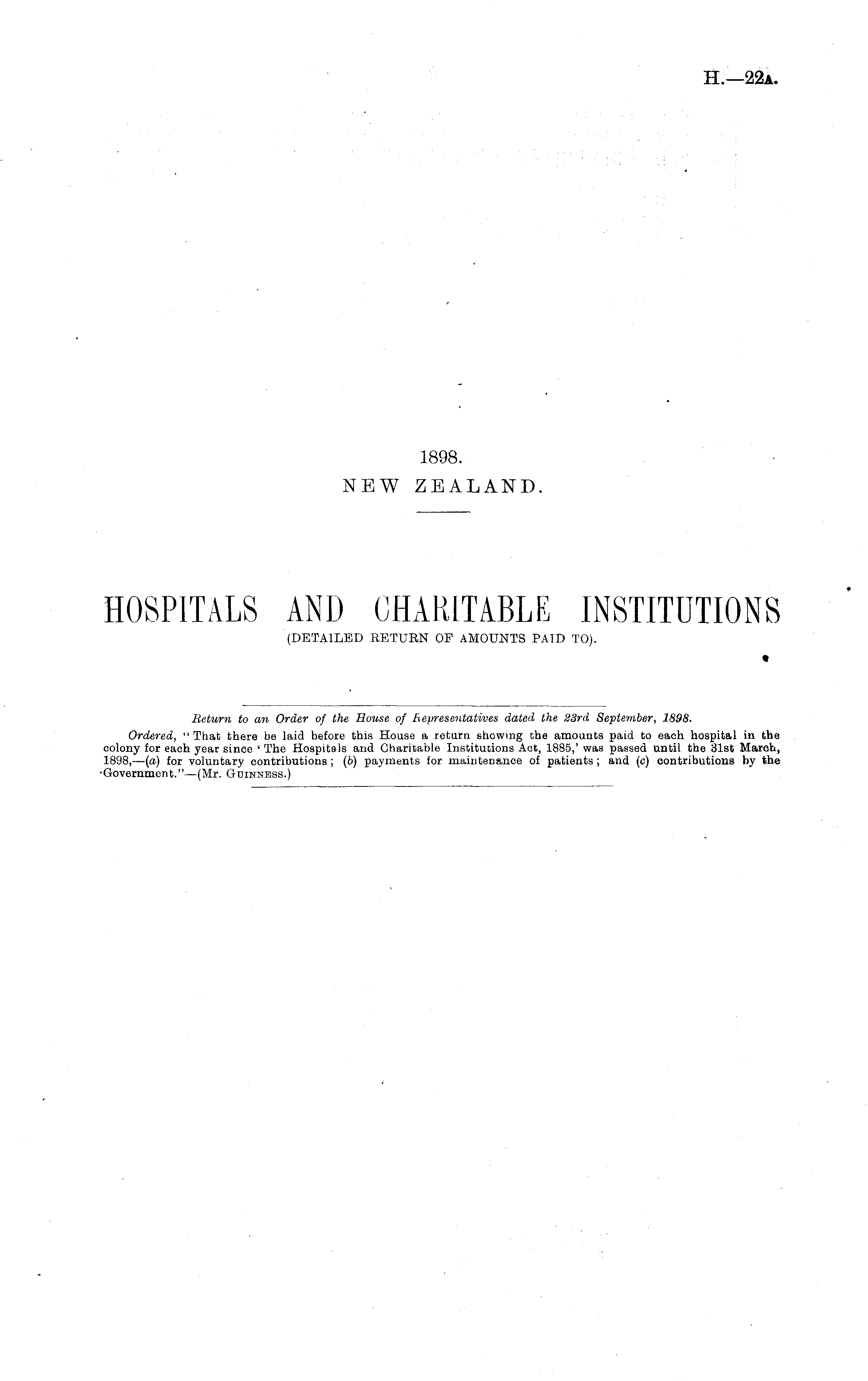 Return to an Order of the House of Representatives dated the 23rd September, 1898. Ordered, " That there be laid before this House a return showing the amouuts paid to each hospital in the colony for each year since ' The Hospitals and Charitable Institutions Act, 1885,' was passed until the 81st March, 1898, — (a) for voluntary contributions ; (b) payments for maintenance of patients ; and (c) contributions by the Government."—(Mr. Guinness.)