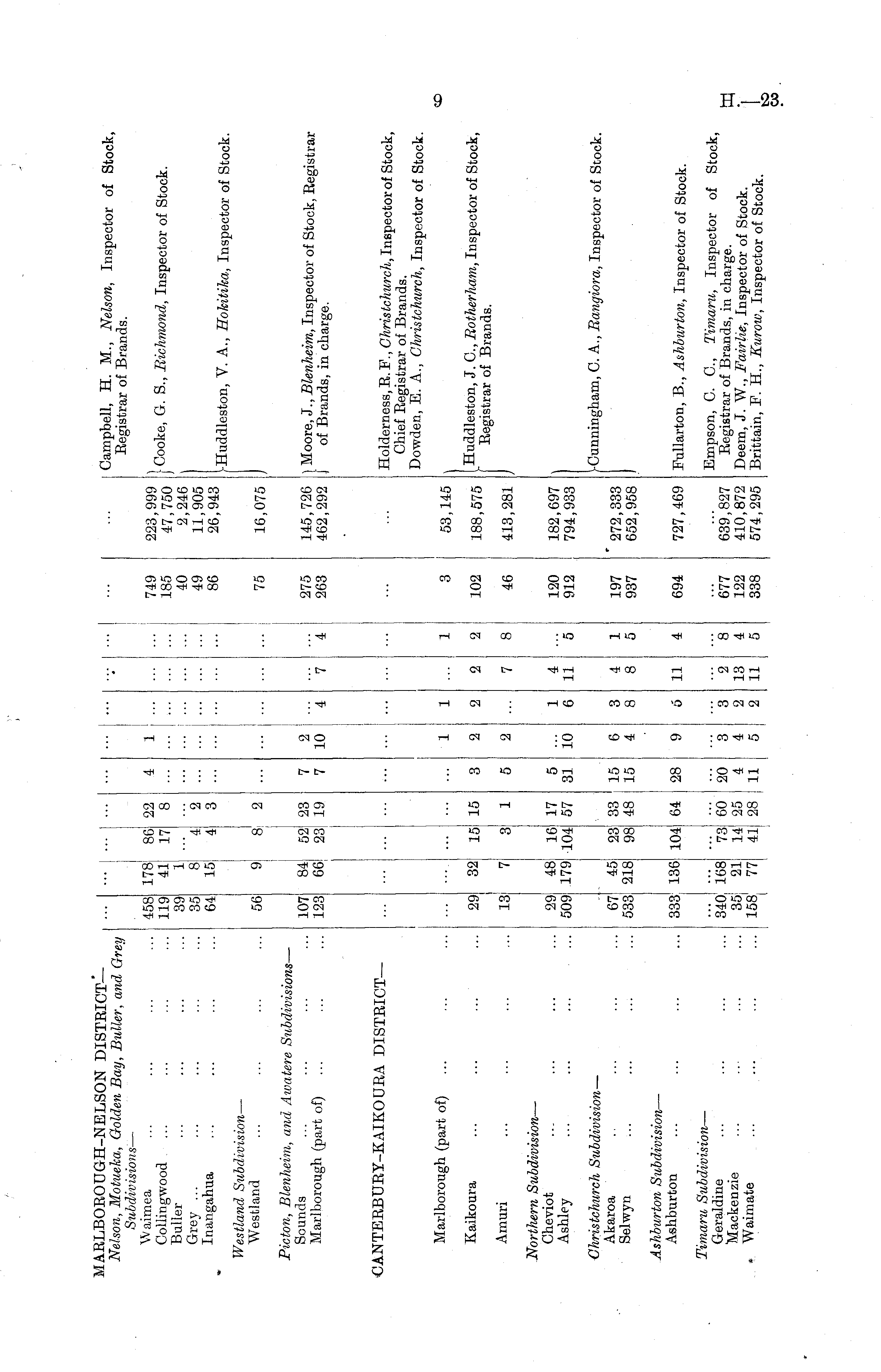 MAELBOEOUGH-NELSON DISTBICT— Nelson, Motueka, Golden Bay, Buller, and Grey Subdivisions- — Waimea Collingwood ... Buller Grey ... Inangahua 458 119 39 35 64 178 41 8 15 86 17 22 8 4 1 ... 749 185 40 49 86 223,999 47,750 2,246 11,905 26,943 Campbell, H. M., Nelson, Inspector of Stock, Eegistrar of Brands. jCooke, G. S., Bichrnond, Inspector of Stock. 4 4 2 3 -Huddleston, V. A., Hokitika, Inspector of Stock. * Westland Subdivision — Westland 75 16,075 561 Picton, Blenheim, and Awatere Subdivisions — Sounds Marlborough (part of) 107 123 84 66 52 23 23 19 7 7 2 10 4 7 4 275 263 145,726 462, 292 1 Moore, J., Blenheim, Inspector of Stock, Eegistrar I of Brands, in charge. €ANTEBBUBY-KAIKOUEA DISTEICT— Holderness.B.F., Christchurch, Inspector of Stock, Chief Eegistrar of Brands. Dowden, E. A., Christchurch, Inspector of Stock. Marlborough (part of) 3 53,145 Kaikoura 29 32 15 15 3 1 2 1 2 2 1 2 102 188,575 I Huddleston, J. C, Botherham, Inspector of Stock, J Eegistrar of Brands. Amuri 131 7 3 1 5 2 7 8 46 413,281 Northern Subdivision — Cheviot Ashley 29 509 48 179 16 104 17 57 5 31 1 6 4 11 120 912 182,697 794,933 10 5 [-Cunningham, C. A., Bangiora, Inspector of Stock. Christchurch Subdivision — Akaroa Selwyn 67 533 45 218 23 98 33 48 15 15 6 4 3 8 4 8 1 5 197 937 r 272,333 652, 958 Ashburton Subdivision — Ashburton 136 9 694 727,469 Fullarton, B., Ashburton, Inspector of Stock. 333: 104 64 23 6 11 4 Timaru Subdivision — Geraldine Mackenzie Waimate 340 35 158 168 21 77 73 14 41 60 25 28 20 11 8 4 5 3 2 2 2 13 11 8 4 5 677 122 338 639,827 410,872 574,295 Empson, C. C, Timaru, Inspector of Stock, Eegistrar of Brands, in charge. Deem, J. W., Fairlie, Inspector of Stock. Brittain, P. H., Kurow, Inspector of Stock.