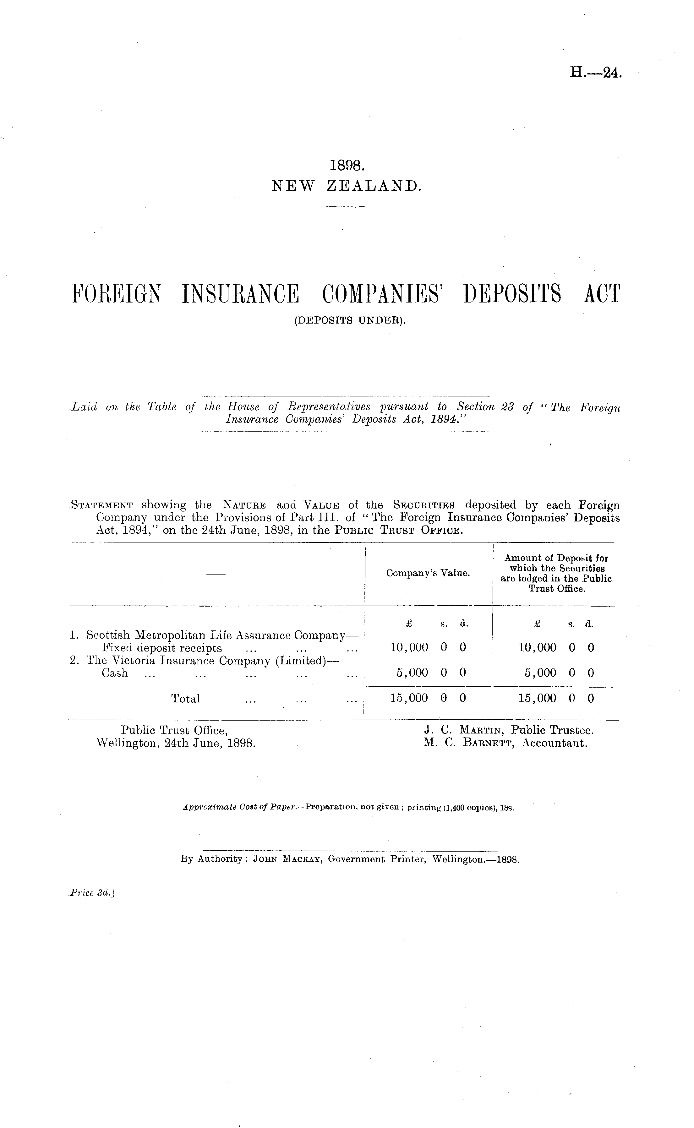 Public Trust Office, J. C. Martin, Public Trustee. Wellington, 24th June, 1898. M. C. Barnett, Accountant.