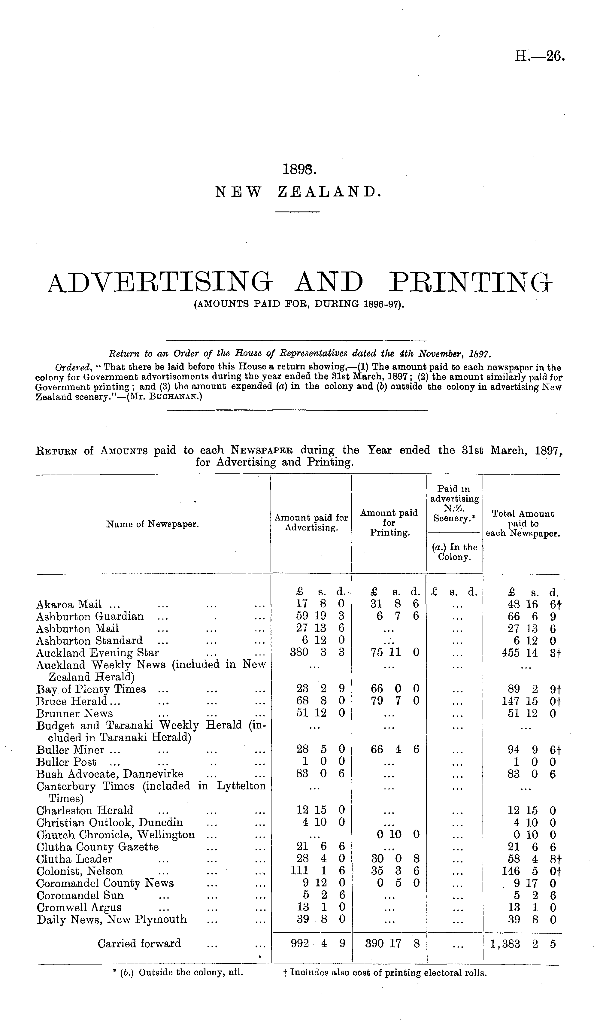 Return to an Order of the House of Representatives dated the 4th November, 1897. Ordered, " That there be laid before this House a return showing,—(l) The amount paid to each newspaper in the colony for Government advertisements during the year ended the 31st March, 1897 ; (2) the amount similarly paid for Government printing ; and (3) the amount expended (a) in the colony and (6) outside the colony in advertising New Zealand scenery."—(Mr. Buchanan.)