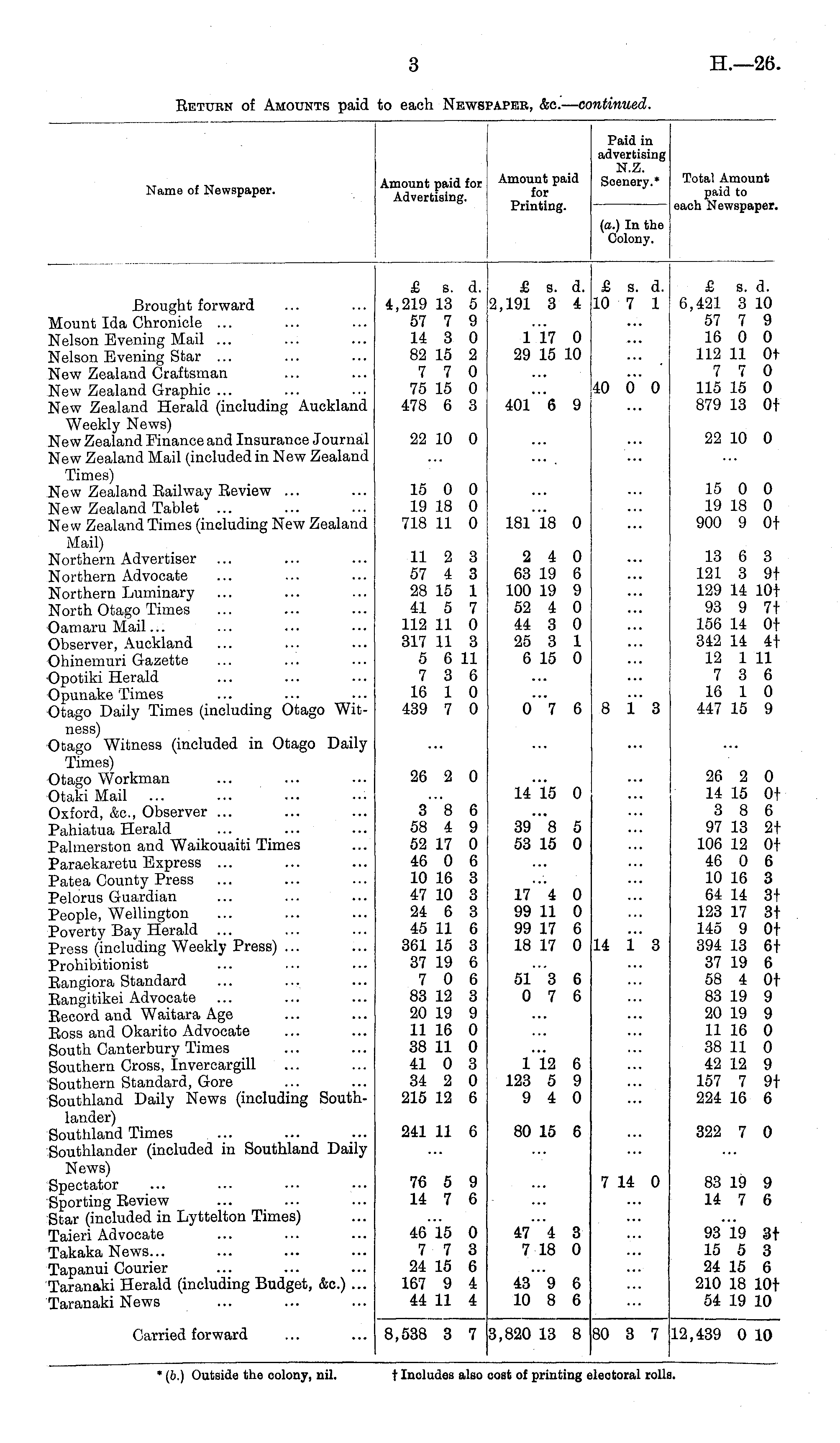 Paid in advertising N.Z. Soenery.* Name of Newspaper. Amount paid for Advertising. Amount paid for Printing. Total Amount paid to ach Newspaper. (a.) In the Colony. Brought forward Mount Ida Chronicle ... Nelson Evening Mail ... Nelson Evening Star ... New Zealand Craftsman New Zealand Graphic ... New Zealand Herald (including Auckland Weekly News) New Zealand Finance and Insurance Journal New Zealand Mail (included in New Zealand Times) New Zealand Eailway Eeview ... New Zealand Tablet ... New Zealand Times (including New Zealand Mail) Northern Advertiser Northern Advocate Northern Luminary North Otago Times Oamaru Mail... Observer, Auckland Ohinemuri Gazette •Opotiki Herald Opunake Times Otago Daily Times (including Otago Witness) Otago Witness (included in Otago Daily Times) Otago Workman Otaki Mail ... Oxford, &c, Observer ... Pahiatua Herald Palmerston and Waikouaiti Times Paraekaretu Express ... Patea County Press Pelorus Guardian People, Wellington Poverty Bay Herald ... Press (including Weekly Press) ... Prohibitionist Bangiora Standard Bangitikei Advocate Eecord and Waitara Age Boss and Okarito Advocate South Canterbury Times Southern Cross, Invercargill Southern Standard, Gore Southland Daily News (including Southlander) Southland Times ... Southlander (included in Southland Daily News) Spectator Sporting Eeview Star (included in Lyttelton Times) Taieri Advocate Takaka News... Tapanui Courier Taranaki Herald (including Budget, &c.) ... Taranaki News £ s. d. 4,219 13 5 57 7 9 14 3 0 82 15 2 7 7 0 75 15 0 478 6 3 £ s. d. 2,191 3 4 £ s. d. 10 7 1 £ s. d. 6,421 3 10 57 7 9 16 0 0 112 11 Ot 7 7 0 115 15 0 879 13 0t 117 0 29 15 10 40l'"6 9 40 6 0 22 10 0 22 10 0 15 0 0 19 18 0 718 11 0 18118 0 15 0 0 19 18 0 900 9 0t 11 2 3 57 4 3 28 15 1 41 5 7 112 11 0 317 11 3 5 6 11 7 3 6 16 1 0 439 7 0 2 4 0 63 19 6 100 19 9 52 4 0 44 3 0 25 3 1 6 15 0 13 6 3 121 3 9t 129 14 lOt 93 9 7t 156 14 0t 342 14 4t 12 1 11 7 3 6 16 1 0 447 15 9 o'"7 6 8 l" 3 26 2 0 14'15 0 26 2 0 14 15 0t 3 8 6 97 13 2t 106 12 0t 46 0 6 10 16 3 64 14 3t 123 17 3t 145 9 0t 394 13 6t 37 19 6 58 4 0t 83 19 9 20 19 9 11 16 0 38 11 0 42 12 9 157 7 9t 224 16 6 3 8 6 58 4 9 52 17 0 46 0 6 10 16 3 47 10 3 24 6 3 45 11 6 361 15 3 37 19 6 7 0 6 83 12 3 20 19 9 11 16 0 38 11 0 41 0 3 34 2 0 215 12 6 39" *8 5 53 15 0 17 4 0 99 11 0 99 17 6 18 17 0 14 l" 3 51 3 6 0 7 6 1 12 6 123 5 9 9 4 0 241 11 6 80 15 6 322 7 0 76 5 9 14 7 6 7 14 0 83 19 9 14 7 6 46 15 0 7 7 3 24 15 6 167 9 4 44 11 4 47 4 3 7 18 0 93 19 3t 15 5 3 24 15 6 210 18 10t 54 19 10 43 9 6 10 8 6 Carried forward 8,538 3 7 3,820 13 8 80 3 7 12,439 0 10 lb. Outside the colony, nil. t Includes also cost of printing electoral rolls.