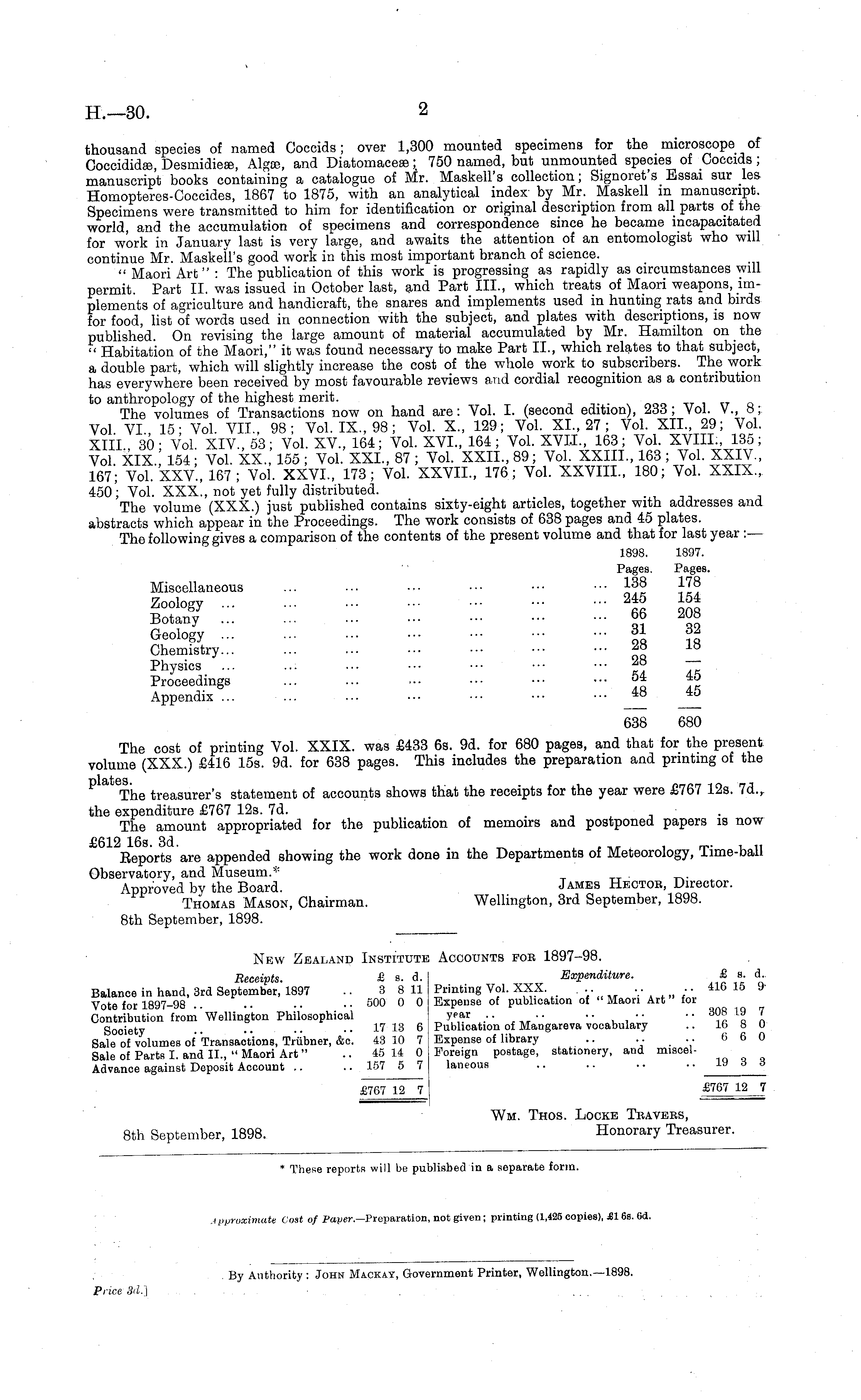 thousand species of named Coccids; over 1,300 mounted specimens for the microscope of Coccididee Desmidieae, Algce, and Diatomaceas; 750 named, but unmounted species of Coccids; manuscript books containing a catalogue of Mr. Maskell's collection; Signoret's Essai sur lea Homopteres-Coccides, 1867 to 1875, with an analytical index by Mr. Maskell in manuscript. Specimens were transmitted to him for identification or original description from all parts of the world, and the accumulation of specimens and correspondence since he became incapacitated for work in January last is very large, and awaits the attention of an entomologist who will continue Mr. Maskell's good work in this most important branch of science. " Maori Art": The publication of this work is progressing as rapidly as circumstances will permit. Part 11. was issued in October last, and Part 111., which treats of Maori weapons, implements of agriculture and handicraft, the snares and implements used in hunting rats and birds for food, list of words used in connection with the subject, and plates with descriptions, is now published. On revising the large amount of material accumulated by Mr. Hamilton on the " Habitation of the Maori," it was found necessary to make Part 11., which relates to that subject, a double part, which will slightly increase the cost of the whole work to subscribers. The work has everywhere been received by most favourable reviews and cordial recognition as a contribution to anthropology of the highest merit. The volumes of Transactions now on hand are: Vol. I. (second edition), 233; Vol. V., 8;. Vol VI 15- Vol. VII., 98; Vol. IX., 98; Vol. X., 129; Vol. XL, 27; Vol. XII., 29; Vol. XIII 30- Vol XIV., 53; Vol. XV., 164; Vol. XVI., 164; Vol. XVII., 163; Vol. XVIII., 135; Vol XIX ' 154 • Vol. XX., 155 ; Vol. XXL, 87 ; Vol. XXII., 89 ; Vol. XXIII., 163 ; Vol. XXIV., 167; Vol.'xXV., 167; Vol. XXVI., 173; Vol. XXVII., 176; Vol. XXVIII., 180; Vol. XXIX., 450; Vol. XXX., not yet fully distributed. The volume (XXX.) just published contains sixty-eight articles, together with addresses and abstracts which appear in the Proceedings. The work consists of 638 pages and 45 plates. The following gives a comparison of the contents of the present volume and that for last year : —