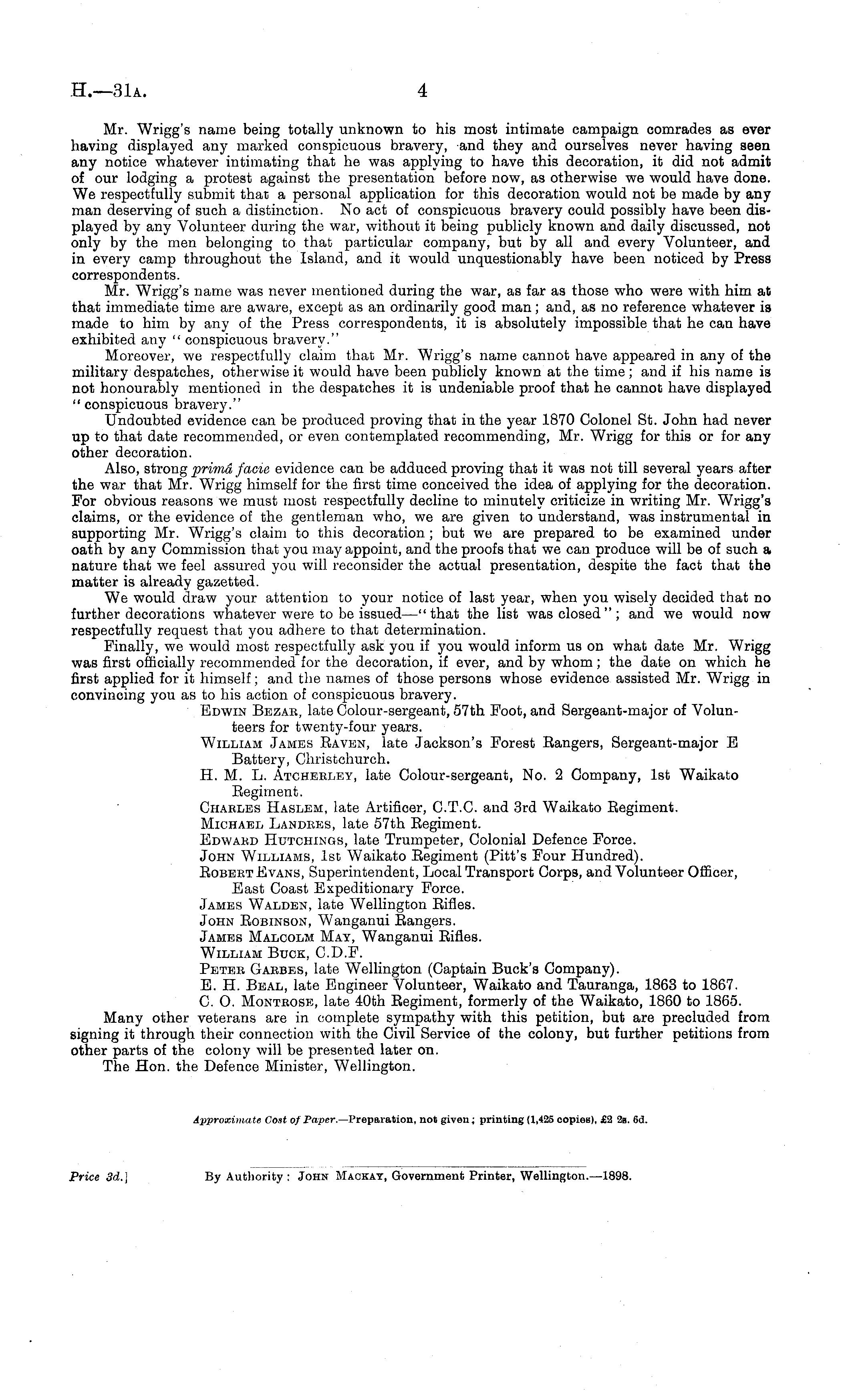 Mr. Wrigg's name being totally unknown to his most intimate campaign comrades as ever having displayed any marked conspicuous bravery, and they and ourselves never having seen any notice whatever intimating that he was applying to have this decoration, it did not admit of our lodging a protest against the presentation before now, as otherwise we would have done. We respectfully submit that a personal application for this decoration would not be made by any man deserving of such a distinction. No act of conspicuous bravery could possibly have been displayed by any Volunteer during the war, without it being publicly known and daily discussed, not only by the men belonging to that particular company, but by all and every Volunteer, and in every camp throughout the Island, and it would unquestionably have been noticed by Press correspondents. Mr. Wrigg's name was never mentioned during the war, as far as those who were with him at that immediate time are aware, except as an ordinarily good man; and, as no reference whatever is made to him by any of the Press correspondents, it is absolutely impossible that he can have exhibited any " conspicuous bravery." Moreover, we respectfully claim that Mr. Wrigg's name cannot have appeared in any of the military despatches, otherwise it would have been publicly known at the time; and if his name is not honourably mentioned in the despatches it is undeniable proof that he cannot have displayed "conspicuous bravery." Undoubted evidence can be produced proving that in the year 1870 Colonel St. John had never up to that date recommended, or even contemplated recommending, Mr. Wrigg for this or for any other decoration. Also, strong prima facie evidence can be adduced proving that it was not till several years after the war that Mr. Wrigg himself for the first time conceived the idea of applying for the decoration. For obvious reasons we must most respectfully decline to minutely criticize in writing Mr. Wrigg's claims, or the evidence of the gentleman who, we are given to understand, was instrumental in supporting Mr. Wrigg's claim to this decoration; but we are prepared to be examined under oath by any Commission that you may appoint, and the proofs that we can produce will be of such a nature that we feel assured you will reconsider the actual presentation, despite the fact that the matter is already gazetted. We would draw your attention to your notice of last year, when you wisely decided that no further decorations whatever were to be issued—"that the list was closed"; and we would now respectfully request that you adhere to that determination. Finally, we would most respectfully ask you if you would inform us on what date Mr. Wrigg was first officially recommended for the decoration, if ever, and by whom; the date on which he first applied for it himself; and the names of those persons whose evidence assisted Mr. Wrigg in convincing you as to his action of conspicuous bravery. Edwin Bbzab, late Colour-sergeant, 57th Foot, and Sergeant-major of Volunteers for twenty-four years. William James Eaven, late Jackson's Forest Rangers, Sergeant-major B Battery, Christchurch. H. M. L. Atchebley, late Colour-sergeant, No. 2 Company, Ist Waikato Eegiment. Charles Haslem, late Artificer, C.T.C. and 3rd Waikato Eegiment. Michael Landres, late 57th Eegiment. Bdwakd Hutchings, late Trumpeter, Colonial Defence Force. John Williams, Ist Waikato Eegiment (Pitt's Four Hundred). Eobert Evans, Superintendent, Local Transport Corps, and Volunteer Officer, East Coast Expeditionary Force. James Walden, late Wellington Eifles. John Eobinson, Wanganui Eangers. James Malcolm May, Wanganui Eifles. William Buck, C.D.F. Peter Garbes, late Wellington (Captain Buck's Company). E. H. Beal, late Engineer Volunteer, Waikato and Tauranga, 1863 to 1867. C. O. Montbose, late 40th Eegiment, formerly of the Waikato, 1860 to 1865. Many other veterans are in complete sympathy with this petition, but are precluded from signing it through their connection with the Civil Service of the colony, but further petitions from other parts of the colony will be presented later on. The Hon. the Defence Minister, Wellington.