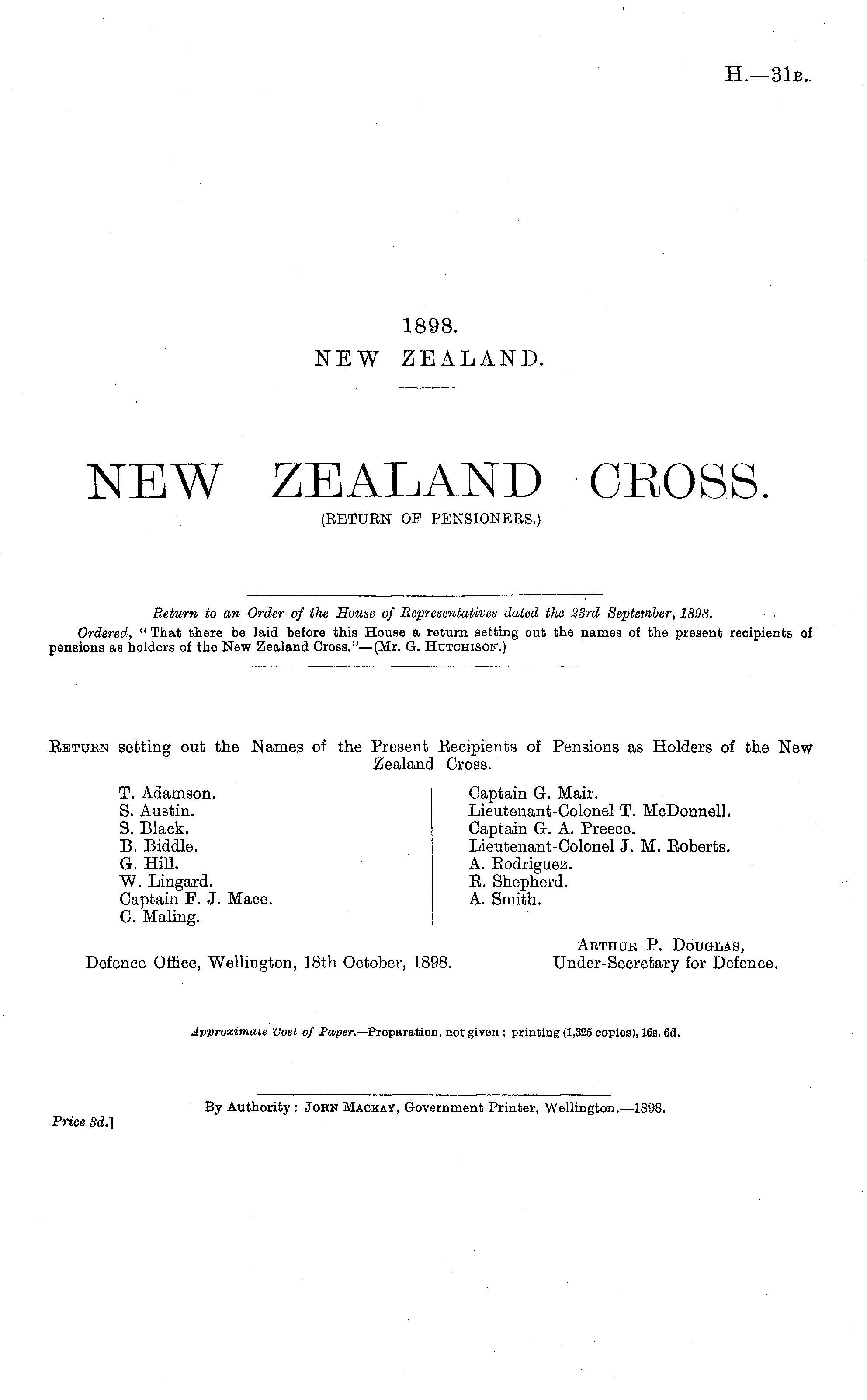Eetuen setting out the Names of the Present Eecipients of Pensions as Holders of the New Zealand Cross. T. Adamson. Captain G. Mair. S. Austin. Lieutenant-Colonel T. McDonnell. S. Black. Captain G. A. Preece. B. Biddle. Lieutenant-Colonel J. M. Eoberts. G. Hill. A. Eodriguez. W. Lingard. E. Shepherd. Captain F. J. Mace. A. Smith. C. Maling. Aethue P. Douglas, Defence Office, Wellington, 18th October, 1898. Under-Secretary for Defence. Approximate Cost of Paper.—Preparation, not given ; printing (1,325 copies), 16b. 6d.