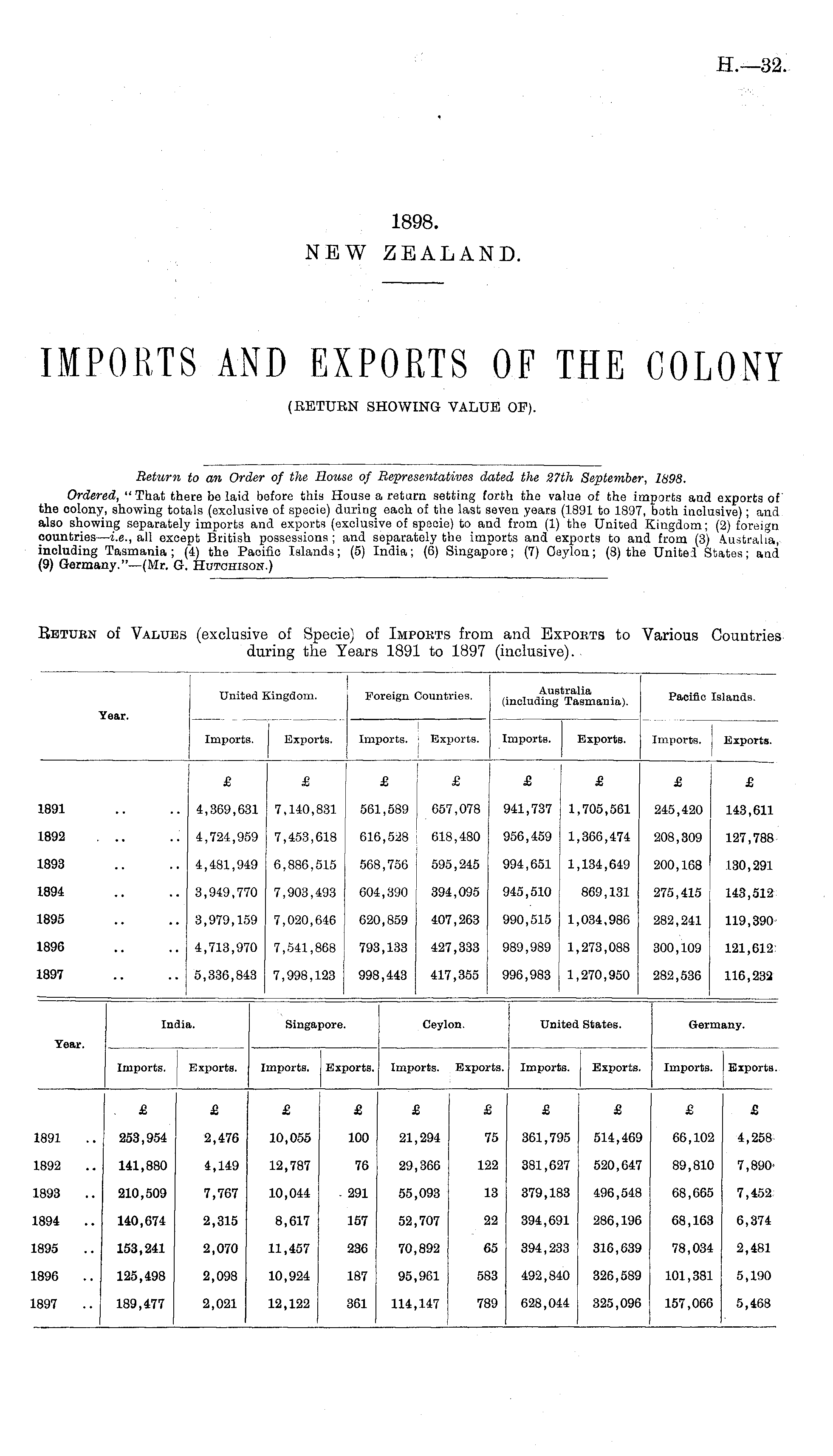 Return to an Order of the House of Representatives dated the 37th September, 1898. Ordered, " That there be laid before this House a return setting forth the value of the imports and exports of the colony, showing totals (exclusive of specie) during each of the last seven years (1891 to 1.897, both inclusive); and also showing separately imports and exports (exclusive of specie) to and from (1) the United Kingdom; (2) foreign oountries—i.e., all except British possessions; and separately the imports and exports to and from (3) Australia, including Tasmania; (4) the Pacific Islands; (5) India; (6) Singapore; (7) Oaylon; (8) the United States; and (9) Germany."—(Mr. G. Hutchison.)