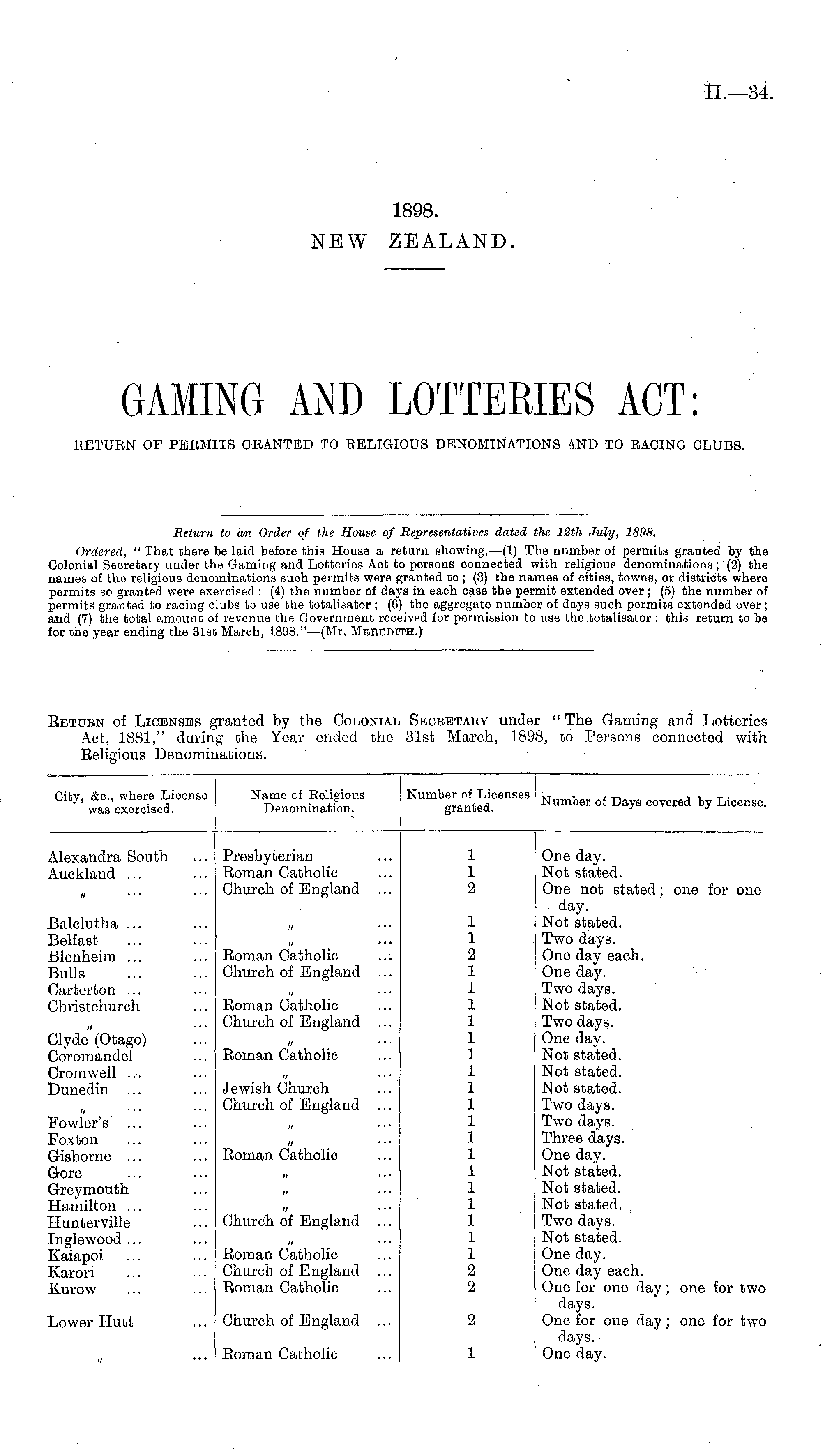 Return to an Order of the House of Representatives dated the 12th July, 1898. Ordered, " That there be laid before this House a return showing,—(l) The number of permits granted by the Colonial Secretary under the Gaming and Lotteries Act to persons oonneoted with religious denominations; (2) the names of the religious denominations such permits were granted to ; (3) the names of cities, towns, or districts where permits so granted were exercised ; (4) the number of days in each case the permit extended over ; (5) the number of permits granted to racing clubs to use the totalisator ; (6) the aggregate number of days such permits extended over; and (7) the total amount of revenue the Government received for permission to use the totalisator : this return to be for the year ending the 31st March, 1898."—(Mr. Mbbedith.)