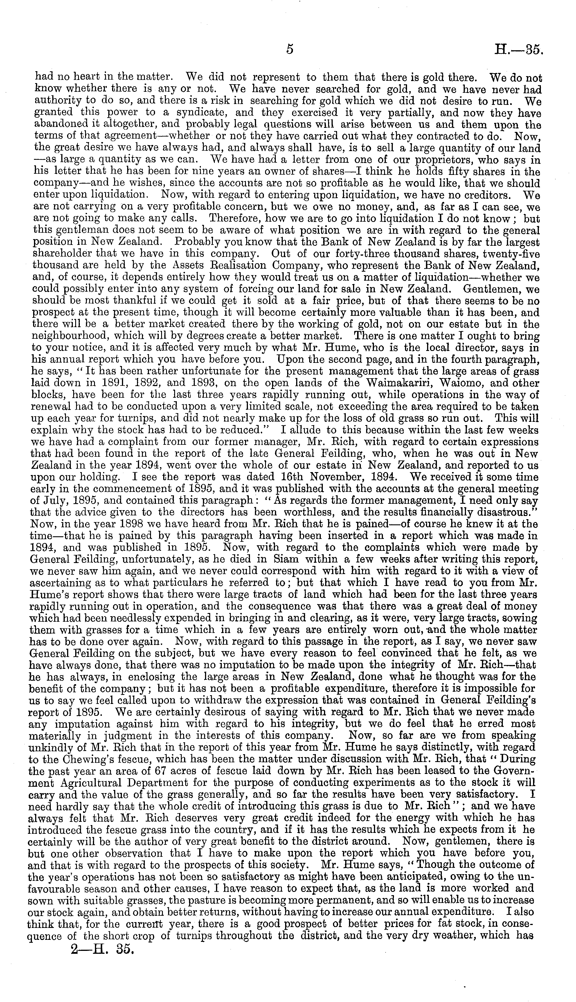 had no heart in the matter. We did not represent to them that there is gold there. We do not know whether there is any or not. We have never searched for gold, and we have never had authority to do so, and there is a risk in searching for gold which we did not desire to run. We granted this power to a syndicate, and they exercised it very partially, and now they have abandoned it altogether, and probably legal questions will arise between us and them upon the terms of that agreement—whether or not they have carried out what they contracted to do. Now, the great desire we have always had, and always shall have, is to sell a large quantity of our land —as large a quantity as we can. We have had a letter from one of our proprietors, who says in his letter that he has been for nine years an owner of shares—l think he holds fifty shares in the company—and he wishes, since the accounts are not so profitable as he would like, that we should enter upon liquidation. Now, with regard to entering upon liquidation, we have no creditors. We are not carrying on a very profitable concern, but we owe no money, and, as far as I can see, we are not going to make any calls. Therefore, how we are to go into liquidation Ido not know; but this gentleman does not seem to be aware of what position we are in with regard to the general position in New Zealand. Probably you know that the Bank of New Zealand is by far the largest shareholder that we have in this company. Out of our forty-three thousand shares, twenty-five thousand are held by the Assets Realisation Company, who represent the Bank of New Zealand, and, of course, it depends entirely how they would treat us on a matter of liquidation—whether we could possibly enter into any system of forcing our land for sale in New Zealand. Gentlemen, we should be most thankful if we could get it sold at a fair price, but of that there seems to be no prospect at the present time, though it will become certainly more valuable than it has been, and there will be a better market created there by the working of gold, not on our estate but in the neighbourhood, which will by degrees create a better market. There is one matter I ought to bring to your notice, and it is affected very much by what Mr. Hume, who is the local director, says in his annual report which you have before you. Upon the second page, and in the fourth paragraph, he says, " It has been rather unfortunate for the present management that the large areas of grass laid down in 1891, 1892, and 1893, on the open lands of the Waimakariri, Waiomo, and other blocks, have been for the last three years rapidly running out, while operations in the way of renewal had to be conducted upon a very limited scale, not exceeding the area required to be taken up each year for turnips, and did not nearly make up for the loss of old grass so run out. This will explain why the stock has had to be reduced." I allude to this because within the last few weeks we have had a complaint from our former manager, Mr. Rich, with regard to certain expressions that had been found in the report of the late General Feilding, who, when he was out in New Zealand in the year 1894, went over the whole of our estate in New Zealand, and reported to us upon our holding. I see the report was dated 16th November, 1894. We received it some time early in the commencement of 1895, and it was published with the accounts at the general meeting of July, 1895, and contained this paragraph : " As regards the former management, I need only say that the advice given to the directors has been worthless, and the results financially disastrous." Now, in the year 1898 we have heard from Mr. Rich that he is pained—of course he knew it at the time—that he is pained by this paragraph having been inserted in a report which was made in 1894, and was published in 1895. Now, with regard to the complaints which were made by General Feilding, unfortunately, as he died in Siam within a few weeks after writing this report, we never saw him again, and we never could correspond with him with regard to it with a view of ascertaining as to what particulars he referred to; but that which I have read to you from Mr. Hume's report shows that there were large tracts of land which had been for the last three years rapidly running out in operation, and the consequence was that there was a great deal of money which had been needlessly expended in bringing in and clearing, as it were, very large tracts, sowing them with grasses for a time which in a few years are entirely worn out, -and the whole matter has to be done over again. Now, with regard to this passage in the report, as I say, we never saw General Feilding on the subject, but we have every reason to feel convinced that he felt, as we have always done, that there was no imputation to be made upon the integrity of Mr. Rich—that he has always, in enclosing the large areas in New Zealand, done what he thought was for the benefit of the company; but it has not been a profitable expenditure, therefore it is impossible for us to say we feel called upon to withdraw the expression that was contained in General Feilding's report of 1895. We are certainly desirous of saying with regard to Mr. Rich that we never made any imputation against him with regard to his integrity, but we do feel that he erred most materially in judgment in the interests of this company. Now, so far are we from speaking unkindly of Mr. Rich that in the report of this year from Mr. Hume he says distinctly, with regard to the Chewing's fescue, which has been the matter under discussion with Mr. Rich, that " During the past year an area of 67 acres of fescue laid down by Mr. Rich has been leased to the Government Agricultural Department for the purpose of conducting experiments as to the stock it will carry and the value of the grass generally, and so far the results have been very satisfactory. I need hardly say that the whole credit of introducin