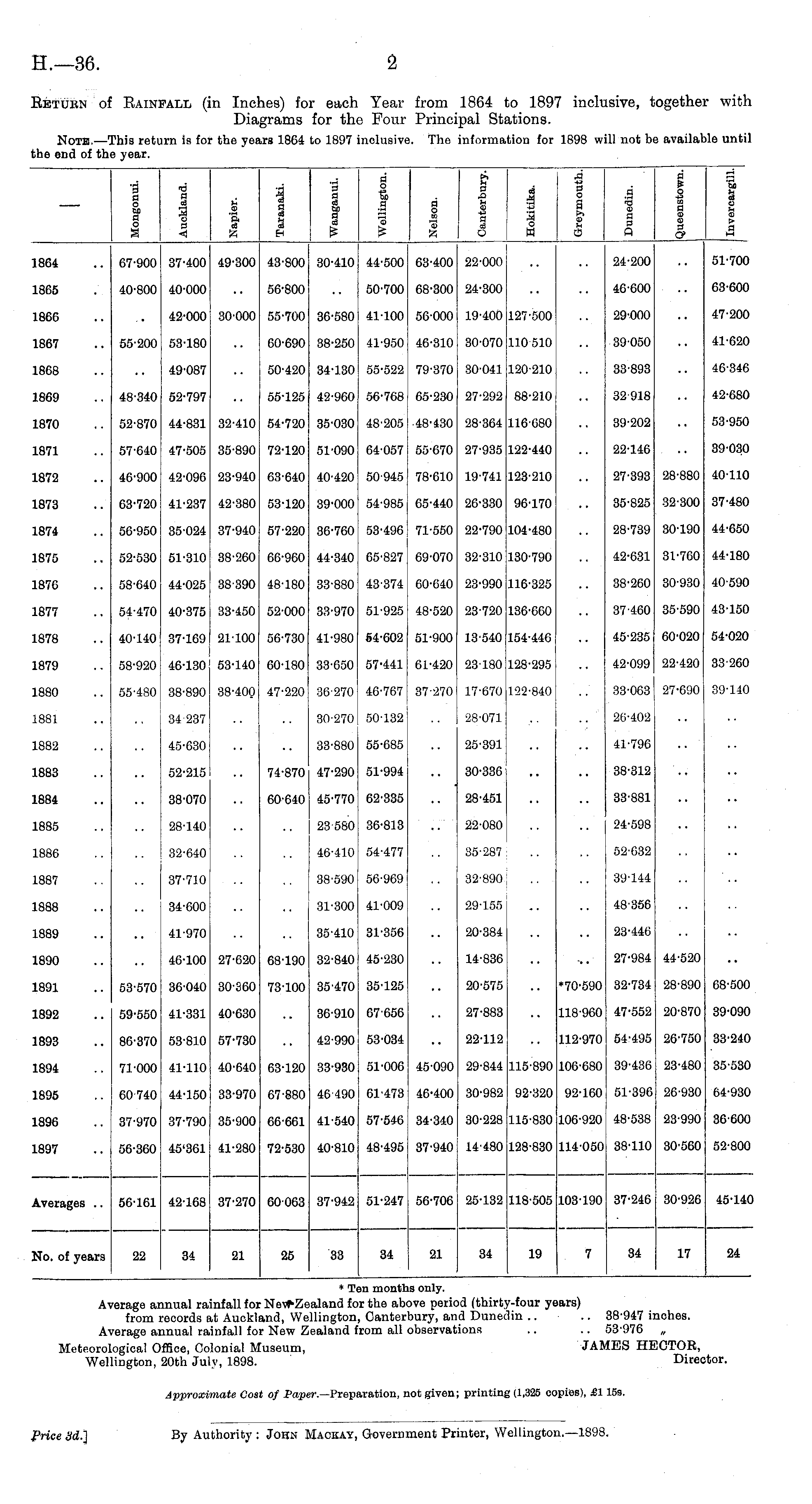 Average annual rainfall for for the above period (thirty-four years) from records at Auckland, Wellington, Canterbury, and Dunedin .. .. 38-947 inches. Average annual rainfall for New Zealand from all observations .. .. 53976 „ Meteorological Office, Colonial Museum, JAMES HECTOR, Wellington, 20th July, 1898. Director.