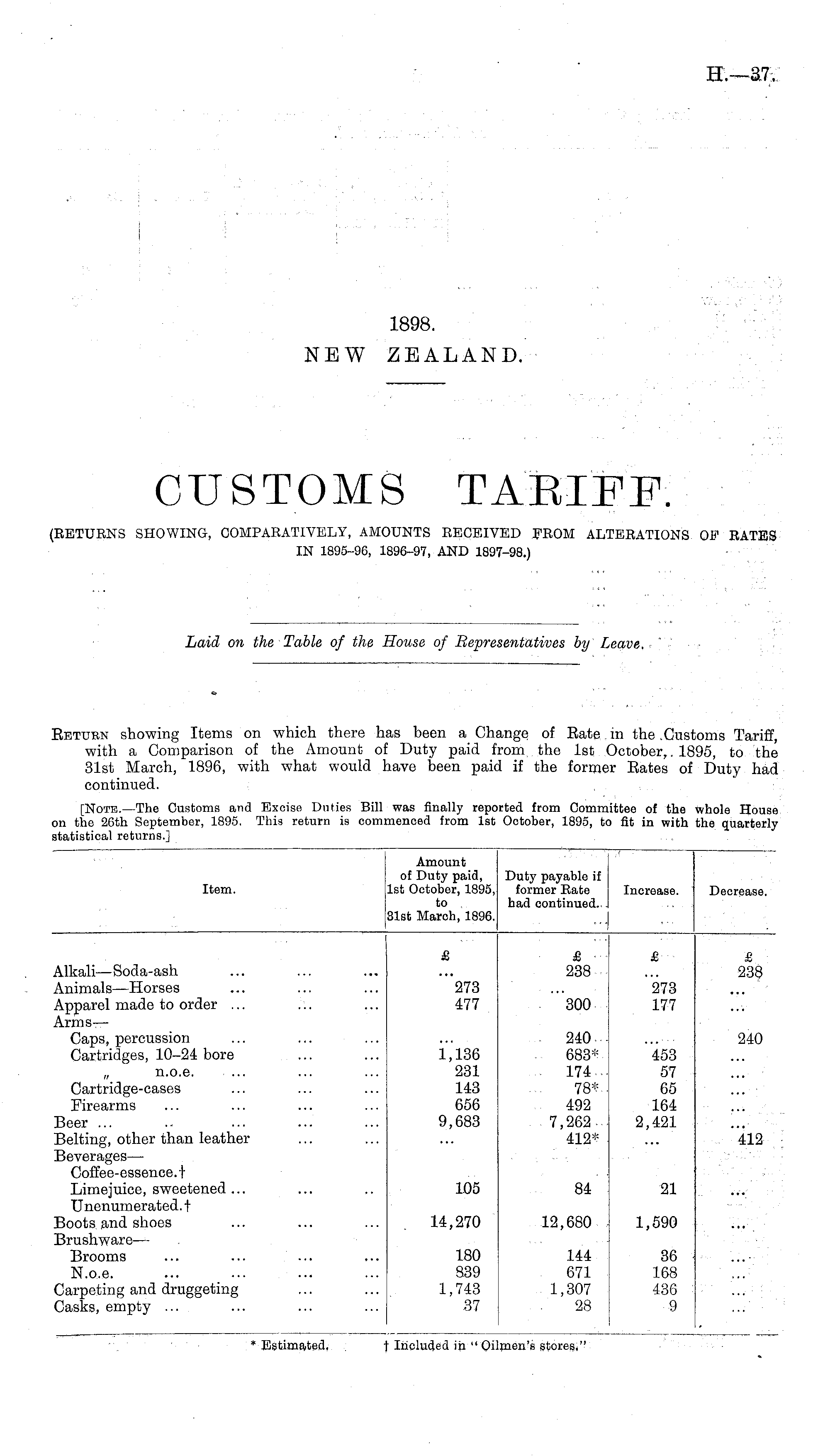 Item. Amount of Duty paid, 1st October, 1895, to . 31st March, 1896. Duty payable if former Bate had continued. . Increase. Decrease. Alkali —Soda-ash Animals —Horses Apparel made to order ... Arms— Caps, percussion Cartridges, 10-24 bore £ £ ■■■ 238 £ £ 238 "*273 477 "300 273 177 „ n.o.e Cartridge-cases Firearms 1,136 231 143 656 9,683 240 • 683* . 174... 78*.. 492 7,262-.. 412* 453 57 65 164 2,421 240 Beer ... Belting, other than leather Beverages— Coffee-essence. + Limejuice, sweetened ... Unenumerated. t Boots, and shoes Brushware — Brooms N.o.e. Carpeting and druggeting Casks, empty ... 105 14,270 84 12,680 21 1,590 412 180 839 1,743 37 144 671 1,307 28 36 168 436 9