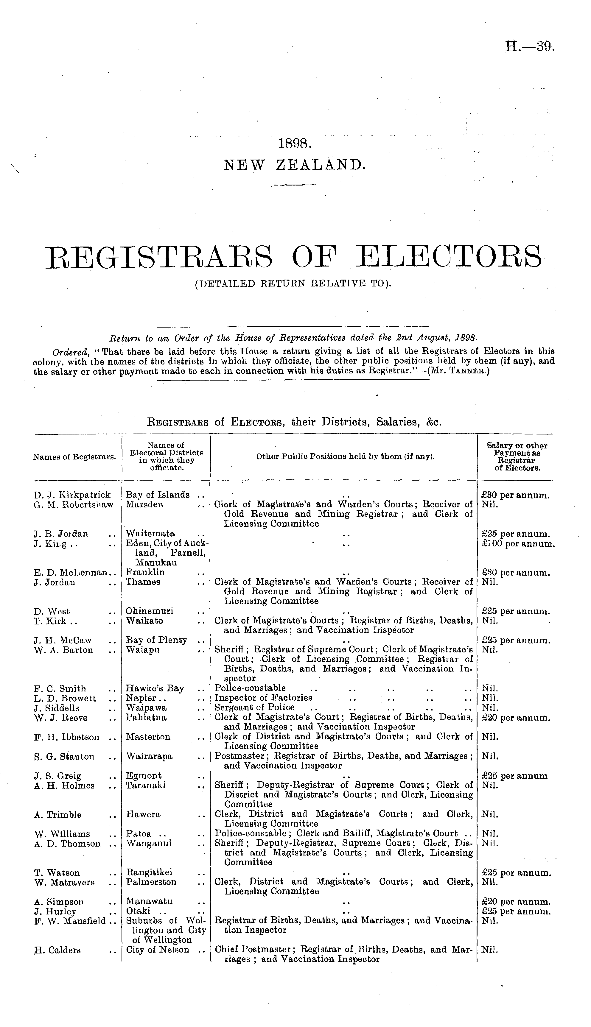 [ames of Registrars. Names of Electoral Districts in which they officiate. Other Public Positions held by them (if any). Salary or other Payment as Registrar of Electors. D. J. Kirkpatrick G. M. Robertshaw Bay of Islands .. Marsden Clerk of Magistrate's and Warden's Courts; Receiver of Gold Revenue and Mining Registrar ; and Clerk of Licensing Committee £30 per annum. Nil. J. B. Jordan J.King.. Waitemata Eden, City of Auckland, Parnell, Manukau Franklin Thames £25 per annum. £100 per annum E. D. McLennan.. J. Jordan Clerk of Magistrate's and Warden's Courts; Receiver of Gold Revenue and Mining Registrar ; and Clerk of Licensing Committee £30 per annum. Nil. D. West T. Kirk .. Ohinemuri Waikato Clerk of Magistrate's Courts ; Registrar of Births, Deaths, and Marriages ; and Vaccination Inspector £25 per annum. Nil. J. H. McCaw W.A.Barton .. Bay of Plenty .. Waiapu Sheriff; Registrar of Supreme Court; Clerk of Magistrate's Court; Clerk of Licensing Committee; Registrar of Births, Deaths, and Marriages; and Vaccination Inspector Police-constable Inspector of Factories Sergeant of Police Clerk of Magistrate's Court; Registrar of Births, Deaths, and Marriages ; and Vaccination Inspector Clerk of District and Magistrate's Courts ; and Clerk of Licensing Committee Postmaster; Registrar of Births, Deaths, and Marriages ; and Vaooination Inspector £25 per annum. Nil. F. 0. Smith L. D. Browett J. Siddells W. J. Reeve Hawke's Bay Napier Waipawa Pahiatua Nil. Nil. Nil. £20 per annum. F. H. Ibbetson .. Masterton Nil. S. G. Stanton .. Wairarapa Nil. J. S. Greig A, H. Holmes Egmont Taranaki Sheriff; Deputy-Registrar of Supreme Court; Clerk of District and Magistrate's Courts; and Clerk, Licensing Committee Clerk, District and Magistrate's Courts; and Clerk, Licensing Committee Police-constable ; Clerk and Bailiff, Magistrate's Court .. Sheriff ; Deputy-Registrar, Supreme Court; Clerk, District and Magistrate's Courts; and Clerk, Licensing Committee £25 per annum Nil. A. Trimble Hawera Nil. W. Williams A. D. Thomson .. Patea Wanganui Nil. Nil. T. Watson W. Matravers Rangitikei Palmerston Clerk, District and Magistrate's Courts; and Clerk, Licensing Committee £25 per annum. Nil. A. Simpson J. Hurley F. W. Mansfield .. Manawatu Otaki Suburbs of Wellington and City of Wellington City of Nelson .. Registrar of Births, Deaths, and Marriages ; and Vaccination Inspector £20 per annum. £25 per annum. Nil. H. Calders Chief Postmaster; Registrar of Births, Deaths, and Marriages ; and Vaccination Inspector Nil.