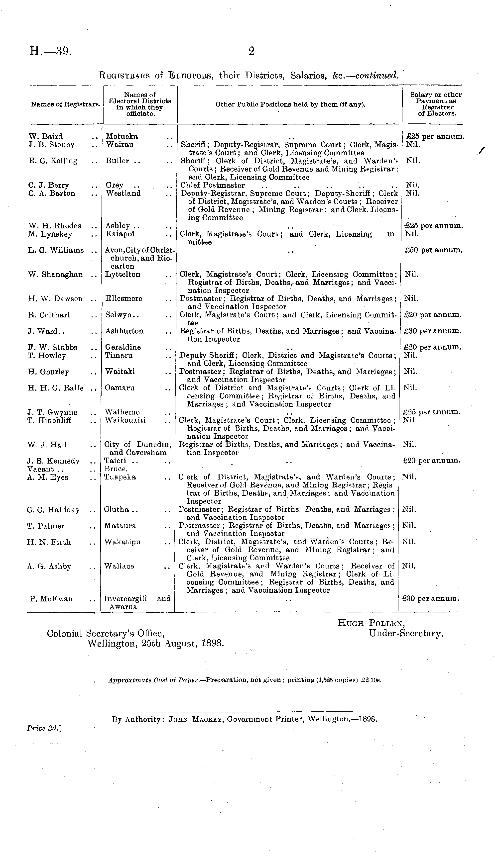 Hugh Pollen, Colonial Secretary's Office, Under-Secretary. Wellington, 25th August, 1898.