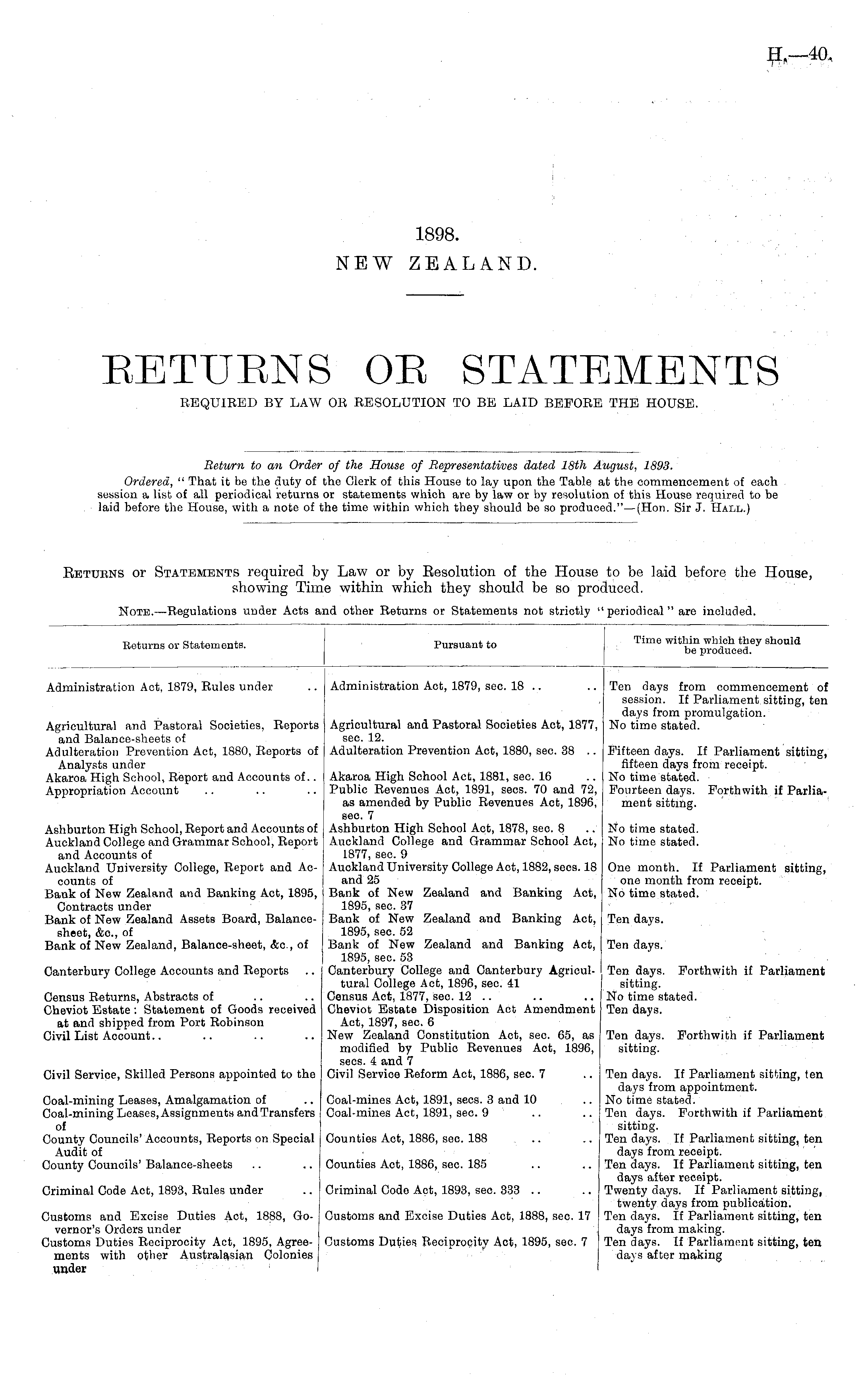 Note.—Regu lations un .er ;s ani ler ;eturns or Ital ;ements not strici ly "perioi Ileal " are inclu Returns or Statements. Pursuant to Time within which they should be produced. Administration Act, 1879, Rules under Administration Act, 1879, sec. 18 .. Ten days from commencement of session. If Parliament sitting, ten days from promulgation. No time stated. Agricultural and Pastoral Societies, Reports and Balance-sheets of Adulteration Prevention Act, 1880, Reports of Analysts under Akaroa High School, Report and Accounts of.. Appropriation Account Agricultural and Pastoral Societies Act, 1877, sec. 12. Adulteration Prevention Act, 1880, sec. 38 .. Fifteen days. If Parliament sitting, fifteen days from receipt. No time stated. Fourteen days. Forthwith if Parliament sitting. Ashburton High School, Report and Accounts of Auckland College and Grammar School, Report and Accounts of Auckland University College, Report and Accounts of Bank of New Zealand and Banking Act, 1895, Contracts under Bank of New Zealand Assets Board, Balancesheet, &c, of Bank of New Zealand, Balance-sheet, &c, of Akaroa High School Act, 1881, sec. 16 Public Revenues Act, 1891, sees. 70 and 72, as amended by Public Revenues Act, 1896, sec. 7 Ashburton High School Act, 1878, sec. 8 Auckland College and Grammar School Act, 1877, sec. 9 Auckland University College Act, 1882, sees. 18 and 25 Bank of New Zealand and Banking Act, 1895, sec. 37 Bank of New Zealand and Banking Act, 1895, sec. 52 Bank of New Zealand and Banking Act, 1895, sec. 53 Canterbury College and Canterbury Agricultural College Act, 1896, sec. 41 Census Act, 1877, sec. 12 .. Cheviot Estate Disposition Act Amendment Act, 1897, sec. 6 New Zealand Constitution Act, sec. 65, as modified by Public Revenues Act, 1896, sees. 4 and 7 Civil Service Reform Act, 1886, sec. 7 No time stated. No time stated. One month. If Parliament sitting, one month from receipt. No time stated. Ten days. Ten days. Canterbury College Accounts and Reports Ten days. Forthwith if Parliament sitting. No time stated. Ten days. Census Returns, Abstracts of Cheviot Estate : Statement of Goods received at and shipped from Port Robinson Civil List Account Ten days. Forthwith if Parliament sitting. Civil Service, Skilled Persons appointed to the Ten days. If Parliament sitting, ten days from appointment. No time stated. Ten days. Forthwith if Parliament sitting. Ten days. If Parliament sitting, ten days from receipt. Ten days. If Parliament sitting, ten days after receipt. Twenty days. If Parliament sitting, twenty days from publication. Ten days. If Parliament sitting, ten days from making. Ten days. If Parliament sitting, ten days after making Coal-mining Leases, Amalgamation of Coal-mining Leases, Assignments and Transfers of Coal-mines Act, 1891, sees. 3 and 10 Coal-mines Act, 1891, sec. 9 County Councils' Accounts, Reports on Special Audit of County Councils' Balance-sheets Counties Act, 1886, sec. 188 Counties Act, 1886, sec. 185 Criminal Code Act, 1893, Rules under Criminal Code Act, 1893, sec. 333 .. Customs and Excise Duties Act, 1888, Governor's Orders under Customs Duties Reciprocity Act, 1895, Agreements with other Australasian Colonies under Customs and Excise Duties Act, 1888, sec. 17 Customs Duties Reciprocity Act, 1895, sec. 7