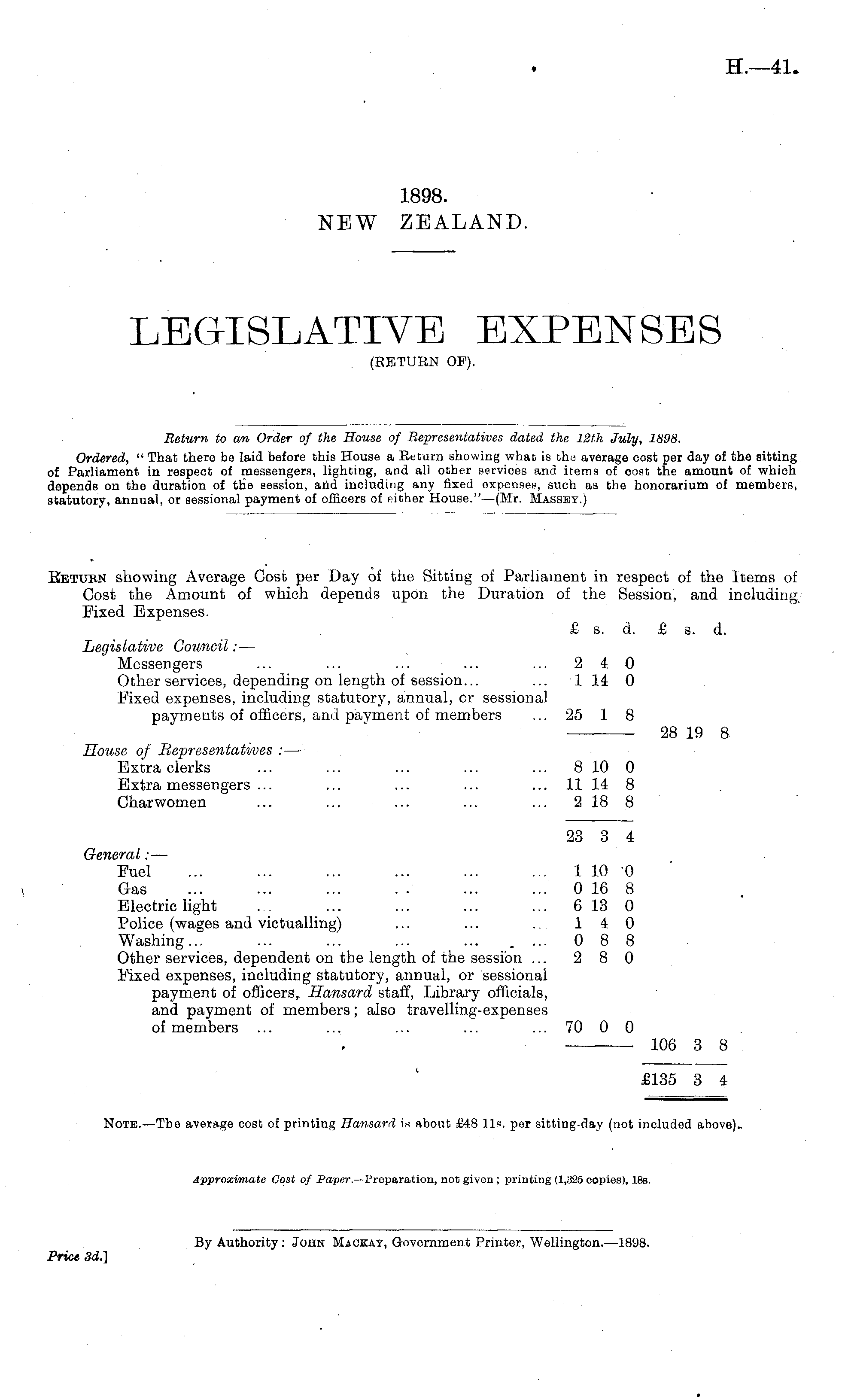 B'etubn showing Average Cost per Day of the Sitting of Parliament in respect of the Items of Cost the Amount of which depends upon the Duration of the Session, and including Fixed Expenses. £ s. d. £ s. d. Legislative Council: — Messengers ... ... ... ... ... 240 Other services, depending on length of session... ... 114 0 Fixed expenses, including statutory, annual, cr sessional payments of officers, and payment of members ... 25 1 8 28 19 8 House of Representatives : — Extra clerks ... ... ... ... ... 8 10 0 Extra messengers ... ... ... ... ... 11 14 8 Charwomen ... ... ... ... ... 2 18 8 23 3 4 General: — Fuel ... ... ... ... ... ... 1 10 0 t Gas ... ... ... ... ... ...' 016 8 Electric light ... ... ... ... ... 613 0 Police (wages and victualling) ... ... .. 140 Washing .... 0 8 8 Other services, dependent on the length of the session ... 2 8 0 Fixed expenses, including statutory, annual, or sessional payment of officers, Hansard staff, Library officials, and payment of members; also travelling-expenses of members ... ... ... ... ... 70 0 0 ■ 106 3 8 . £135 3 4 Note.—The average cost of printing Hansard is about £48 11s. per sitting-day (not included above)Approximate Cost of Paper.— Preparation, not given; printing (1,325 copies), 18s.
