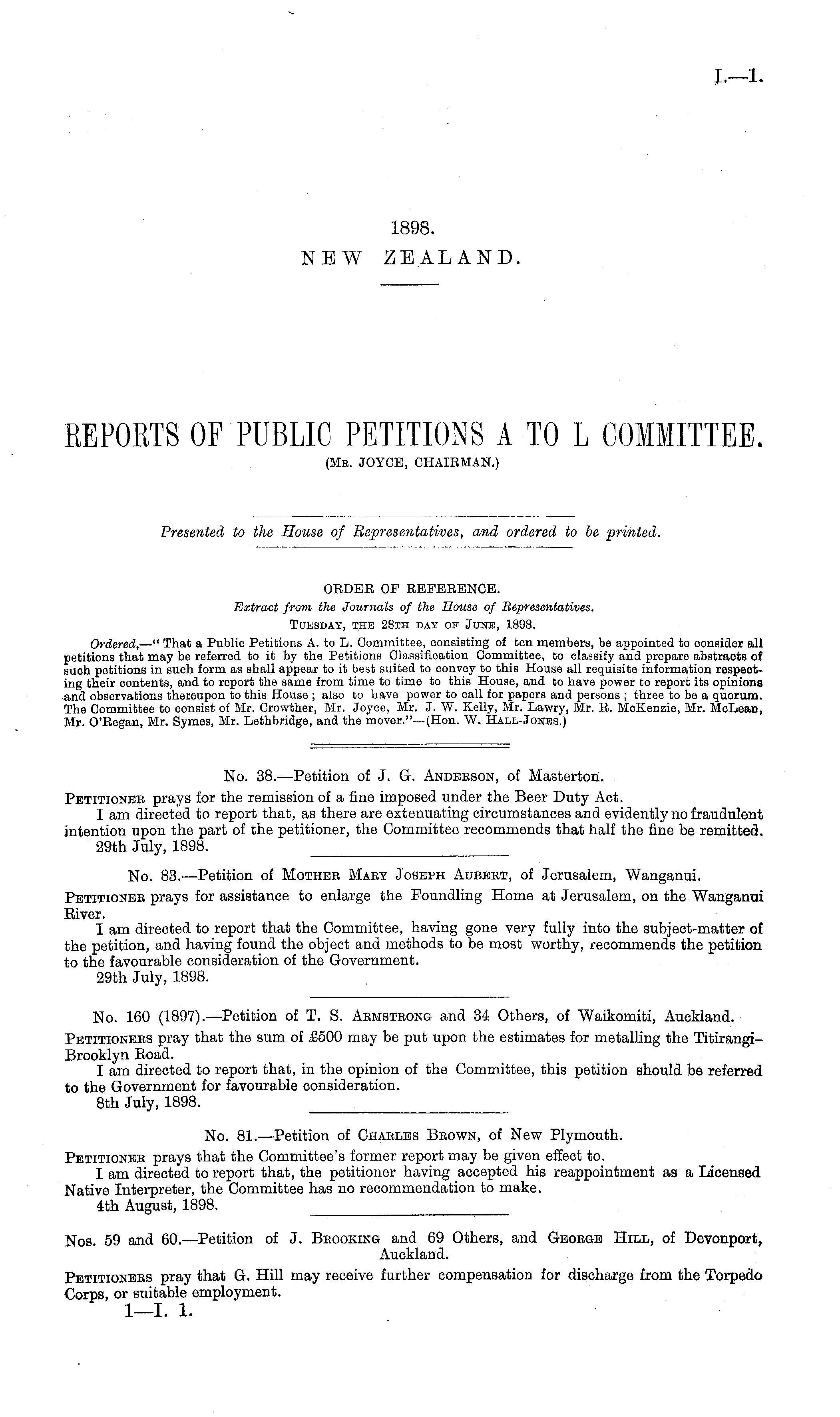 ORDER OF REFERENCE. Extract from the Journals of the House of Representatives. Tuesday, the 28th day op June, 1898. Ordered, —" That a Public Petitions A. to L. Committee, consisting of ten members, be appointed to consider all petitions that may be referred to it by the Petitions Classification Committee, to classify and prepare abstraots of suoh petitions in such form as shall appear to it best suited to convey to this House all requisite information respeoting their contents, and to report the same from time to time to this House, and to have power to report its opinions and observations thereupon to this House ; also to have power to call for papers and persons ; three to be a quorum. The Committee to consist of Mr. Crowther, Mr. Joyce, Mr. J. W. Kelly, Mr. Lawry, Mr. R. McKenzie, Mr. MoLean, Mr. O'Regan, Mr. Symes, Mr. Lethbridge, and the mover."—(Hon. W. Hall-Jones.)