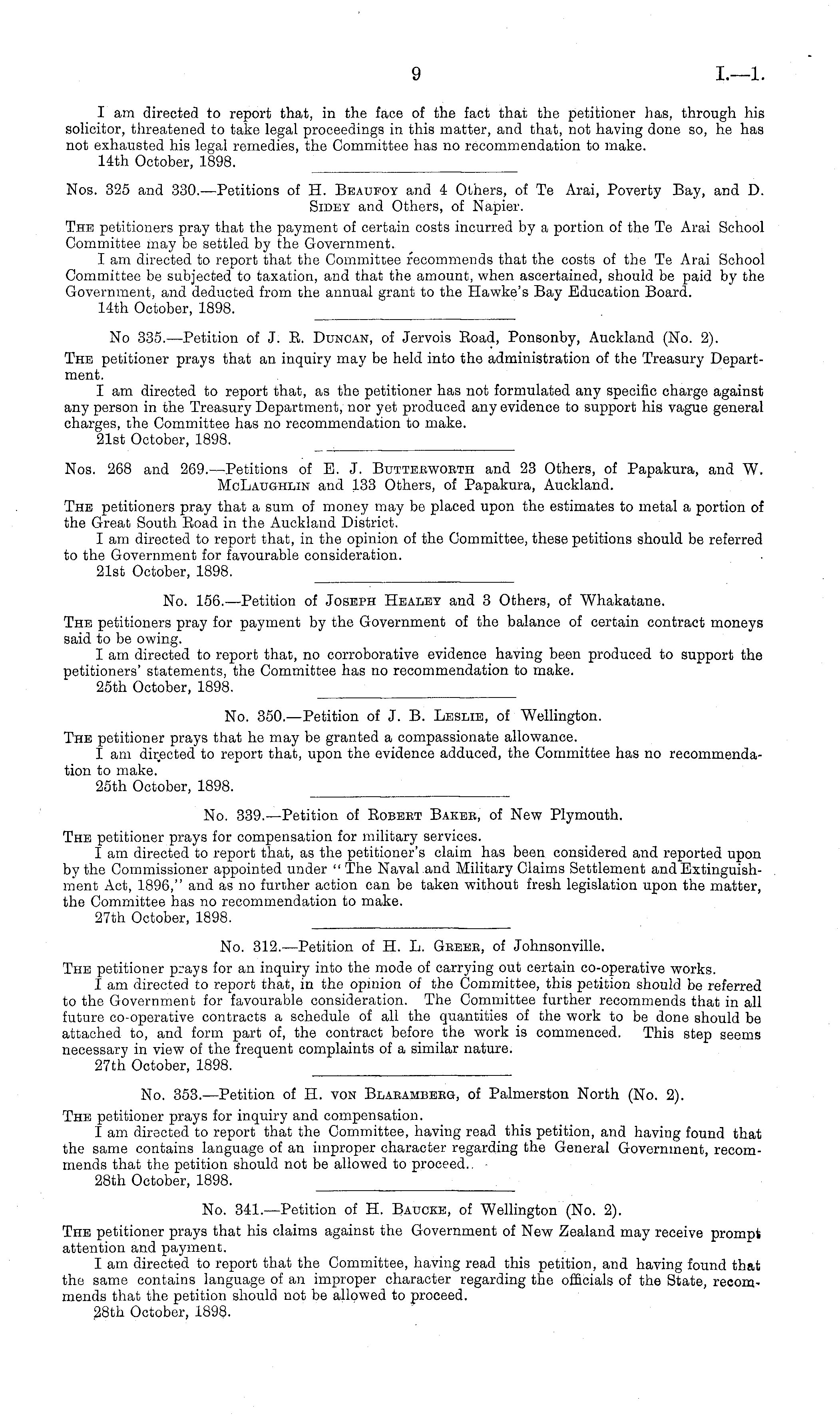 No 335. —Petition of J. E. Duncan, of Jervois Eoad, Ponsonby, Auckland (No. 2). The petitioner prays that an inquiry may be held into the administration of the Treasury Department. I am directed to report that, as the petitioner has not formulated any specific charge against any person in the Treasury Department, nor yet produced any evidence to support his vague general charges, the Committee has no recommendation to make. 21st October, 1898.