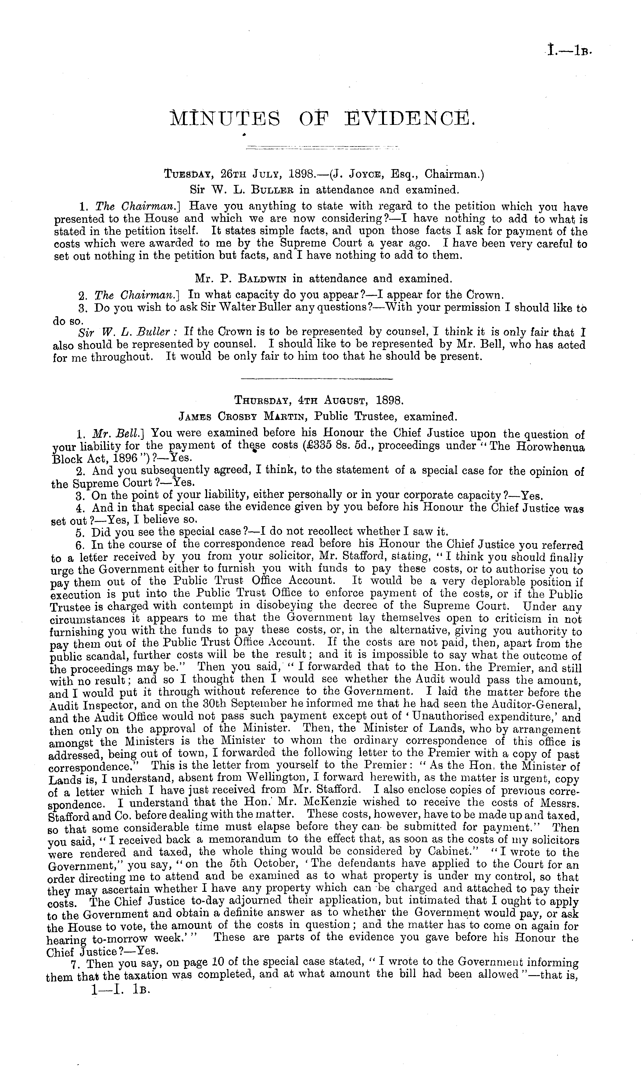 Tuesday, 26th July, 1898.—( J. Joyce, Esq., Chairman.) Sir W. L. Bullee in attendance and examined. 1. The Chairman.] Have you anything to state with regard to the petition which you have presented to the House and which we are now considering ?—I have nothing to add to what is stated in the petition itself. It states simple facts, and upon those facts I ask for payment of the costs which were awarded to me by the Supreme Court a year ago. I have been very careful to set out nothing in the petition but facts, and I have nothing to add to them. Mr. P. Baldwin in attendance and examined. 2. The Chairman.] In what capacity do you appear?—l appear for the Crown. 3. Do you wish to ask Sir Walter Buller any questions? —With your permission I should like to do so. Sir W. L. Buller : If the Crown is to be represented by counsel, I think it is only fair that I also should be represented by counsel. I should like to be represented by Mr. Bell, who has acted for me throughout. It would be only fair to him too that he should be present.