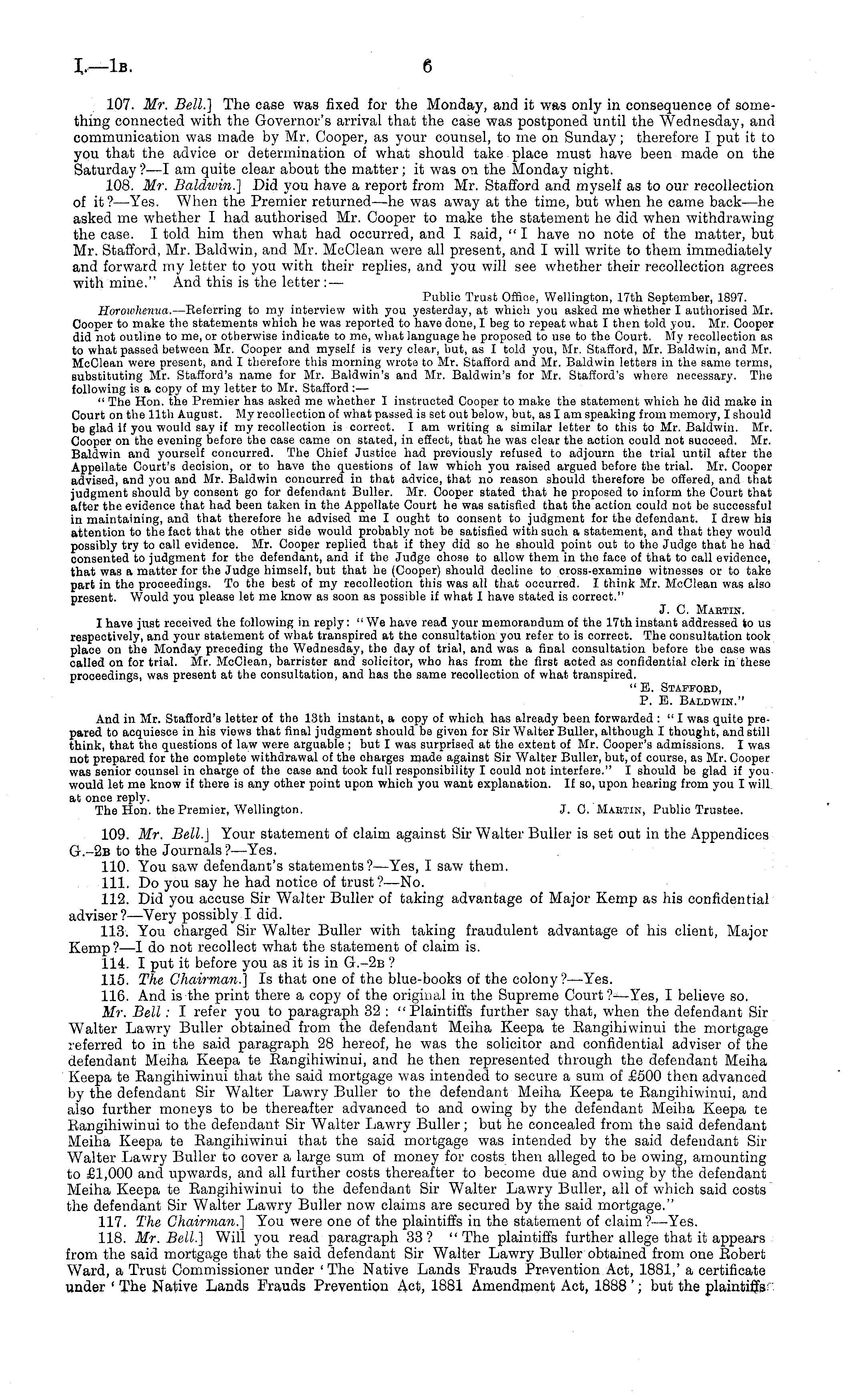 107. Mr. Bell.] The case was fixed for the Monday, and it was only in consequence of something connected with the Governor's arrival that the case was postponed until the Wednesday, and communication was made by Mr. Cooper, as your counsel, to me on Sunday; therefore I put it to you that the advice or determination of what should take place must have been made on the Saturday? —I am quite clear about the matter; it was on the Monday night. 108. Mr. Baldivin.] Did you have a report from Mr. Stafford and myself as to our recollection of it ?—Yes. When the Premier returned—he was away at the time, but when he came back —he asked me whether I had authorised Mr. Cooper to make the statement he did when withdrawing the case. I told him then what had occurred, and I said, " I have no note of the matter, but Mr. Stafford, Mr. Baldwin, and Mr. McClean were all present, and I will write to them immediately and forward my letter to you with their replies, and you will see whether their recollection agrees with mine." And this is the letter : — Public Trust Office, Wellington, 17th September, 189 Y. Horowhenua. —Referring to my interview with you yesterday, at which you asked me whether I authorised Mr. Cooper to make the statements which he was reported to have done, I beg to repeat what I then told you. Mr. Cooper did not outline to me, or otherwise indicate to me, what language he proposed to use to the Court. My recollection as to what passed between Mr. Cooper and myself is very clear, but, as I told you, Mr. Stafford, Mr. Baldwin, and Mr. McClean were present, and I therefore this morning wrote to Mr. Stafford and Mr. Baldwin letters in the same terms, substituting Mr. Stafford's name for Mr. Baldwin's and Mr. Baldwin's for Mr. Stafford's where necessary. The following is a copy of my letter to Mr. Stafford: — " The Hon. the Premier has asked me whether I instructed Cooper to make the statement which he did make in Court on the 11th August. My recollection of what passed is set out below, but, as lam speaking from memory, I should be glad if you would say if my recollection is correct. I am writing a similar letter to this to Mr. Baldwin. Mr. Cooper on the evening before the case came on stated, in effect, that he was clear the action could not succeed. Mr. Baldwin and yourself concurred. The Chief Justice had previously refused to adjourn the trial until after the Appellate Court's decision, or to have the questions of law which you raised argued before the trial. Mr. Cooper advised, and you and Mr. Baldwin concurred in that advice, that no reason should therefore be offered, and that judgment should by consent go for defendant Buller. Mr. Cooper stated that he proposed to inform the Court that after the evidence that had been taken in the Appellate Court he was satisfied that the action could not be successful in maintaining, and that therefore he advised me I ought to consent to judgment for the defendant. I drew his attention to the fact that the other side would probably not be satisfied with such a statement, and that they would possibly try to call evidence. Mr. Cooper replied that if they did so he should point out to the Judge that he had consented to judgment for the defendant, and if the Judge chose to allow them in the face of that to call ovidence, that was a matter for the Judge himself, but that he (Cooper) should decline to cross-examine witnesses or to take part in the proceedings. To the best of my recollection this was all that occurred. I think Mr. McClean was also present. Would you please let me know as soon as possible if what I have stated is correct." J. C. Maetin. I have just received the following in reply: "We have read your memorandum of the 17th instant addressed to us respectively, and your statement of what transpired at the consultation you refer to is correct. The consultation took place on the Monday preceding the Wednesday, the day of trial, and was a final consultation before the case was called on for trial. Mr. McClean, barrister and solicitor, who has from the first acted as confidential clerk in these proceedings, was present at the consultation, and has the same recollection of what transpired. " E. Staffobd, P. E. Baldwin." And in Mr. Stafford's letter of the 13th instant, a copy of which has already been forwarded : " I was quite prepared to acquiesce in his views that final judgment should be given for Sir Walter Buller, although I thought, and still think, that the questions of law were arguable ; but I was surprised at the extent of Mr. Cooper's admissions. I was not prepared for the complete withdrawal of the charges made against Sir Walter Buller, but, of course, as Mr. Cooper was senior counsel in charge of the case and took full responsibility I could not interfere." I should be glad if you would let me know if there is any other point upon which you want explanation. If so, upon hearing from you I will at once reply. The Hon. the Premier, Wellington. J. C. Maetin, Public Trustee. 109. Mr. Bell.] Your statement of claim against Sir Walter Buller is set out in the Appendices G.-2b to the Journals ? —Yes. 110. You saw defendant's statements? —Yes, I saw them. 111. Do you say he had notice of trust?— No. 112. Did you accuse Sir Walter Buller of taking advantage of Major Kemp as his confidential adviser ?—Very possibly I did. 113. You charged Sir Walter Buller with taking fraudulent advantage of his client, Major Kemp?—l do not recollect what the statement of claim is. 114. I put it before you as it is in G.-2b ? 115. The Chairman.] Is that one of the blue-books of the colony?— Yes. 116. And is the print there a copy of the original in the Supreme Court?— Yes, I believe so. Mr. Bell : I refer you to paragraph 32 : "Plaintiffs further say that, when the defendant Sir Walter Lawry Buller obtained from the defendant Meiha Keepa te Bangihiwinui the mortgage referred to in the said paragraph 28 hereof, he was the solicitor a