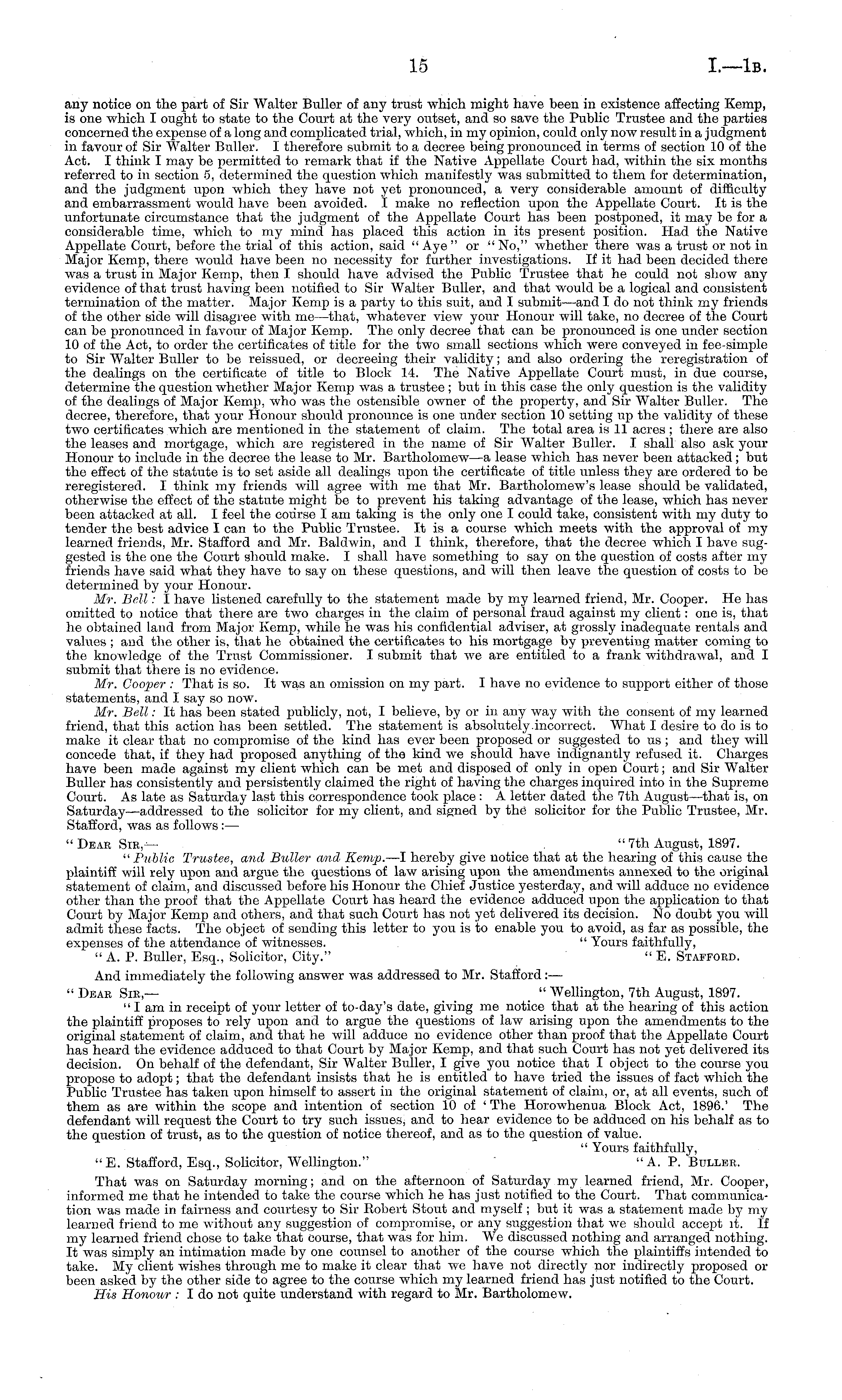 any notice on the part of Sir Walter Buller of any trust which might have been in existence affecting Kemp, is one which I ought to state to the Court at the very outset, and so save the Public Trustee and the parties concerned the expense of a long and complicated trial, which, in my opinion, could only now result in a judgment in favour of Sir Walter Buller. I therefore submit to a decree being pronounced in terms of section 10 of the Act. I think I may be permitted to remark that if the Native Appellate Court had, within the six months referred to in section 5, determined the question which manifestly was submitted to them for determination, and the judgment upon which they have not yet pronounced, a very considerable amount of difficulty and embarrassment would have been avoided. 1 make no reflection upon the Appellate Court. It is the unfortunate circumstance that the judgment of the Appellate Court has been postponed, it may be for a considerable time, which to my mind has placed this action in its present position. Had the Native Appellate Court, before the trial of this action, said "Aye" or "No," whether there was a trust or not in Major Kemp, there would have been no necessity for further investigations. If it had been decided there was a trust in Major Kemp, then I should have advised the Public Trustee that he could not show any evidence of that trust having been notified to Sir Walter Buller, and that would be a logical and consistent termination of the matter. Major Kemp is a party to this suit, and I submit—and Ido not think my friends of the other side will disagree with me —that, whatever view your Honour will take, no decree of the Court can be pronounced in favour of Major Kemp. The only decree that can be pronounced is one under section 10 of the Act, to order the certificates of title for the two small sections which were conveyed in fee-simple to Sir Walter Buller to be reissued, or decreeing their validity; and also ordering the reregistration of the dealings on the certificate of title to Block 14. The Native Appellate Court must, in due course, determine the question whether Major Kemp was a trustee ; but in this case the only question is the validity of the dealings of Major Kemp, who was the ostensible owner of the property, and Sir Walter Buller. The decree, therefore, that your Honour should pronounce is one under section 10 setting up the validity of these two certificates which are mentioned in the statement of claim. The total area is 11 acres ; there are also the leases and mortgage, which are registered in the name of Sir Walter Buller. I shall also ask your Honour to include in the decree the lease to Mr. Bartholomew —a lease which has never been attacked; but the effect of the statute is to set aside all dealings upon the certificate of title unless they are ordered to be reregistered. I think my friends will agree with me that Mr. Bartholomew's lease should be validated, otherwise the effect of the statute might be to prevent his taking advantage of the lease, which has never been attacked at all. I feel the course lam taking is the only one I could take, consistent with my duty to tender the best advice I can to the Public Trustee. It is a course which meets with the approval of my learned friends, Mr. Stafford and Mr. Baldwin, and I think, therefore, that the decree which I have suggested is the one the Court should make. I shall have something to say on the question of costs after my friends have said what they have to say on these questions, and will then leave the question of costs to be determined by your Honour. Mr. Bell: I have listened carefully to the statement made by my learned friend, Mr. Cooper. He has omitted to notice that there are two charges in the claim of personal fraud against my client : one is, that he obtained land from Major Kemp, while he was his confidential adviser, at grossly inadequate rentals and values ; and the other is, that he obtained the certificates to his mortgage by preventing matter coming to the knowledge of the Trust Commissioner. I submit that we are entitled to a frank withdrawal, and I submit that there is no evidence. Mr. Cooper : That is so. It was an omission on my part. I have no evidence to support either of those statements, and I say so now. Mr. Bell: It has been stated publicly, not, I believe, by or in any way with the consent of my learned friend, that this action has been settled. The statement is absolutely.incorrect. What I desire to do is to make it clear that no compromise of the kind has ever been proposed or suggested to us ; and they will concede that, if they had proposed anything of the kind we should have indignantly refused it. Charges have been made against my client which can be met and disposed of only in open Court; and Sir Walter Buller has consistently and persistently claimed the right of having the charges inquired into in the Supreme Court. As late as Saturday last this correspondence took place : A letter dated the 7th August—that is, on Saturday—addressed to the solicitor for my client, and signed by the solicitor for the Public Trustee, Mr. Stafford, was as follows: — "Dear Sir,— " 7th August, 1897. "Public Trustee, and Buller and Kent]}. —I hereby give notice that at the hearing of this cause the plaintiff will rely upon and argue the questions of law arising upon the amendments annexed to the original statement of claim, and discussed before his Honour the Chief Justice yesterday, and will adduce no evidence other than the proof that the Appellate Court has heard the evidence adduced upon the application to that Court by Major Kemp and others, and that such Court has not yet delivered its decision. No doubt you will admit these facts. The object of sending this letter to you is to enable you to avoid, as far as possible, the expenses of the attendance of witnesses. " Yours faithfully, " A. P. Buller, Esq., Solicitor, City." " E. Stafford. And immediately