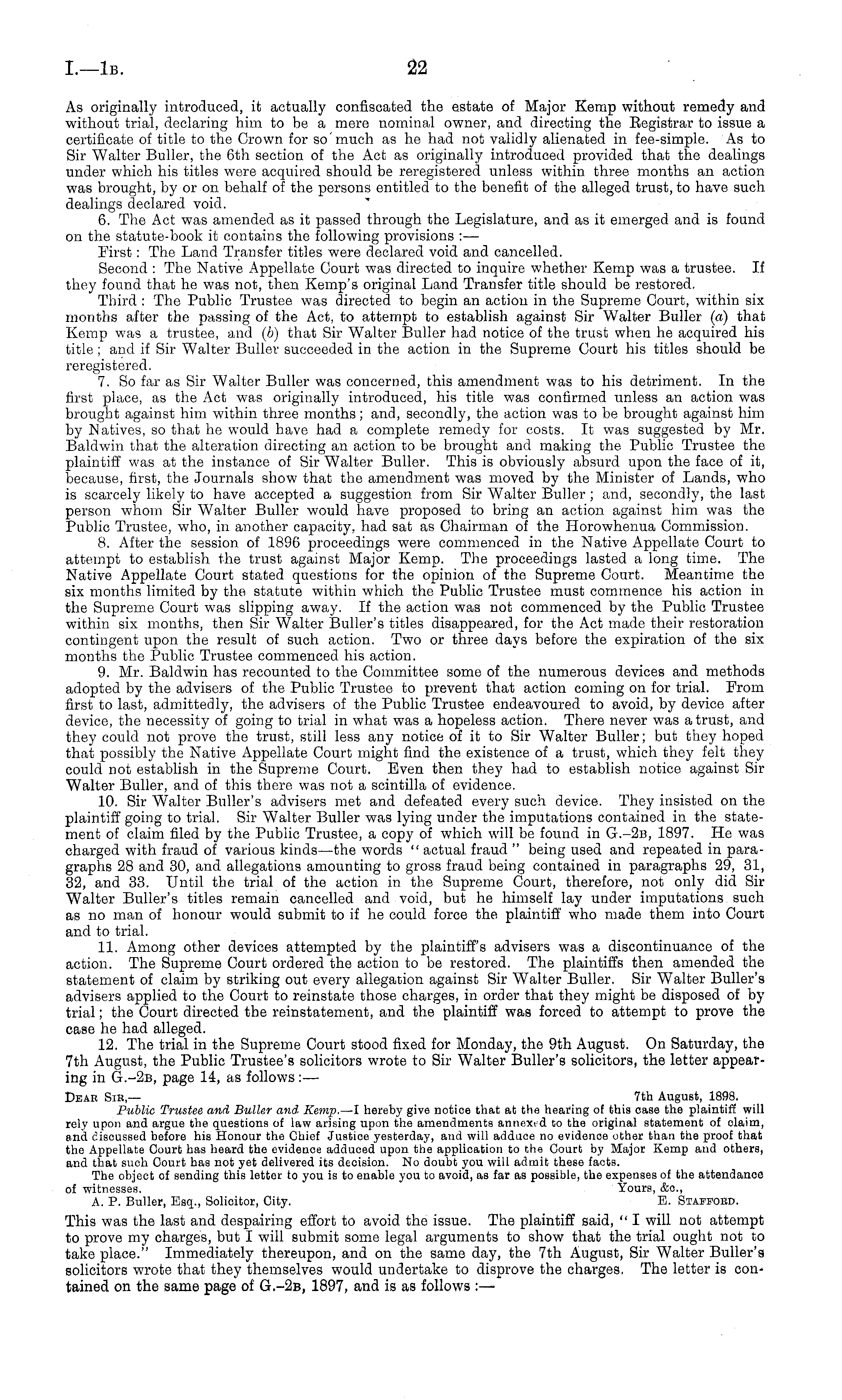 As originally introduced, it actually confiscated the estate of Major Kemp without remedy and without trial, declaring him to be a mere nominal owner, and directing the Begistrar to issue a certificate of title to the Crown for so much as he had not validly alienated in fee-simple. As to Sir Walter Buller, the 6th section of the Act as originally introduced provided that the dealings under which his titles were acquired should be reregistered unless within three months an action was brought, by or on behalf of the persons entitled to the benefit of the alleged trust, to have such dealings declared void. 6. The Act was amended as it passed through the Legislature, and as it emerged and is found on the statute-book it contains the following provisions : — First: The Land Transfer titles were declared void and cancelled. Second : The Native Appellate Court was directed to inquire whether Kemp was a trustee. If they found that he was not, then Kemp's original Land Transfer title should be restored. Third : The Public Trustee was directed to begin an action in the Supreme Court, within six months after the passing of the Act, to attempt to establish against Sir Walter Buller (a) that Kemp was a trustee, and (b) that Sir Walter Buller had notice of the trust when he acquired his title; and if Sir Walter Buller succeeded in the action in the Supreme Court his titles should be reregistered. 7. So far as Sir Walter Buller was concerned, this amendment was to his detriment. In the first place, as the Act was originally introduced, his title was confirmed unless an action was brought against him within three months; and, secondly, the action was to be brought against him by Natives, so that he would have had a complete remedy for costs. It was suggested by Mr. Baldwin that the alteration directing an action to be brought and making the Public Trustee the plaintiff was at the instance of Sir Walter Buller. This is obviously absurd upon the face of it, because, first, the Journals show that the amendment was moved by the Minister of Lands, who is scarcely likely to have accepted a suggestion from Sir Walter Buller ; and, secondly, the last person whom Sir Walter Buller would have proposed to bring an action against him was the Public Trustee, who, in another capacity, had sat as Chairman of the Horowhenua Commission. 8. After the session of 1896 proceedings were commenced in the Native Appellate Court to attempt to establish the trust against Major Kemp. The proceedings lasted a long time. The Native Appellate Court stated questions for the opinion of the Supreme Court. Meantime the six months limited by the statute within which the Public Trustee must commence his action in the Supreme Court was slipping away. If the action was not commenced by the Public Trustee within six months, then Sir Walter Buller's titles disappeared, for the Act made their restoration contingent upon the result of such action. Two or three days before the expiration of the six months the Public Trustee commenced his action. 9. Mr. Baldwin has recounted to the Committee some of the numerous devices and methods adopted by the advisers of the Public Trustee to prevent that action coming on for trial. From first to last, admittedly, the advisers of the Public Trustee endeavoured to avoid, by device after device, the necessity of going to trial in what was a hopeless action. There never was a trust, and they could not prove the trust, still less any notice of it to Sir Walter Buller; but they hoped that possibly the Native Appellate Court might find the existence of a trust, which they felt they could not establish in the Supreme Court. Even then they had to establish notice against Sir Walter Buller, and of this there was not a scintilla of evidence. 10. Sir Walter Buller's advisers met and defeated every such device. They insisted on the plaintiff going to trial. Sir Walter Buller was lying under the imputations contained in the statement of claim filed by the Public Trustee, a copy of which will be found in G.-2b, 1897. He was charged with fraud of various kinds —the words " actual fraud " being used and repeated in paragraphs 28 and 30, and allegations amounting to gross fraud being contained in paragraphs 29, 31, 32, and 33. Until the trial of the action in the Supreme Court, therefore, not only did Sir Walter Buller's titles remain cancelled and void, but he himself lay under imputations such as no man of honour would submit to if he could force the plaintiff who made them into Court and to trial. 11. Among other devices attempted by the plaintiff's advisers was a discontinuance of the action. The Supreme Court ordered the action to be restored. The plaintiffs then amended the statement of claim by striking out every allegation against Sir Walter Buller. Sir Walter Buller's advisers applied to the Court to reinstate those charges, in order that they might be disposed of by trial; the Court directed the reinstatement, and the plaintiff was forced to attempt to prove the case he had alleged. 12. The trial in the Supreme Court stood fixed for Monday, the 9th August. On Saturday, the 7th August, the Public Trustee's solicitors wrote to Sir Walter Buller's solicitors, the letter appearing in G.-2b, page 14, as follows : — Dear Sir,— 7th August, 1898. Public Trustee and Buller and Kemp. —l hereby give notice that at the hearing of this case the plaintiff will rely upon and argue the questions of law arising upon the amendments annextd to the original statement of claim, and discussed before his Honour the Chief Justice yesterday, aud will adduoe no evidence other than the proof that the Appellate Court has heard the evidence adduced upon the application to the Court by Major Kemp and others, and that such Court has not yet delivered its decision. No doubt you will admit these facts. The object of sending this letter to you is to enable you to avoid, as far as possible, the expenses of the attendance of witnesses. Yours