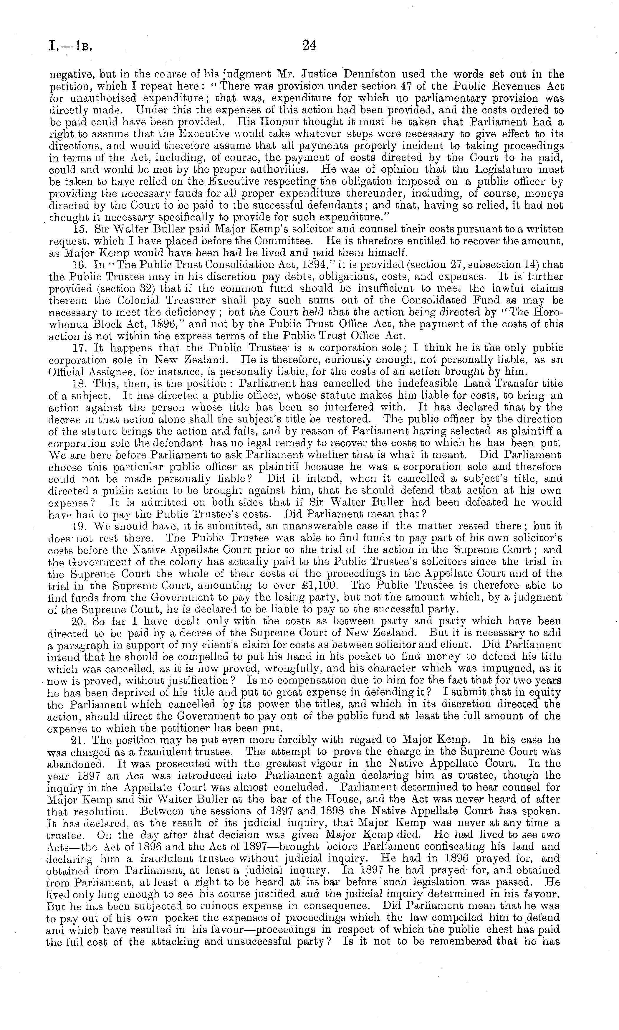 negative, but in the course of his judgment Mr. Justice Denniston used the words set out in the petition, which I repeat here : "There was provision under section 47 of the Public Bevenues Act for unauthorised expenditure ; that was, expenditure for which no parliamentary provision was directly made. Under this the expenses of this action had been provided, and the costs ordered to be paid could have been provided. His Honour thought it must be taken that Parliament had a right to assume that the Executive would take whatever steps were necessary to give effect to its directions, and would therefore assume that all payments properly incident to taking proceedings in terms of the Act, including, of course, the payment of costs directed by the Court to be paid, could and would be met by the proper authorities. He was of opinion that the Legislature must be taken to have relied on the .Executive respecting the obligation imposed on a public officer by providing the necessary funds for all proper expenditure thereunder, including, of course, moneys directed by the Court to be paid to the successful defendants; and that, having so relied, it had not thought it necessary specifically to provide for such expenditure." 15. Sir Walter Buller paid Major Kemp's solicitor and counsel their costs pursuant to a written request, which I have placed before the Committee. He is therefore entitled to recover the amount, as Major Kemp would have been had he lived and paid them himself. 16. In "The Public Trust Consolidation Act, 1894," it is provided (section 27, subsection 14) that the Public Trustee may in his discretion pay debts, obligations, costs, and expenses. It is further provided (section 32) that if the common fund should be insufficient to meet the lawful claims thereon the Colonial Treasurer shall pay such sums out of the Consolidated Fund as may be necessary to meet the deficiency ; but the Couit held that the action being directed by "The Horowhenua Block Act, 1896," and not by the Public Trust Office Act, the payment of the costs of this action is not within the express terms of the Public Trust Office Act. 17. It happens that the Public Trustee is a corporation sole; I think he is the only public corporation sole in New Zealand. He is therefore, curiously enough, not personally liable, as an Official Assignee, for instance, is personally liable, for the costs of an action brought by him. 18. This, then, is the position : Parliament has cancelled the indefeasible Land Transfer titie of a subject. It has directed a public officer, whose statute makes him liable for costs, to bring an action against the person whose title has been so interfered with. It has declared that by the decree in that action alone shall the subject's title be restored. The public officer by the direction of the statute brings the action and fails, and by reason of Parliament having selected as plaintiff a corporation sole the defendant has no legal remedy to recover the costs to which he has been put. We are here before Parliament to ask Parliament whether that is what it meant. Did Parliament choose this particular public officer as plaintiff because he was a corporation sole and therefore could not be made personally liable? Did it intend, when it cancelled a subject's title, and directed a public action to be brought against him, that he should defend that action at his own expense ? It is admitted on both sides that if Sir Walter Buller had been defeated he would have had to pay the Public Trustee's costs. Did Parliament mean that ? 19. We should have, it is submitted, an unanswerable case if the matter rested there; but it does' not rest there. The Public Trustee was able to find funds to pay part of his own solicitor's costs before the Native Appellate Court prior to the trial of the action in the Supreme Court; and the Government of the colony has actually paid to the Public Trustee's solicitors since the trial in the Supreme Court the whole of their costs of the proceedings in the Appellate Court and of the trial in the Supreme Court, amounting to over £1,100. The Public Trustee is therefore able to find funds from the Government to pay the losing party, but not the amount which, by a judgment of the Supreme Court, he is declared to be liable to pay to the successful party. 20. So far I have dealt only with the costs as between party and party which have been directed to be paid by a decree of the Supreme Court of New Zealand. But it is necessary to add a paragraph in support of my client's claim for costs as between solicitor and client. Did Parliament intend that he should be compelled to put his hand in his pocket to find money to defend his title which was cancelled, as it is now proved, wrongfully, and his character which was impugned, as it now is proved, without justification ? Is no compensation due to him for the fact that for two years he has been deprived of his title and put to great expense in defending it ? I submit that in equity the Parliament which cancelled by its power the titles, and which in its discretion directed the action, should direct the Government to pay out of the public fund at least the full amount of the expense to which the petitioner has been put. 21. The position may be put even more forcibly with regard to Major Kemp. In his case he was charged as a fraudulent trustee. The attempt to prove the charge in the Supreme Court was abandoned. It was prosecuted with the greatest vigour in the Native Appellate Court. In the year 1897 an Act was introduced into Parliament again declaring him as trustee, though the inquiry in the Appellate Court was almost concluded. Parliament determined to hear counsel for Major Kemp and Sir Walter Buller at the bar of the House, and the Act was never heard of after that resolution. Between the sessions of 1897 and 1898 the Native Appellate Court has spoken. It has declared, as the result of its judicial inquiry, that Major Kemp was never at any ti