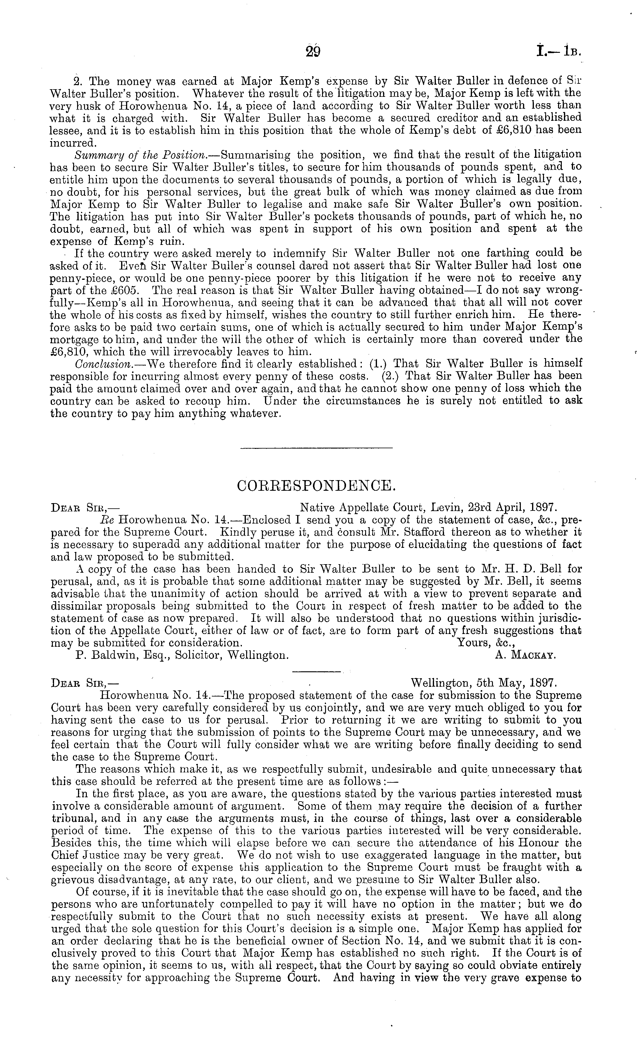 COEEESPONDENCE. Deae Sib, — Native Appellate Court, Levin, 23rd April, 1897. Re Horowhenua No. 14.—Enclosed I send you a copy of the statement of case, &c, prepared for the Supreme Court. Kindly peruse it, and consult Mr. Stafford thereon as to whether it is necessary to superadd any additional matter for the purpose of elucidating the questions of fact and law proposed to be submitted. A copy of the case has been handed to Sir Walter Buller to be sent to Mr. H. D. Bell for perusal, and, as it is probable that some additional matter may be suggested by Mr. Bell, it seems advisable that the unanimity of action should be arrived at with a view to prevent separate and dissimilar proposals being submitted to the Court in respect of fresh matter to be added to the statement of case as now prepared. It will also be understood that no questions within jurisdiction of the Appellate Court, either of law or of fact, are to form part of any fresh suggestions that may be submitted for consideration. Yours, &c, P. Baldwin, Esq., Solicitor, Wellington. A. Mackay.