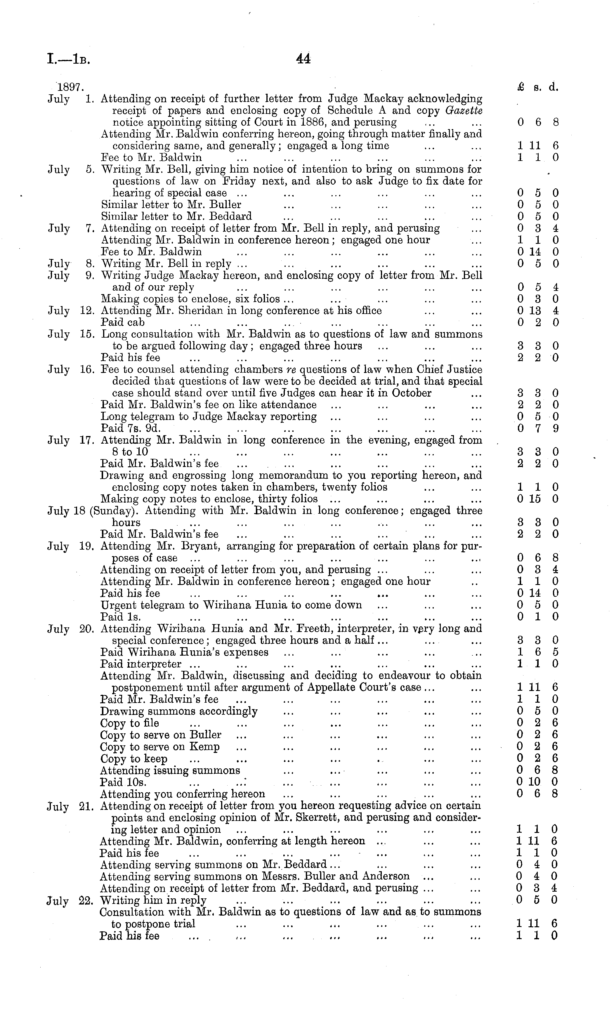 1897. £ s. d. July 1. Attending on receipt of further letter from Judge Mackay acknowledging receipt of papers and enclosing copy of Schedule A and copy Gazette notice appointing sitting of Court in 1886, and perusing ~. ... 068 Attending Mr. Baldwin conferring hereon, going through matter finally and considering same, and generally; engaged a long time ... ... 1 11 6 Fee to Mr. Baldwin ... ... ... ... ... ... 110 July 5. Writing Mr. Bell, giving him notice of intention to bring on summons for questions of law on Friday next, and also to ask Judge to fix date for hearing of special case ... ... ... ... ... ... 050 Similar letter to Mr. Buller ... ... ... ... ... 050 Similar letter to Mr. Beddard ... ... ... ... ... 050 July 7. Attending on receipt of letter from Mr. Bell in reply, and perusing ... 0 3 4 Attending Mr. Baldwin in conference hereon; engaged one hour ... 110 Fee to Mr. Baldwin ... ... ... ... ... ... 0 14 0 July 8. Writing Mr. Bell in reply ... ... ... ... ... ... 050 July 9. Writing Judge Mackay hereon, and enclosing copy of letter from Mr. Bell and of our reply ... ... ... ... ... ... 054 Making copies to enclose, six folios ... ... ... ... ... 030 July 12. Attending Mr. Sheridan in long conference at his office ... ... 0 13 4 Paid cab ... ... ... ... ... ... ... 0 2 0 July 15. Long consultation with Mr. Baldwin as to questions of law and summons to be argued following day; engaged three hours ... ... ... 330 Paid his fee ... ... ... ... ... ... ... 2 2 0 July 16. Fee to counsel attending chambers re questions of law when Chief Justice decided that questions of law were to be decided at trial, and that special case should stand over until five Judges can hear it in October ... 330 Paid Mr. Baldwin's fee on like attendance ... ... ... ... 220 Long telegram to Judge Mackay reporting ... ... ... ... 050 Paid 7s. 9d. ... ... ... ... ... ... ... 0 7 9 July 17. Attending Mr. Baldwin in long conference in the evening, engaged from Btolo ... ... ... ... ... ... ... 3 3 0 Paid Mr. Baldwin's fee ... ... ... ... ... ... 2 2 0 Drawing and engrossing long memorandum to you reporting hereon, and enclosing copy notes taken in chambers, twenty folios ... ... 110 Making copy notes to enclose, thirty folios ... ... ... ... 0 15 0 July 18 (Sunday). Attending with Mr. Baldwin in long conference; engaged three hours ... ... ... ... ... ... ... 3 3 0 Paid Mr. Baldwin's fee ... ... ... ... ... ... 2 2 0 July 19. Attending Mr. Bryant, arranging for preparation of certain plans for purposes of case ... ... ... ... ... ... ... 068 Attending on receipt of letter from you, and perusing ... ... ... 034 Attending Mr. Baldwin in conference hereon; engaged one hour .. 110 Paid his fee ... ... ... ... ... ... ... 0 14 0 Urgent telegram to Wirihana Hunia to come down ... ... ... 050 Paid Is. ... ... ... ... ... ... ... 0 10 July 20. Attending Wirihana Hunia and Mr. Freeth, interpreter, in very long and special conference; engaged three hours and a half ... ... ... 330 Paid Wirihana Hunia's expenses ... ... ... ... ... 165 Paid interpreter ... ... ... ... ... ... ... 110 Attending Mr. Baldwin, discussing and deciding to endeavour to obtain postponement until after argument of Appellate Court's case ... ... 1 11 6 Paid Mr. Baldwin's fee ... ... ... ... ... ... 110 Drawing summons accordingly ... ... ... ... ... 050 Copy to file ... ... ... ... ... ... ... 0 2 6 Copy to serve on Buller ... ... ... ... ... ... 026 Copy to serve on Kemp ... ... ... ... ... ... 026 Copy to keep ... ... ... ... .. ... ... 026 Attending issuing summons ... ... ... ... ... 068 Paid 10s. : ... 0 10 0 Attending you conferring hereon ... ... ... ... ... 068 July 21. Attending on receipt of letter from you hereon requesting advice on certain points and enclosing opinion of Mr. Skerrett, and perusing and considering letter and opinion ... ... ... ... ... ... 110 Attending Mr. Baldwin, conferring at length hereon ... ... ... 1 11 6 Paid his fee ... ... ... ... ... ... ... 110 Attending serving summons on Mr. Beddard ... ... ... ... 040 Attending serving summons on Messrs. Buller and Anderson ... ... 0 4 0 Attending on receipt of letter from Mr. Beddard, and perusing ... ... 034 July 22. Writing him in reply ... ... ... ... ... ... 050 Consultation with Mr. Baldwin as to questions of law and as to summons to postpone trial ... ... ... ... ... ... 1 11 6 Paid his fee ... . 110