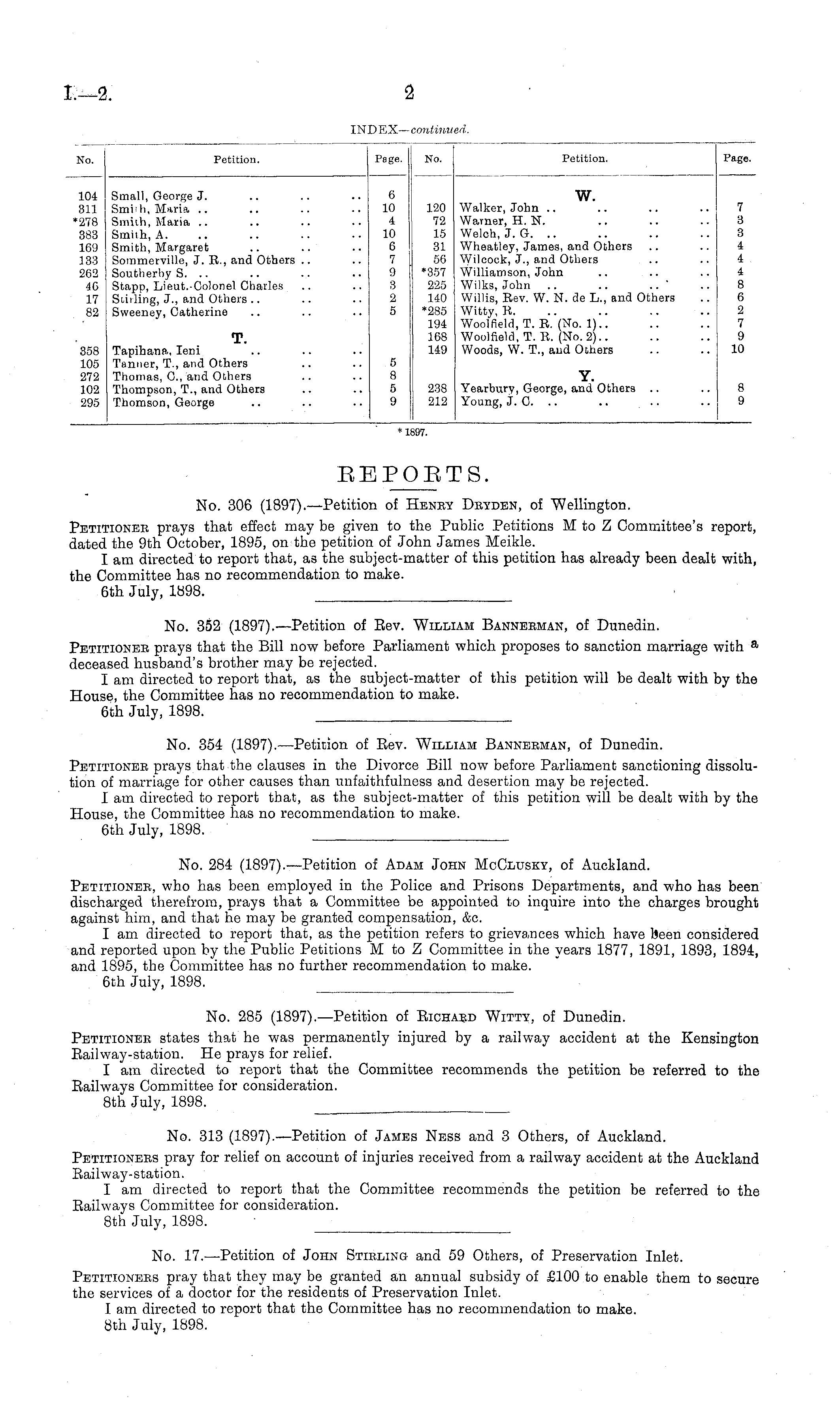 No. 285 (1897).—Petition of Eichard Witty, of Dunedin. Petitioner states that he was permanently injured by a railway accident at the Kensington Railway-station. He prays for relief. I am directed to report that the Committee recommends the petition be referred to the Eailways Committee for consideration. Bth July, 1898.