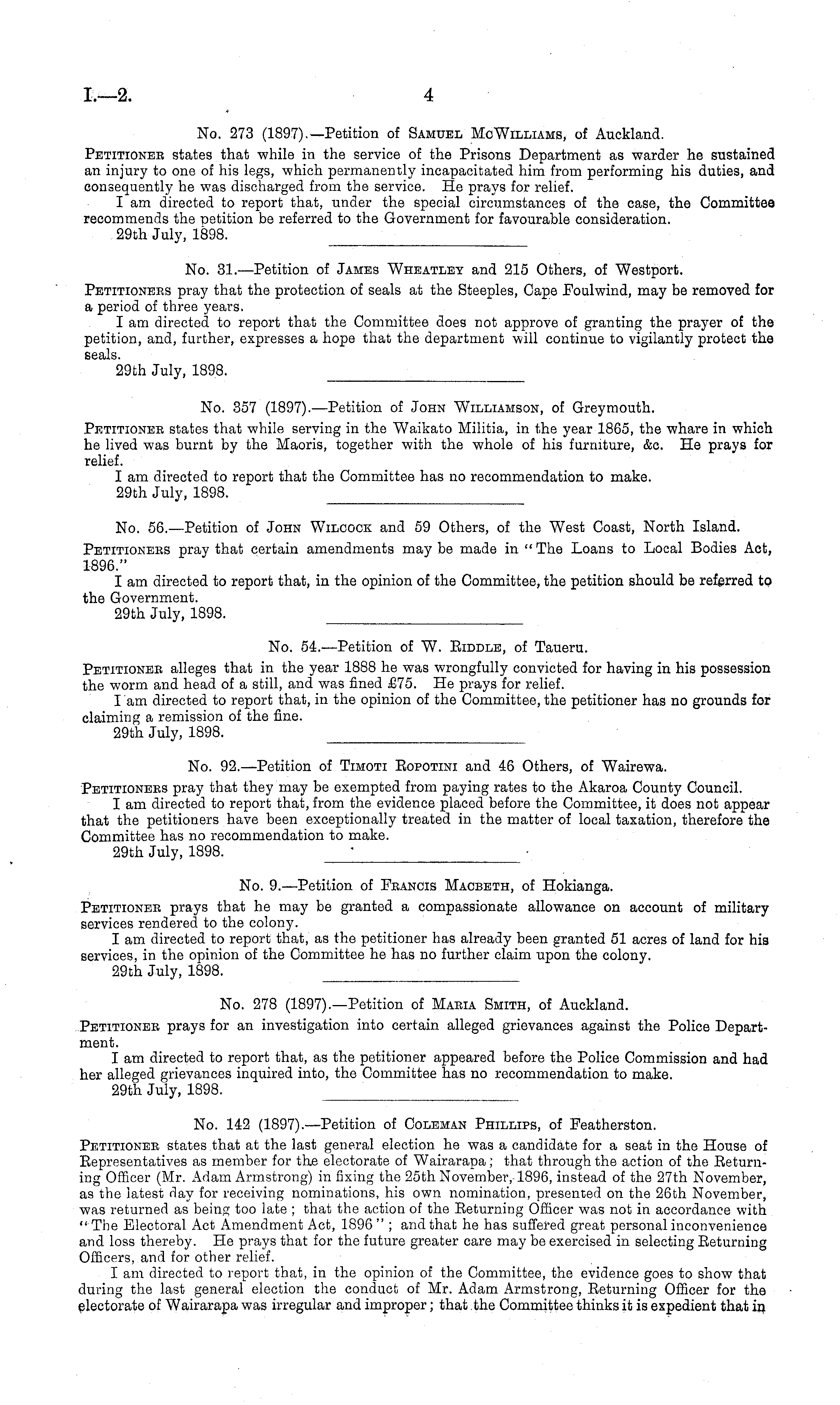 No. 273 (1897).—Petition of Samuel Me Williams, of Auckland. Petitioner states that while in the service of the Prisons Department as warder he sustained an injury to one of his legs, which permanently incapacitated him from performing his duties, and consequently he was discharged from the service. He prays for relief. I am directed to report that, under the special circumstances of the ease, the Committee recommends the petition be referred to the Government for favourable consideration. 29th July, 1898.