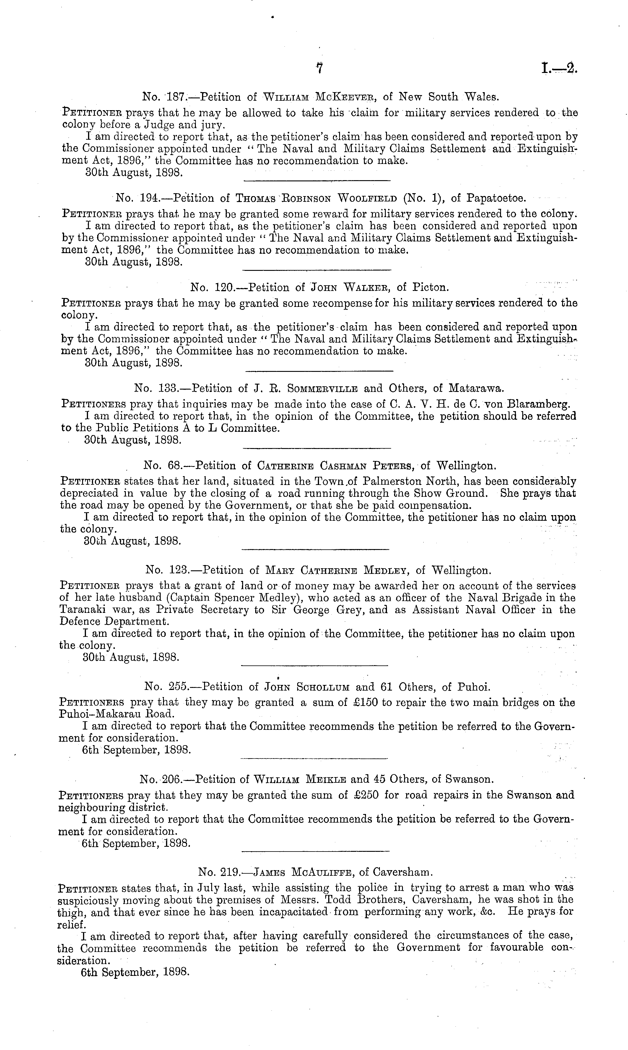 No. 120.—Petition of John Walker, of Picton. Petitioner prays that he may be granted some recompense for his military services rendered to the colony. I am directed to report that, as the petitioner's claim has been considered and reported upon by the Commissioner appointed under " The Naval and Military Claims Settlement and Extinguish' ment Act, 1896," the Committee has no recommend.ation to make. 30th August, 1898.