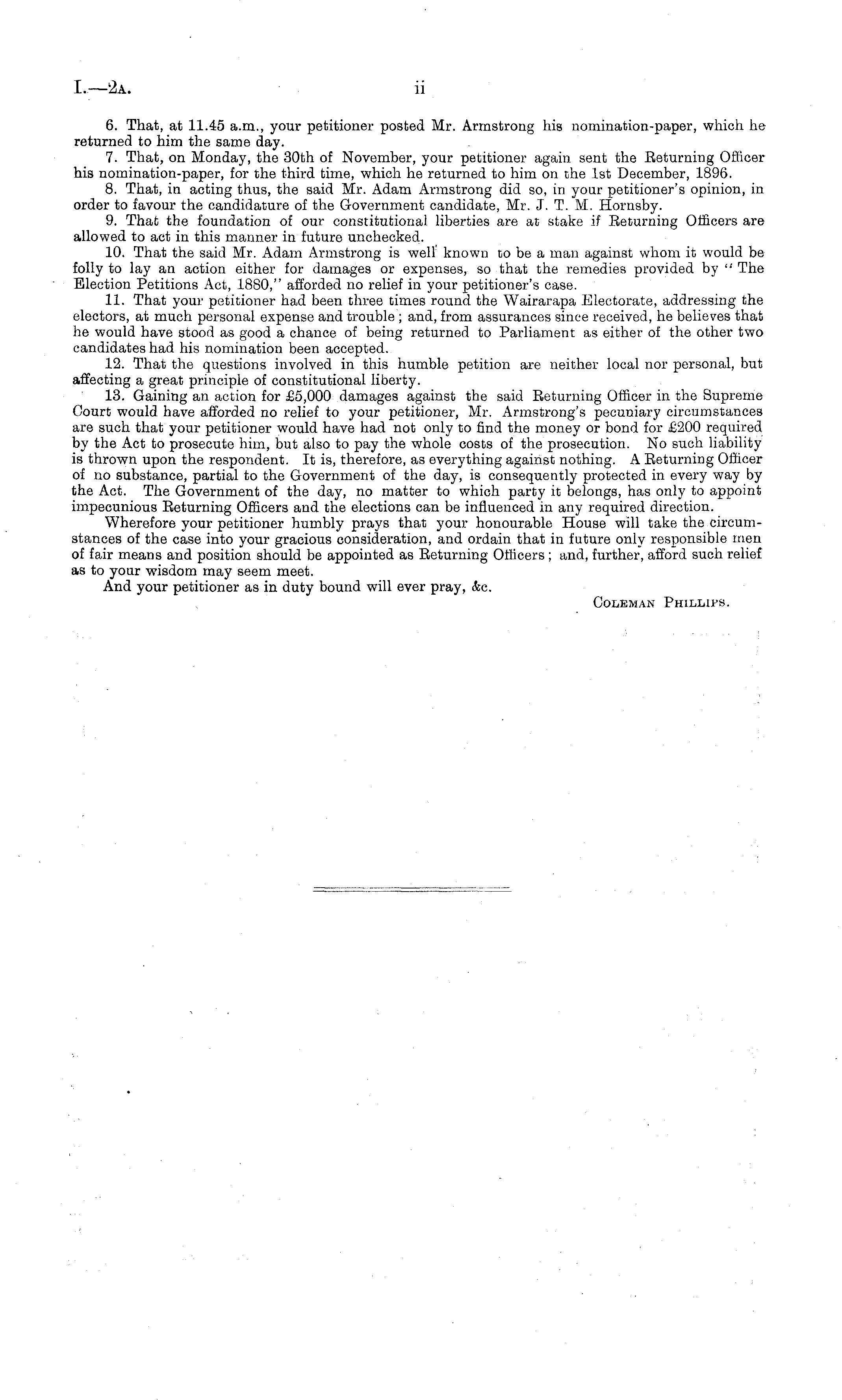 6. That, at 11.45 a.m., your petitioner posted Mr. Armstrong his nomination-paper, which he returned to him the same day. 7. That, on Monday, the 30th of November, your petitioner again sent the Eeturning Officer his nomination-paper, for the third time, which he returned to him on the Ist December, 1896. 8. That, in acting thus, the said Mr. Adam Armstrong did so, in your petitioner's opinion, in order to favour the candidature of the Government candidate, Mr. J. T. M. Hornsby. 9. That the foundation of our constitutional liberties are at; stake if Eeturning Officers are allowed to act in this manner in future unchecked. 10. That the said Mr. Adam Armstrong is well known to be a man against whom it would be folly to lay an action either for damages or expenses, so that the remedies provided by " The Election Petitions Act, 1880," afforded no relief in your petitioner's case. 11. That your petitioner had been three times round the Wairarapa Electorate, addressing the electors, at much personal expense and trouble ; and, from assurances since received, he believes that he would have stood as good a chance of being returned to Parliament as either of the other two candidates had his nomination been accepted. 12. That the questions involved in this humble petition are neither local nor personal, but affecting a great principle of constitutional liberty. 13. Gaining an action for £5,000 damages against the said Eeturning Officer in the Supreme Court would have afforded no relief to your petitioner, Mr. Armstrong's pecuniary circumstances are such that your petitioner would have had not only to find the money or bond for £200 required by the Act to prosecute him, but also to pay the whole costs of the prosecution. No such liability is thrown upon the respondent. It is, therefore, as everything against nothing. A Eeturning Officer of no substance, partial to the Government of the day, is consequently protected in every way by the Act. The Government of the day, no matter to which party it belongs, has only to appoint impecunious Eeturning Officers and the elections can be influenced in any required direction. Wherefore your petitioner humbly prays that your honourable House will take the circumstances of the case into your gracious consideration, and ordain that in future only responsible men of fair means and position should be appointed as Eeturning Officers ; and, further, afford such relief as to your wisdom may seem meet. And your petitioner as in duty bound will ever pray, &c. Coleman Phillips.