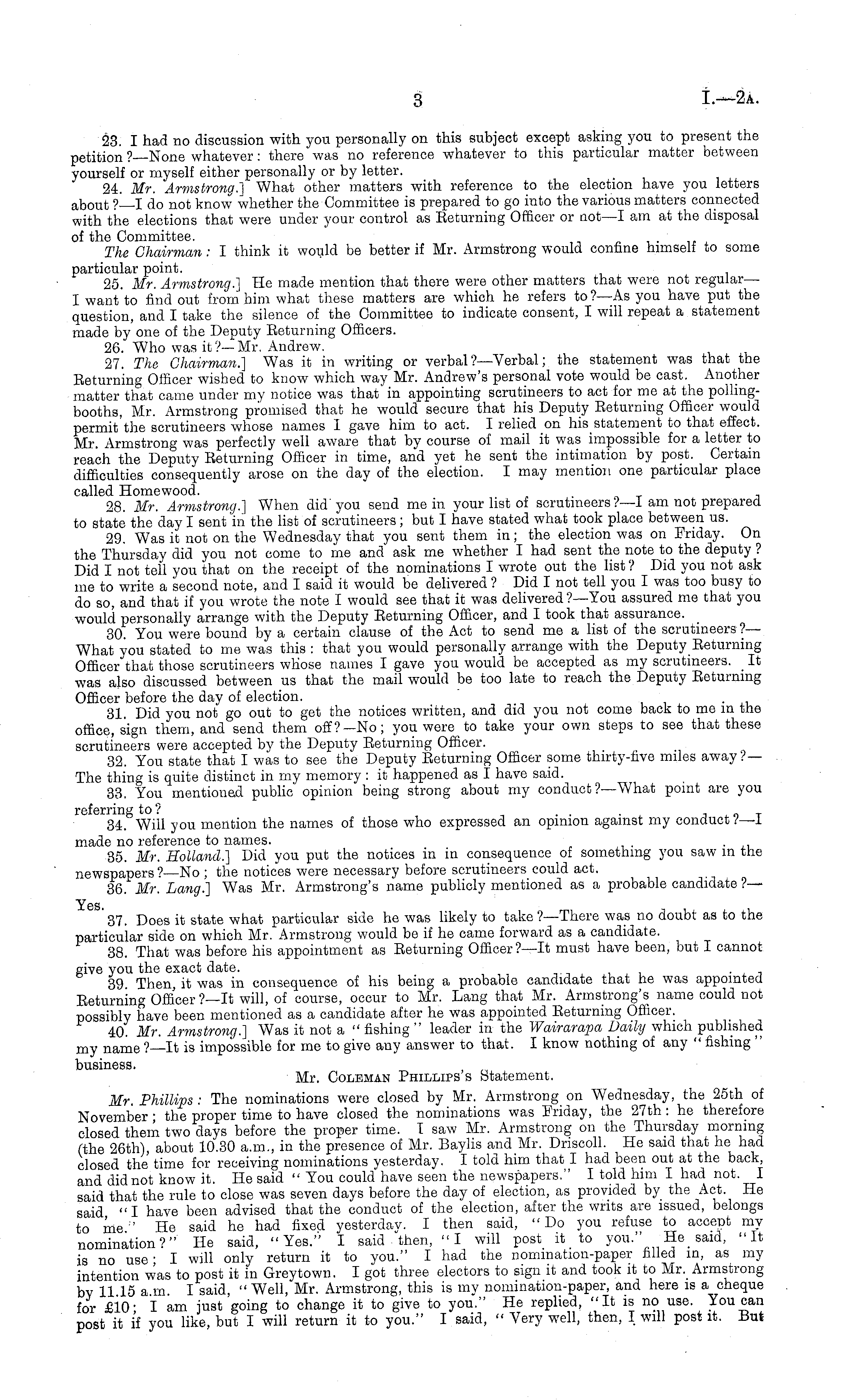 23. I had no discussion with you personally on this subject except asking you to present the petition ? None whatever: there was no reference whatever to this particular matter between yourself or myself either personally or by letter. 24. Mr. Armstrong,] What other matters with reference to the election have you letters about?—l do not know whether the Committee is prepared to go into the various matters connected with the elections that were under your control as Eeturning Officer or not —I am at the disposal of the Committee. . . The Chairman: I think it would be better if Mr. Armstrong would confine himself to some particular point. 25. Mr. Armstrong.] He made mention that there were other matters that were not regular— I want to find out from him what these matters are which he refers to ?—As you have put the question, and I take the silence of the Committee to indicate consent, I will repeat a statement made by one of the Deputy Eeturning Officers. 26. Who was it?— Mr. Andrew. 27. The Chairman.] Was it in writing or verbal? —Verbal; the statement was that the Eeturning Officer wished to know which way Mr. Andrew's personal vote would be cast. Another matter that came under my notice was that in appointing scrutineers to act for me at the pollingbooths, Mr. Armstrong promised that he would secure that his Deputy Eeturning Officer would permit'the scrutineers whose names I gave him to act. I relied on his statement to that effect. Mr. Armstrong was perfectly well aware that by course of mail it was impossible for a letter to reach the Deputy Eeturning Officer in time, and yet he sent the intimation by post. Certain difficulties consequently arose on the day of the election. I may mention one particular place called Homewood. 28. Mr. Armstrong.] When did'you send me in your list of scrutineers ?—I am not prepared to state the day I sent in the list of scrutineers; but I have stated what took place between us. 29. Was it not on the Wednesday that you sent them in; the election was on Friday. On the Thursday did you not come to me and ask me whether I had sent the note to the deputy ? Did I not tell you that on the receipt of the nominations I wrote out the list ? Did you not ask me to write a second note, and I said it would be delivered ? Did I not tell you I was too busy to do so, and that if you wrote the note I would see that it was delivered ?—You assured me that you would personally arrange with the Deputy Eeturning Officer, and I took that assurance. 30. You were bound by a certain clause of the Act to send me a list of the scrutineers ?— What you stated to me was this : that you would personally arrange with the Deputy Eeturning Officer that those scrutineers whose names I gave you would be accepted as my scrutineers. _ It was also discussed between us that the mail would be too late to reach the Deputy Eeturning Officer before the day of election. 31. Did you not go out to get the notices written, and did you not come back to me m the office, sign them, and send them off?—No; you were to take your own steps to see that these scrutineers were accepted by the Deputy Eeturning Officer. 32. You state that I was to see the Deputy Eeturning Officer some thirty-five miles away?— The thing is quite distinct in my memory : it happened as I have said. 33. You mentioned public opinion being strong about my conduct? —What point are you referring to ? ~'... , . a T 34. Will you mention the names of those who expressed an opinion against my conduct I—l made no reference to names. 35. Mr. Holland.] Did you put the notices in in consequence of something you saw in the newspapers? —No ; the notices were necessary before scrutineers could act. 36. Mr. Lang.] Was Mr. Armstrong's name publicly mentioned as a probable candidate ?— Yes 37. Does it state what particular side he was likely to take ?—There was no doubt as to the particular side on which Mr. Armstrong would be if he came forward as a candidate. 38. That was before his appointment as Eeturning Officer?—lt must have been, but I cannot give you the exact date. 39. Then, it was in consequence of his being a probable candidate that he was appointed Eeturning Officer?—lt will, of course, occur to Mr. Lang that Mr. Armstrong's name could not possibly have been mentioned as a candidate after he was appointed Eeturning Officer. 40. Mr. Armstrong.] Was it not a " fishing " leader in the Wairarapa Daily which published my name ?—lt is impossible for me to give any answer to that. I know nothing of any " fishing " business. Mr. Coleman Phillips s Statement. Mr. Phillips : The nominations were closed by Mr. Armstrong on Wednesday, the 25th of November ; the proper time to have closed the nominations was Friday, the 27th: he therefore closed them two days before the proper time. I saw Mr. Armstrong on the Thursday morning (the 26th), about 10.30 a.m., in the presence of Mr. Baylis and Mr. Driscoll. He said that he had closed the time for receiving nominations yesterday. I told him that I had been out at the back, and did not know it. He said " You could have seen the newspapers." I told him I had not. I said that the rule to close was seven days before the day of election, as provided by the Act. He said "I have been advised that the conduct of the election, after the writs are issued, belongs to me. He said he had fixed yesterday. I then said, "Do you refuse to accept my nomination?" He said, "Yes." I said then, " I will post it to you." He _ said, "It is no use ■ I will only return it to you." I had the nomination-paper filled in, as my intention was to post it in Grey town. I got three electors to sign it and took it to Mr._ Armstrong by 11 15 a m I said, " Well, Mr. Armstrong, this is my nomination-paper, and here is a cheque for £10- I am just going to change it to give to you." He replied, "It is no use. You can post it if you like, but I will return it to you." I said, " Very well, then, I will post it