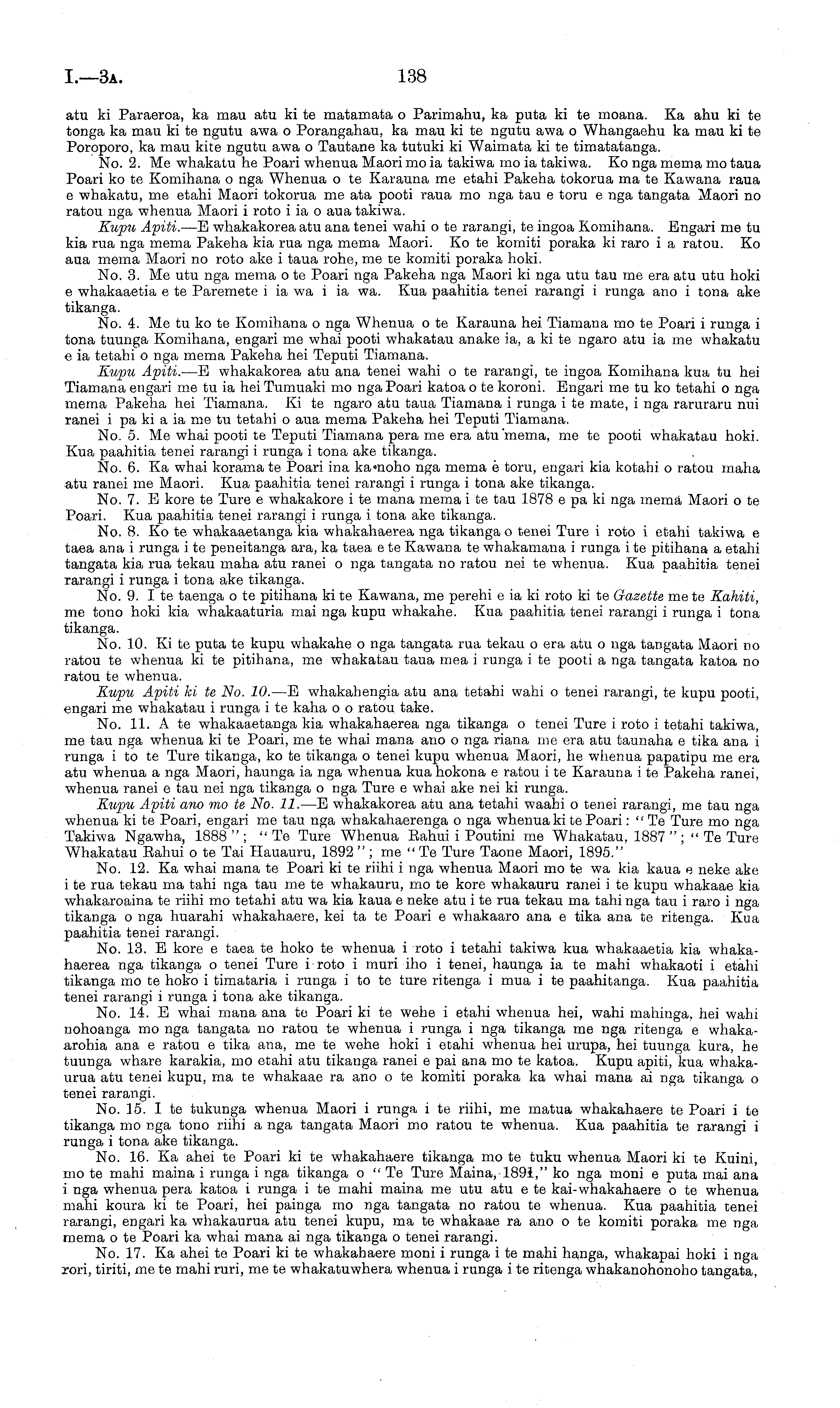 atu ki Paraeroa, ka mau atu kite matamata o Parimahu, ka puta kite moana. Ka ahu kite tonga ka mau kite ngutu awa o Porangahau, ka mau kite ngutu awa o Whangaehu ka mau kite Poroporo, ka mau kite ngutu awa o Tautane ka tutuki ki Waimata kite timatatanga. No. 2. Me whakatu he Poari whenua Maori mo ia takiwa mo ia takiwa. Ko nga mema mo taua Poari ko te Komihana o nga Whenua o te Karauna me etahi Pakeha tokorua ma te Kawana raua c whakatu, me etahi Maori tokorua me ata pooti raua mo nga tau c toru c nga tangata Maori no ratou nga whenua Maori i roto i ia o aua takiwa. Kupu Apiti. —E whakakorea atu ana tenei wahi ote rarangi, te ingoa Komihana. Engari me tv kia rua nga mema Pakeha kia rua nga mema Maori. Ko te komiti poraka ki raro i a ratou. Ko aua mema Maori no roto ake i taua rohe, me te komiti poraka hoki. No. 3. Me utu nga mema ote Poari nga Pakeha nga Maori ki nga utu tau me era atu utu hoki c whakaaetia etc Paremete i ia wa i ia wa. Kua paahitia tenei rarangi i runga ano i tona ake tikanga. No. 4. Me tv ko te Komihana o nga Whenua o te Karauna hei Tiamana mo te Poari i runga i tona tuunga Komihana, engari me whai pooti whakatau anake ia, a kite ngaro atu ia me whakatu c ia tetahi o nga mema Pakeha hei Teputi Tiamana. Kupu Apiti. —E whakakorea atu ana tenei wahi o te rarangi, te ingoa Komihana kua tv hei Tiamana engari me tv ia hei Tumuaki mo nga Poari katoa ote koroni. Engari me tv ko tetahi o nga mema Pakeha hei Tiamana. Xi te ngaro atu taua Tiamana i runga ite mate, i nga raruraru nui ranei i pa ki a ia me tv tetahi o aua mema Pakeha hei Teputi Tiamana. No. 5. Me whai pooti te Teputi Tiamana pera me era atu mema, me te pooti whakatau hoki. Kua paahitia tenei rarangi i runga i tona ake tikanga. No. 6. Ka whai korama te Poari ma ka -noho nga mema c toru, engari kia kotahi o ratou maha atu ranei me Maori. Kua paahitia tenei rarangi i runga i tona ake tikanga. No. 7. E kore te Ture c whakakore i te mana mema i te tau 1878 c pa ki nga mema Maori o te Poari. Kua paahitia tenei rarangi i runga i tona ake tikanga. No. 8. Ko te whakaaetanga kia whakahaerea nga tikanga o tenei Ture i roto i etahi takiwa c taea ana i runga i te peneitanga ara, ka taea c te Kawana te whakamana i runga i te pitihana a etahi tangata kia rua tekau maha atu ranei o nga tangata no ratou nei te whenua. Kua paahitia tenei rarangi i runga i tona ake tikanga. No. 9. I te taenga o te pitihana kite Kawana, me perehi c ia ki roto kite Gazette me te Kahiti, me tono hoki kia whakaaturia mai nga kupu whakahe. Kua paahitia tenei rarangi i runga i tona tikanga. No. 10. Xi te puta te kupu whakahe o nga tangata rua tekau o era atu o nga tangata Maori no ratou te whenua kite pitihana, me whakatau taua mea i runga i te pooti a nga tangata katoa no ratou te whenua. Kupu Apiti kite No. 10. —E whakahengia atu ana tetahi wahi o tenei rarangi, te kupu pooti, engari me whakatau i runga i te kaha o o ratou take. No. 11. A te whakaaetanga kia whakahaerea nga tikanga o tenei Ture i roto i tetahi takiwa, me tau nga whenua kite Poari, me te whai mana ano o nga riana me era atu taunaha c tika ana i runga i to te Ture tikanga, ko te tikanga o tenei kupu whenua Maori, he whenua papatipu me era atu whenua a nga Maori, haunga ia nga whenua kua hokona c ratou i te Karauna i te Pakeha ranei, whenua ranei c tau nei nga tikanga o nga Ture c whai ake nei ki runga. Kupu Apiti ano mo te No. 11. —E whakakorea atu ana tetahi waahi o tenei rarangi, me tau nga whenua kite Poari, engari me tau nga whakahaerenga o nga whenua kite Poari: "Te Ture mo nga Takiwa Ngawha, 1888"; "Te Ture Whenua Rahui i Poutini me Whakatau, 1887"; "Te Ture Whakatau Eahui o te Tai Hauauru, 1892 " ; me " Te Ture Taone Maori, 1895." No. 12. Ka whai mana te Poari kite riihi i nga whenua Maori mo te wa kia kaua c neke ake i te rua tekau ma tahi nga tau me te whakauru, mo te kore whakauru ranei i te kupu whakaae kia whakaroaina te riihi mo tetahi atu wa kia kaua c neke atu i te rua tekau ma tahi nga tau i raro i nga tikanga o nga huarahi whakahaere, kei ta te Poari c whakaaro ana c tika ana te ritenga. Kua paahitia tenei rarangi. No. 13. E kore c taea te hoko te whenua i roto i tetahi takiwa kua whakaaetia kia whakahaerea nga tikanga o tenei Ture i roto i muri iho i tenei, haunga ia te mahi whakaoti i etahi tikanga mo te hoko i timataria i runga i to te ture ritenga i mua i te paahitanga. Kua paahitia tenei rarangi i runga i tona ake tikanga. No. 14. E whai mana ana te Poari kite wehe i etahi whenua hei, wahi mahinga, hei wahi nohoanga mo nga tangata no ratou te whenua i runga i nga tikanga me nga ritenga c whakaarohia ana c ratou c tika ana, me te wehe hoki i etahi whenua hei urupa, hei tuunga kura, he tuunga whare karakia, mo etahi atu tikanga ranei c pai ana mo te katoa. Kupu apiti, kua whakaurua atu tenei kupu, ma te whakaae ra ano o te komiti poraka ka whai mana ai nga tikanga o tenei rarangi. No. 15. I te tukunga whenua Maori i runga i te riihi, me matua whakahaere te Poari i te tikanga mo nga tono riihi a nga tangata Maori mo ratou te whenua. Kua paahitia te rarangi i runga i tona ake tikanga. No. 16. Ka ahei te Poari kite whakahaere tikanga mo te tuku whenua Maori kite Kuini, mo te mahi mama i runga i nga tikanga o " Te Ture Mama, 1891," ko nga moni c puta mai ana i nga whenua pera katoa i runga i te mahi mama me utu atu c te kai-whakahaere o te whenua mahi koura kite Poari, hei painga mo nga tangata no ratou te whenua. Kua paahitia tenei rarangi, engari ka whakaurua atu tenei kupu, ma te whakaae ra ano o te komiti poraka me nga mema o te Poari ka whai mana ai nga tikanga o tenei rarangi. No. 17. Ka ahei te Poari kite whakahaere moni i runga i te mahi hanga, whakapai hoki i nga rori, tiriti, me te mahi ruri, me te whakatuwhera whenua i runga i te ritenga whakanohonoho tangata,