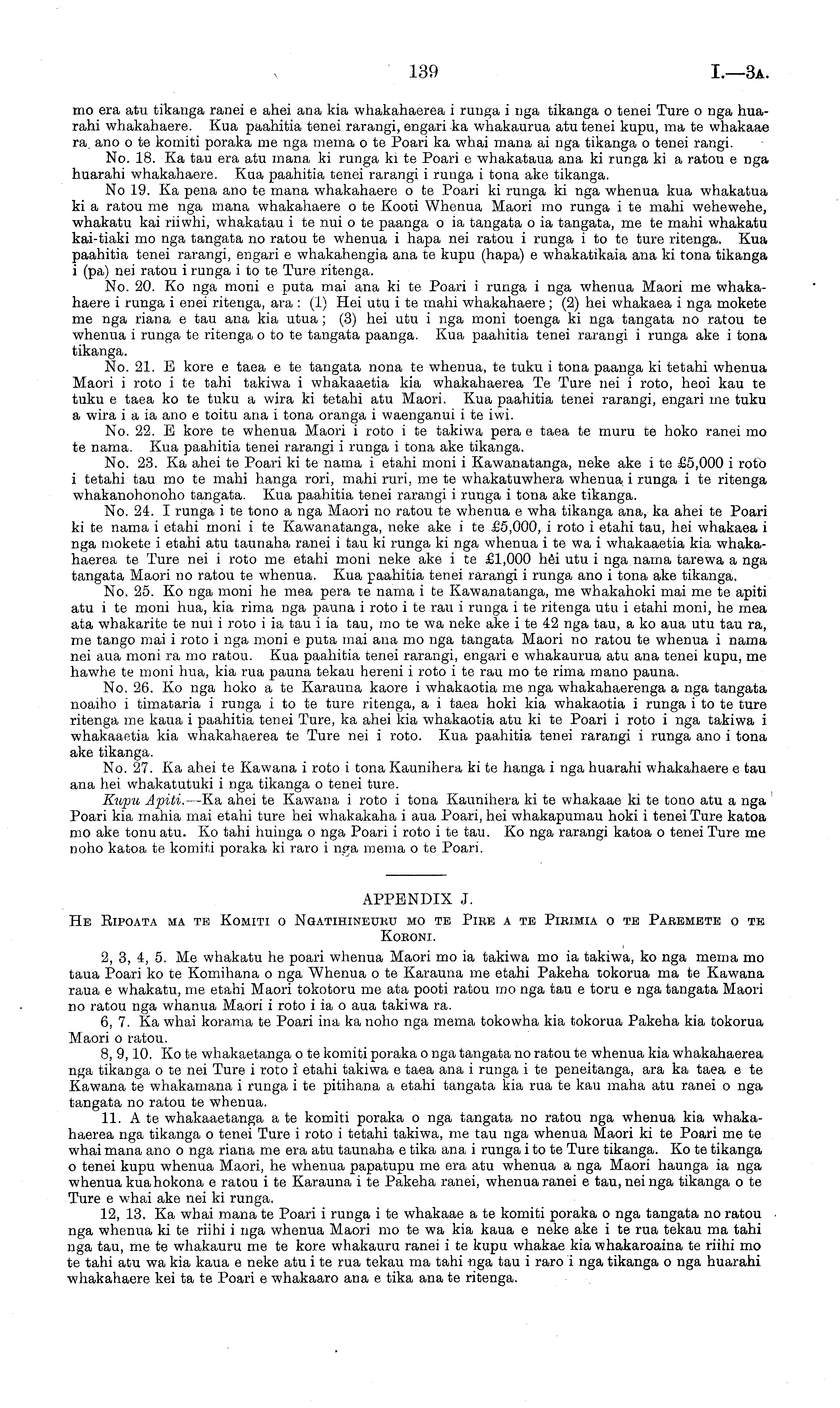 APPENDIX J. He Eipoata ma te Komiti o Ngatihineuru mo te Pire a te Pirimia o te Paremete o te Koroni. 2, 3, 4, 5. Me whakatu he poari whenua Maori mo ia takiwa mo ia takiwa, ko nga mema mo taua Poari ko te Komihana o nga Whenua o te Karauna me etahi Pakeha tokorua ma te Kawana raua c whakatu, me etahi Maori tokotoru me ata pooti ratou mo nga tau c toru c nga tangata Maori no ratou nga whanua Maori i roto i ia o aua takiwa ra. 6, 7. Ka whai korama te Poari ma ka noho nga mema tokowha kia tokorua Pakeha kia tokorua Maori o ratou. 8, 9,10. Ko te whakaetanga o te komiti poraka o nga tangata no ratou te whenua kia whakahaerea nga tikanga o te nei Ture i roto i etahi takiwa c taea ana i runga i te peneitanga, ara ka taea c te Kawana te whakamana i runga i te pitihana a etahi tangata kia rua te kau maha atu ranei o nga tangata no ratou te whenua. 11. A te whakaaetanga a te komiti poraka o nga tangata no ratou nga whenua kia whakahaerea nga tikanga o tenei Ture i roto i tetahi takiwa, me tau nga whenua Maori kite Poari me te whai mana ano o nga riana me era atu taunaha c tika ana i runga ito te Ture tikanga. Ko te tikanga o tenei kupu whenua Maori, he whenua papatupu me era atu whenua a nga Maori haunga ia nga whenua kua hokona c ratou i te Karauna i te Pakeha ranei, whenua ranei c tau, nei nga tikanga o te Ture c whai ake nei ki runga, 12, 13. Ka whai mana te Poari i runga i te whakaae a te komiti poraka o nga tangata no ratou nga whenua kite riihi i nga whenua Maori mo te wa kia kaua c neke ake i te rua tekau ma tahi nga tau, me te whakauru me te kore whakauru ranei i te kupu whakae kia whakaroaina te riihi mo te tahi atu wa kia kaua c neke atu i te rua tekau ma tahi -nga tau i raro i nga tikanga o nga huarahi whakahaere kei ta te Poari c whakaaro ana c tika ana te ritenga.