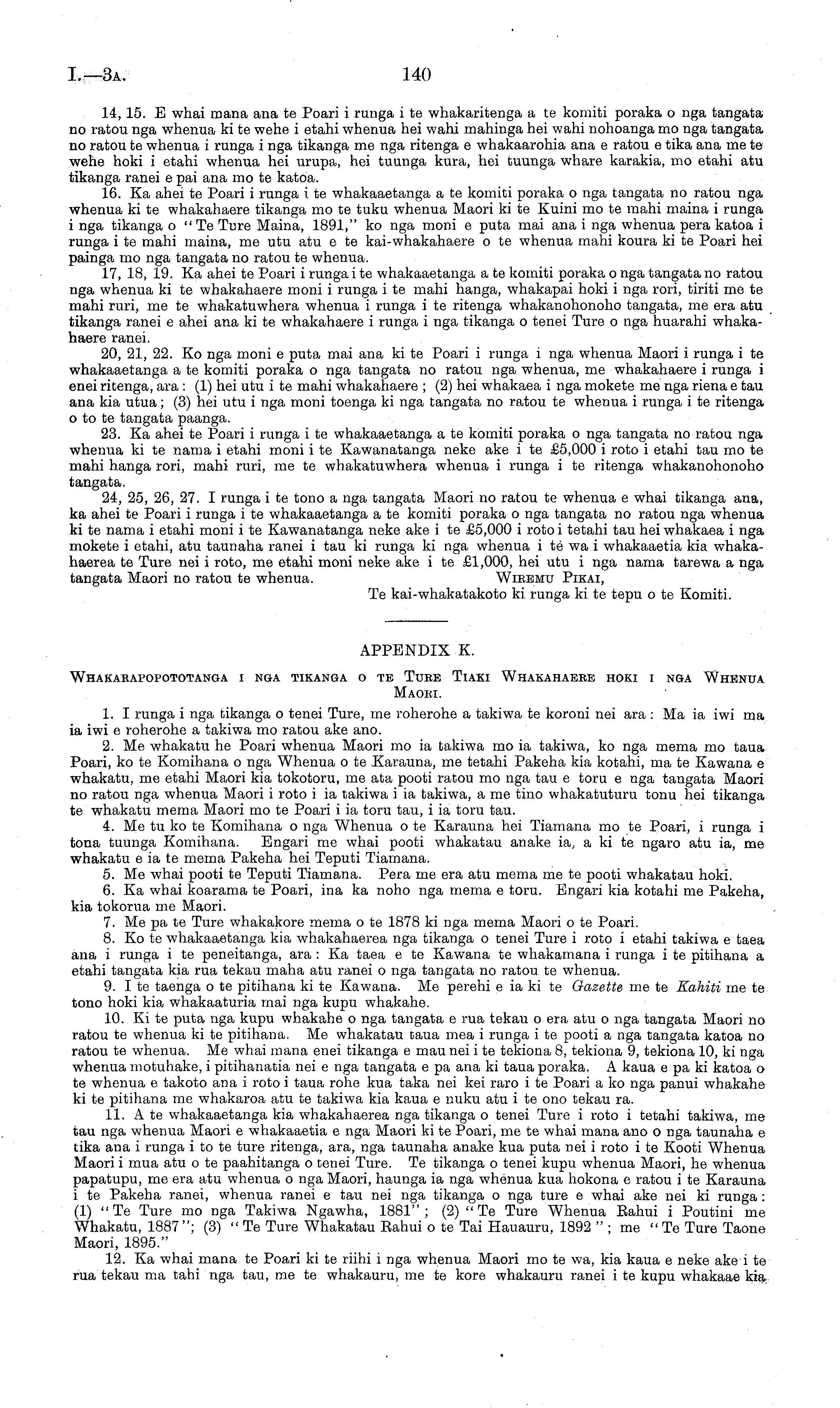 APPENDIX K. Whakarapopototanga i nga tikanga o te Ture Tiaki Whakahaere hoki i nga Whenua Maori. 1. I runga i nga tikanga o tenei Ture, me roherohe a takiwa te koroni nei ara : Ma ia iwi ma ia iwi c roherohe a takiwa mo ratou ake ano. 2. Me whakatu he Poari whenua Maori mo ia takiwa mo ia takiwa, ko nga mema mo taua Poari, ko te Komihana o nga Whenua o te Karauna, me tetahi Pakeha kia kotahi, ma te Kawana c whakatu, me etahi Maori kia tokotoru, me ata pooti ratou mo nga tau c toru c nga tangata Maori no ratou nga whenua Maori i roto i ia takiwa i ia takiwa, a me tino whakatuturu tonu hei tikanga te whakatu mema Maori mo te Poari i ia toru tau, i ia toru tau. 4. Me tv ko te Komihana o nga Whenua o te Karauna hei Tiamana mo te Poari, i runga i tona tuunga Komihana. Engari me whai pooti whakatau anake ia, aki te ngaro atu ia, me whakatu c ia te mema Pakeha hei Teputi Tiamana. 5. Me whai pooti te Teputi Tiamana. Pera me era atu mema me te pooti whakatau hoki. 6. Ka whai koarama te Poari, ma ka noho nga mema c toru. Engari kia kotahi me Pakeha, kia tokorua me Maori. 7. Me pa te Ture whakakore mema o te 1878 ki nga mema Maori o te Poari. 8. Ko te whakaaetanga kia whakahaerea nga tikanga o tenei Ture i roto i etahi takiwa c taea ana i runga i te peneitanga, ara : Ka taea c te Kawana te whakamana i runga i te pitihana a etahi tangata kia rua tekau maha atu ranei o nga tangata no ratou te whenua. 9. Ite taenga ote pitihana kite Kawana. Me perehi eia kite Gazette me te Kahiti me te tono hoki kia whakaaturia mai nga kupu whakahe. 10. Xi te puta nga kupu whakahe o nga tangata c rua tekau o era atu o nga tangata Maori no ratou te whenua kite pitihana. Me whakatau taua mea i runga ite pooti a nga tangata katoa no ratou te whenua. Me whai mana enei tikanga c mau nei ite tekiona 8, tekiona 9, tekiona 10, ki nga whenua motuhake, i pitihanatia nei c nga tangata epa ana ki taua poraka. A kaua epa ki katoa o te whenua c takoto ana i roto i taua rohe kua taka nei kei raro i te Poari a ko nga panui whakahe kite pitihana me whakaroa atu te takiwa kia kaua c nuku atu ite ono tekau ra. 11. A te whakaaetanga kia whakahaerea nga tikanga o tenei Ture i roto i tetahi takiwa, me tau nga whenua Maori c whakaaetia c nga Maori kite Poari, me te whai mana ano o nga taunaha c tika ana i runga i to te ture ritenga, ara, nga taunaha anake kua puta nei i roto i te Kooti Whenua Maori i mua atu ote paahitanga o tenei Ture. Te tikanga o tenei kupu whenua Maori, he whenua papatupu, me era atu whenua o nga Maori, haunga ia nga whenua kua hokona c ratou i te Karauna i te Pakeha ranei, whenua ranei c tau nei nga tikanga o nga ture c whai ake nei ki runga : (1) "Te Ture mo nga Takiwa Ngawha, 1881"; (2) "Te Ture Whenua Eahui i Poutini me Whakatu, 1887 "; (3) " Te Ture Whakatau Eahui o te Tai Hauauru, 1892 " ; me "Te Ture Taone Maori, 1895." 12. Ka whai mana te Poari kite riihi i nga whenua Maori mo te wa, kia kaua c neke ake ite rua tekau ma tahi nga tau, me te whakauru, me te kore whakauru ranei i te kupu whakaae kia