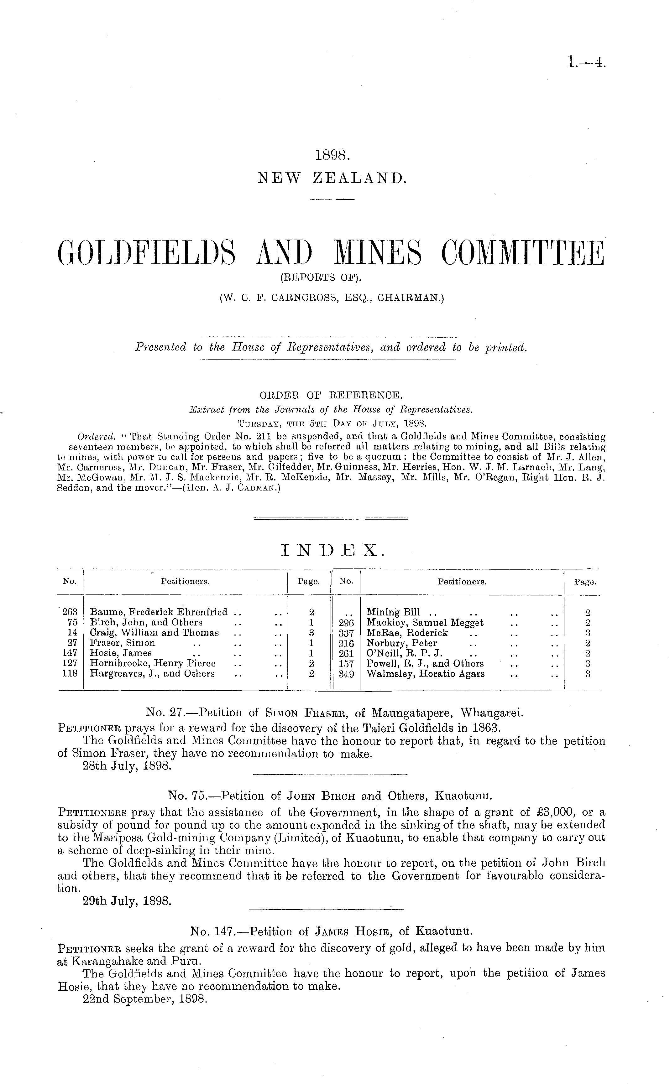 ORDER OP REFERENCE. Extract from the Journals of the House of Representatives. Tuesday, the sth Day ov July, 1898. Ordered, " That Standing Order No. 211 be suspended, and that a Goldfields and Mines Committee, consisting seventeen members, be appointed, to which shall be referred all matters relating to mining, and all Bills relating to mines, with power to call for persons and papers; five to be a quorum : the Committee to consist of Mr. J. Allen, Mr. Carncross, Mr. Duncan, Mr. Eraser, Mr. Gilfedder, Mr. Guinness, Mr. Hemes, Hon. W. J. M. La,rnaeh, Mr. Lang, Mr. McGowau, Mr. M. J. S. Mackenzie, Mr. R. McKenzie, Mr. Massey, Mr. Mills, Mr. O'Regan, Right Hon. R. J. Seddon, and the mover." —(Hon. A. J. Gadman.)