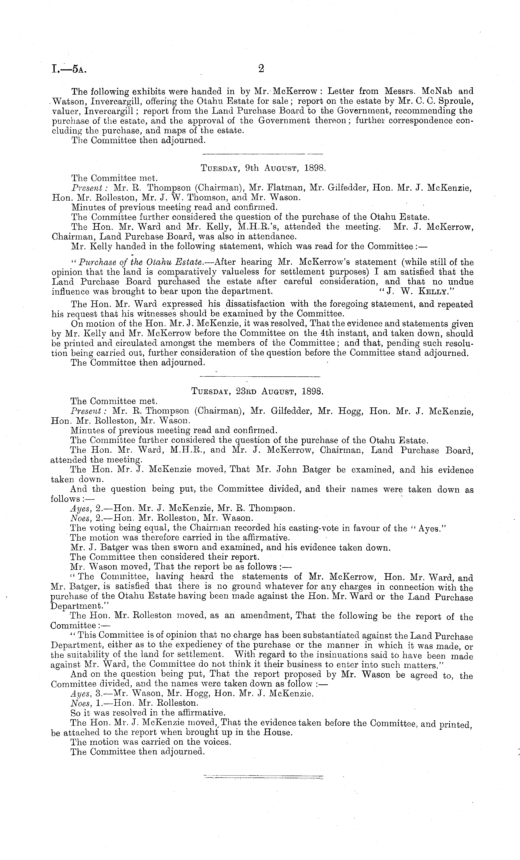 Tuesday, 9th August, 1898. The Committee met. Present: Mr. E. Thompson (Chairman), Mr. Flatman, Mr. Gilfedder, Hon. Mr. J. McKenzie, Hon. Mr. Eolleston, Mr. J. W. Thomson, and Mr. Wason. Minutes of previous meeting read and confirmed. The Committee further considered the question of the purchase of the Otahu Estate. The Hon. Mr. Ward and Mr. Kelly, M.H.E.'s, attended the meeting. Mr. J. McKerrow, Chairman, Land Purchase Board, was also in attendance. Mr. Kelly handed in the following statement, which was read for the Committee :— " Purchase of the Otahu Estate. —After hearing Mr. McKerrow's statement (while still of the opinion that the land is comparatively valueless for settlement purposes) I am satisfied that the Land Purchase Board purchased the estate after careful consideration, and that no undue influence was brought to bear upon the department. "J. W. Kelly." The Hon. Mr. Ward expressed his dissatisfaction with the foregoing statement, and repeated his request that his witnesses should be examined by the Committee. On motion of the Hon. Mr. 3. McKenzie, it was resolved, That the evidence and statements given by Mr. Kelly and Mr. McKerrow before the Committee on the 4th instant, and taken down, should be printed and circulated amongst the members of the Committee; and that, pending such resolution being carried out, further consideration of the question before the Committee stand adjourned. The Committee then adjourned.
