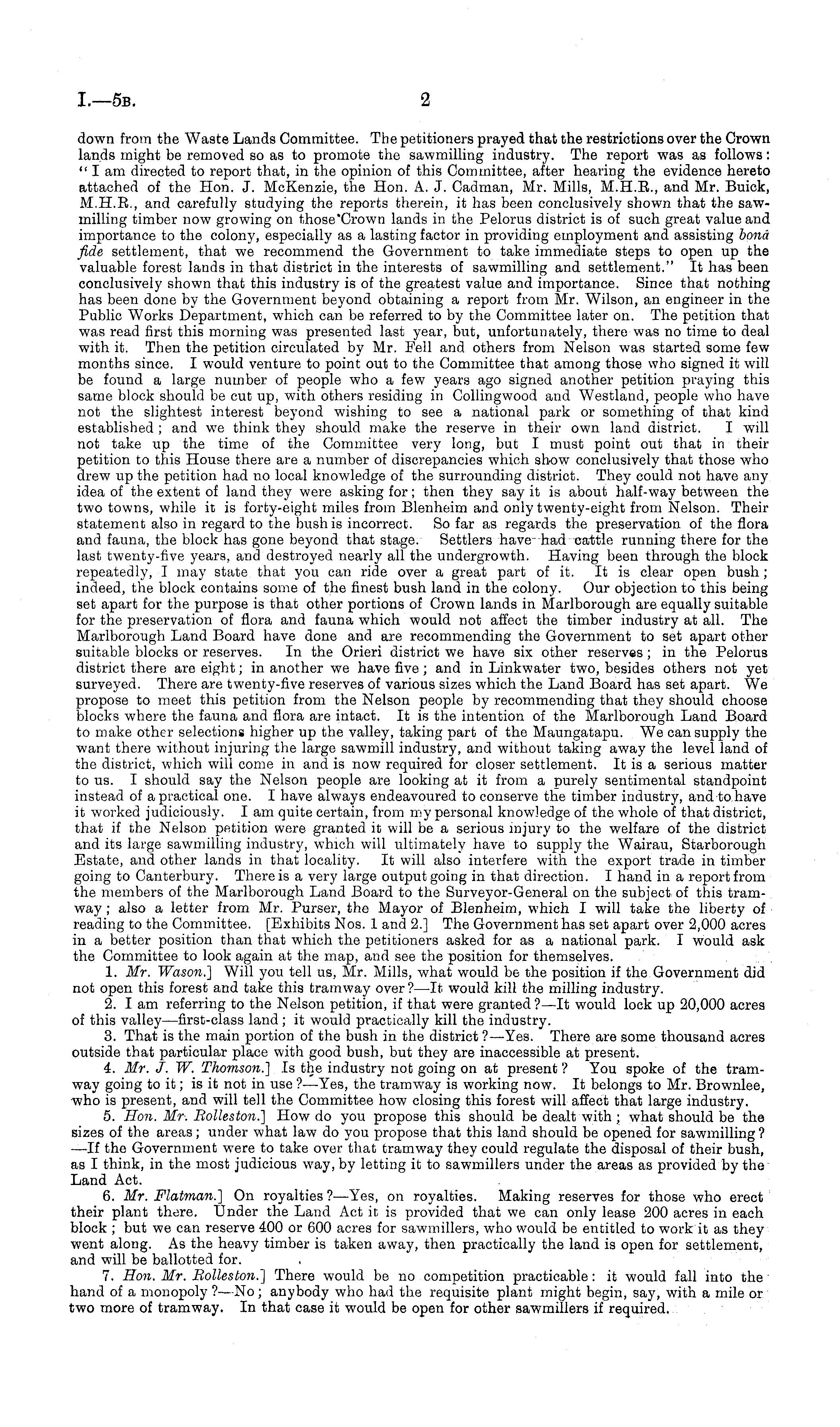 down from the Waste Lands Committee. The petitioners prayed that the restrictions over the Crown lands might be removed so as to promote the sawmilling industry. The report was as follows: " I am directed to report that, in the opinion of this Committee, after hearing the evidence hereto attached of the Hon. J. McKenzie, the Hon. A. J. Cadman, Mr. Mills, M.H.E., and Mr. Buick, M.H.E., and carefully studying the reports therein, it has been conclusively shown that the sawmilling timber now growing on those' Crown lands in the Pelorus district is of such great value and importance to the colony, especially as a lasting factor in providing employment and assisting bond fide settlement, that we recommend the Government to take immediate steps to open up the valuable forest lands in that district in the interests of sawmilling and settlement." It has been conclusively shown that this industry is of the greatest value and importance. Since that nothing has been done by the Government beyond obtaining a report from Mr. Wilson, an engineer in the Public Works Department, which can be referred to by the Committee later on. The petition that was read first this morning was presented last year, but, unfortunately, there was no time to deal with it. Then the petition circulated by Mr. Pell and others from Nelson was started some few months since. I would venture to point out to the Committee that among those who signed it will be found a large number of people who a few years ago signed another petition praying this same block should be cut up, with others residing in Collingwood and Westland, people who have not the slightest interest beyond wishing to see a national park or something of that kind established ; and we think they should make the reserve in their own land district. I will not take up the time of the Committee very long, but I must point out that in their petition to this House there are a number of discrepancies which show conclusively that those who drew up the petition had no local knowledge of the surrounding district. They could not have any idea of the extent of land they were asking for; then they say it is about half-way between the two towns, while it is forty-eight miles from Blenheim and only twenty-eight from Nelson. Their statement also in regard to the bush is incorrect. So far as regards the preservation of the flora and fauna, the block has gone beyond that stage. Settlers have had cattle running there for the last twenty-five years, and destroyed nearly all the undergrowth. Having been through the block repeatedly, I may state that you can ride over a great part of it. It is clear open bush ; indeed, the block contains some of the finest bush land in the colony. Our objection to this being set apart for the purpose is that other portions of Crown lands in Marlborough are equally suitable for the preservation of flora and fauna which would not affect the timber industry at all. The Marlborough Land Board have done and are recommending the Government to set apart other suitable blocks or reserves. In the Orieri district we have six other reserves ; in the Pelorus district there are eight; in another we have five ; and in Linkwater two, besides others not yet surveyed. There are twenty-five reserves of various sizes which the Land Board has set apart. We propose to meet this petition from the Nelson people by recommending that they should choose blocks where the fauna and flora are intact. It is the intention of the Marlborough Land Board to make other selections higher up the valley, taking part of the Maungatapu. We can supply the want there without injuring the large sawmill industry, and without taking away the level land of the district, which will come in and is now required for closer settlement. It is a serious matter to us. I should say the Nelson people are looking at it from a purely sentimental standpoint instead of a practical one. I have always endeavoured to conserve the timber industry, and tohave it worked judiciously. lam quite certain, from my personal knowledge of the whole of that district, that if the Nelson petition were granted it will be a serious injury to the welfare of the district and its large sawmilling industry, which will ultimately have to supply the Wairau, Starborough Estate, and other lands in that locality. It will also interfere with the export trade in timber going to Canterbury. There is a very large output going in that direction. I hand in a report from the members of the Marlborough Land Board to the Surveyor-General on the subject of this tramway ; also a letter from Mr. Purser, the Mayor of Blenheim, which I will take the liberty of reading to the Committee. [Exhibits Nos. 1 and 2.] The Government has set apart over 2,000 acres in a better position than that which the petitioners asked for as a national park. I would ask the Committee to look again at the map, and see the position for themselves. 1. Mr. Wason.] Will you tell us, Mr. Mills, what would be the position if the Government did not open this forest and take this tramway over ?—lt would kill the milling industry. 2. I am referring to the Nelson petition, if that were granted?—lt would lock up 20,000 acres of this valley —first-class land; it would practically kill the industry. 3. That is the main portion of the bush in the district ?—Yes. There are some thousand acres outside that particular place with good bush, but they are inaccessible at present. 4. Mr. J. W. Thomson.] Is the industry not going on at present ? You spoke of the tramway going to it; is it not in use ?—Yes, the tramway is working now. It belongs to Mr. Brownlee, who is present, and will tell the Committee how closing this forest will affect that large industry. 5. Hon. Mr. Bolleston.] How do you propose this should be dealt with ; what should be the sizes of the areas; under what law do you propose that this land should be opened for sawmilling ? —If the Government were to take over tha