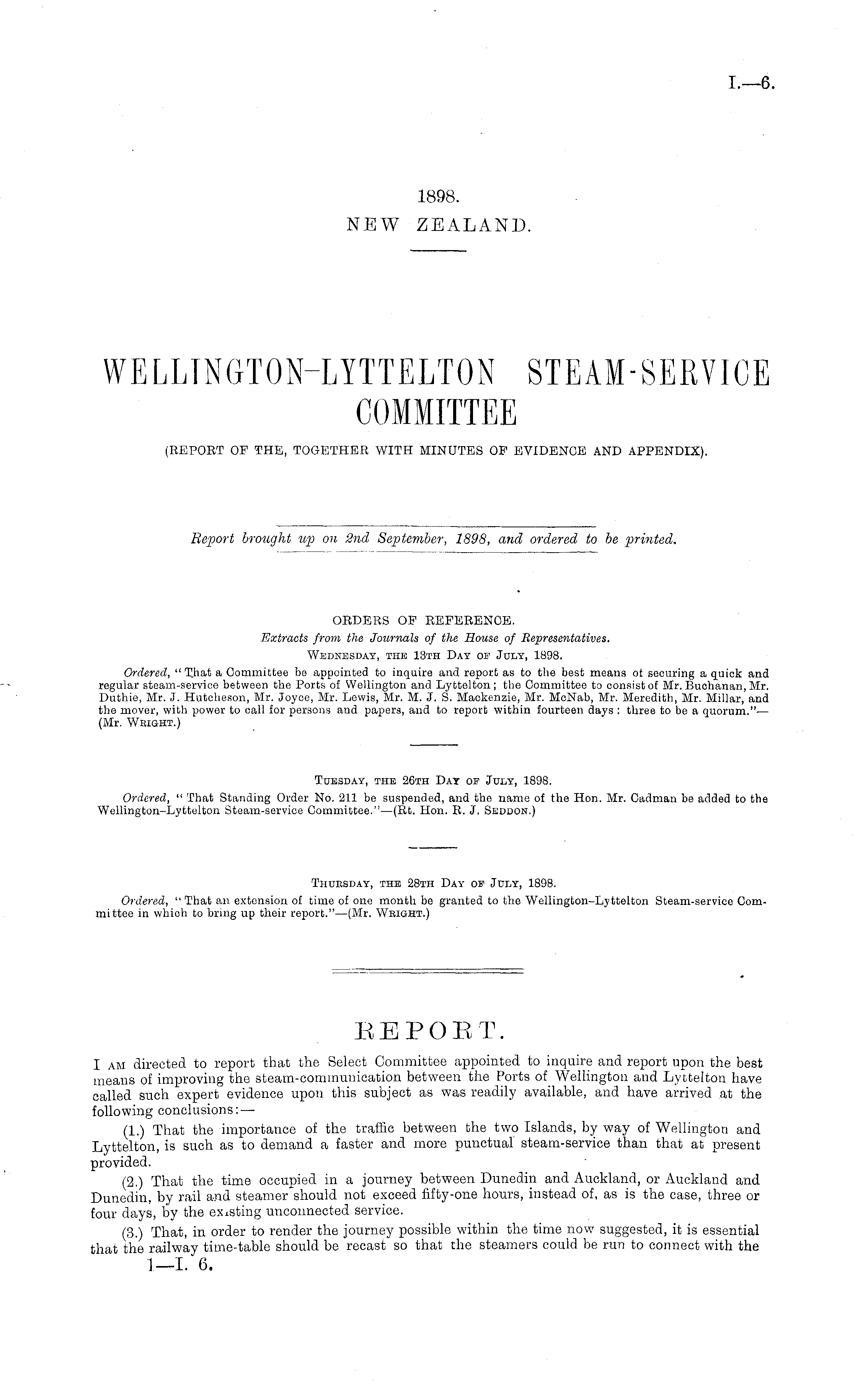 ORDERS OF REFERENCE. Extracts from the Journals of the House of Representatives. Wednesday, the 13th Day of July, 1898. Ordered, " That a Committee be appointed to inquire and report as to the best means ot securing a quick and regular steam-service between the Ports of Wellington and Lyttelton ; the Committee to consist of Mr. Buchanan, Mr. Duthie, Mr. J. Hutcheson, Mr. Joyce, Mr. Lewis, Mr. M. J. S. Mackenzie, Mr. McNab, Mr. Meredith, Mr. Millar, and the mover, with power to call for persons and papers, and to report within fourteen days : three to be a quorum."— (Mr. Wright.)