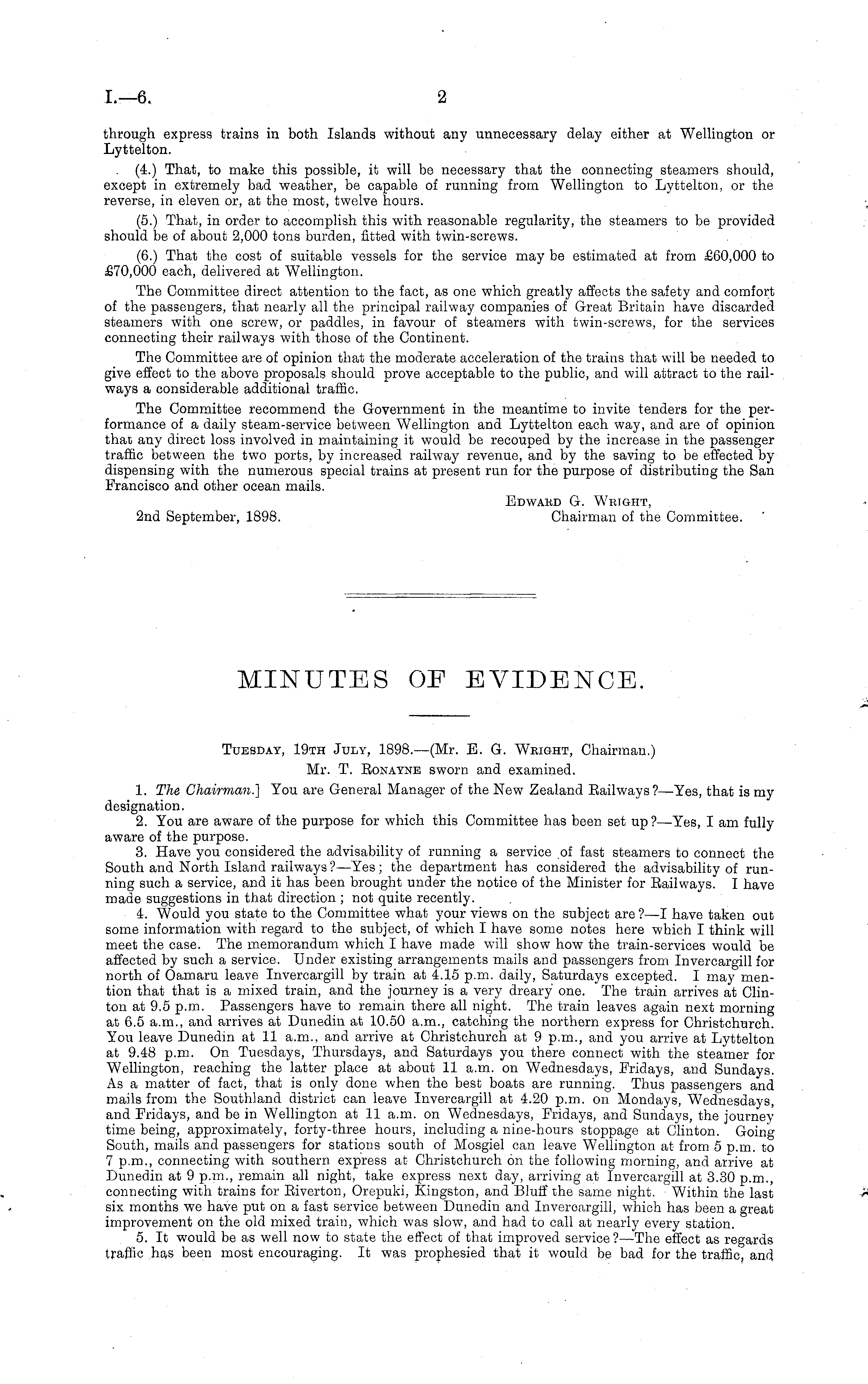 through express trains in both Islands without any unnecessary delay either at Wellington or Lyttelton. . (4.) That, to make this possible, it will be necessary that the connecting steamers should, except in extremely bad weather, be capable of running from Wellington to Lyttelton, or the reverse, in eleven or, at the most, twelve hours. (5.) That, in order to accomplish this with reasonable regularity, the steamers to be provided should be of about 2,000 tons burden, fitted with twin-screws. (6.) That the cost of suitable vessels for the service may be estimated at from £60,000 to £70,000 each, delivered at Wellington. The Committee direct attention to the fact, as one which greatly affects the safety and comfort of the passengers, that nearly all the principal railway companies of Great Britain have discarded steamers with one screw, or paddles, in favour of steamers with twin-screws, for the services connecting their railways with those of the Continent. The Committee are of opinion that the moderate acceleration of the trains that will be needed to give effect to the above proposals should prove acceptable to the public, and will attract to the railways a considerable additional traffic. The Committee recommend the Government in the meantime to invite tenders for the performance of a daily steam-service between Wellington and Lyttelton each way, and are of opinion that any direct loss involved in maintaining it would be recouped by the increase in the passenger traffic between the two ports, by increased railway revenue, and by the saving to be effected by dispensing with the numerous special trains at present run for the purpose of distributing the San Francisco and other ocean mails. Edwamd G. Weight, 2nd September, 1898. Chairman of the Committee.