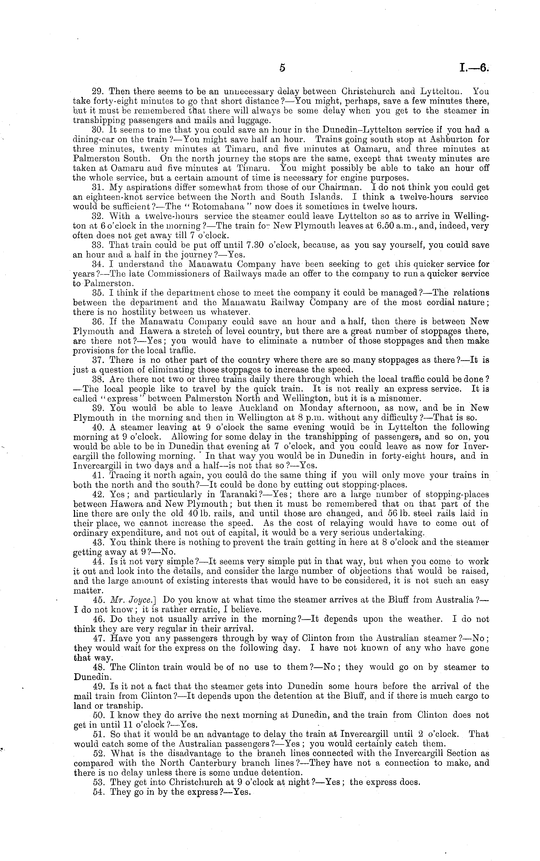 29. Then there seems to be an unnecessary delay between Christchurch and Lytfcelton. You take forty-eight minutes to go that short distance ? —You might, perhaps, save a few minutes there, hut it must be remembered that there will always be some delay when you get to the steamer in transhipping passengers and mails and luggage. 30. It seems to me that you could save an hour in the Dunedin-Lyttelton service if you had a dining-car on the train? —You might save half an hour. Trains going south stop at Ashburton for three minutes, twenty minutes at Timaru, and five minutes at Oamaru, and three minutes at Palmerston South. On the north journey the stops are the same, except that twenty minutes are taken at Oamaru and five minutes at Timaru. You might possibly be able to take an hour off the whole service, but a certain amount of time is necessary for engine purposes. 31. My aspirations differ somewhat from those of our Chairman. Ido not think you could get an eighteen-knot service between the North and South Islands. I think a twelve-hours service would be sufficient?— The " Rotomahana " now does it sometimes in twelve hours. 32. With a twelve-hours service the steamer could leave Lyttelton so as to arrive in Wellington at 6 o'clock in the morning ?—The train fo" New Plymouth leaves at 6.50 a.m., and, indeed, very often does not get away till 7 o'clock. 33. That train could be put off until 7.30 o'clock, because, as you say yourself, you could save an hour and a half in the journey ? —Yes. 34. I understand the Manawatu Company have been seeking to get this quicker service for years ?—The late Commissioners of Railways made an offer to the company to run a quicker service to Palmerston. 35. I think if the department chose to meet the company it could be managed ?—The relations between the department and the Manawatu Railway Company are of the most cordial nature; there is no hostility between us whatever. 36. If the Manawatu Company could save an hour and a half, then there is between New Plymouth and Hawera a stretch of level country, but there are a great number of stoppages there, are there not ? —Yes; you would have to eliminate a number of those stoppages and then make provisions for the local traffic. 37. There is no other part of the country where there are so many stoppages as there?—lt is just a question of eliminating those stoppages to increase the speed. 38. Are there not two or three trains daily there through which the local traffic could be done ? —The local people like to travel by the quick train. It is not really an express service. It is called "express" between Palmerston North and Wellington, but it is a misnomer. 39. You would be able to leave Auckland on Monday afternoon, as now, and be in New Plymouth in the morning and then in Wellington at 8 p.m. without any difficulty ? —That is so. 40. A steamer leaving at 9 o'clock the same evening would be in Lyttelton the following morning at 9 o'clock. Allowing for some delay in the transhipping of passengers, and so on, you would be able to be in Dunedin that evening at 7 o'clock, and you could leave as now for Invercargill the following morning. In that way you would be in Dunedin in forty-eight hours, and in Invercargill in two days and a half—is not that so ?—Yes. 41. Tracing it north again, you could do the same thing if you will only move your trains in both the north and the south? —It could be done by cutting out stopping-places. 42. Yes; and particularly in Taranaki? —Yes; there are a large number of stopping-places between Hawera and New Plymouth; but then it must be remembered that on that part of the line there are only the old 401b. rails, and until those are changed, and 561b. steel rails laid in their place, we cannot increase the speed. As the cost of relaying would have to come out of ordinary expenditure, and not out of capital, it would be a very serious undertaking. 43. You think there is nothing to prevent the train getting in here at 8 o'clock and the steamer getting away at 9 ?—No. 44. Is it not very simple?—lt seems very simple put in that way, but when you come to work it out and look into the details, and consider the large number of objections that would be raised, and the large amount of existing interests that would have to be considered, it is not such an easy matter. 45. Mr. Joyce.] Do you know at what time the steamer arrives at the Bluff from Australia ?— Ido not know; it is rather erratic, I believe. 46. Do they not usually arrive in the morning?—lt depends upon the weather. I do not think they are very regular in their arrival. 47. Have you any passengers through by way of Clinton from the Australian steamer?—No; they would wait for the express on the following day. I have not known of any who have gone that way. 48. The Clinton train would be of no use to them?—No; they would go on by steamer to Dunedin. 49. Is it not a fact that the steamer gets into Dunedin some hours before the arrival of the mail train from Clinton ?—lt depends upon the detention at the Bluff, and if there is much cargo to land or tranship. 50. I know they do arrive the next morning at Dunedin, and the train from Clinton does not get in until 11 o'clock ? —Yes. 51. So that it would be an advantage to delay the train at Invercargill until 2 o'clock. That would catch some of the Australian passengers? —Yes ; you would certainly catch them. 52. What is the disadvantage to the branch lines connected with the Invercargill Section as compared with the North Canterbury branch lines ?—They have not a connection to make, and there is no delay unless there is some undue detention. 53. They get into Christchurch at 9 o'clock at night ?—Yes ; the express does. 54. They go in by the express? —Yes.