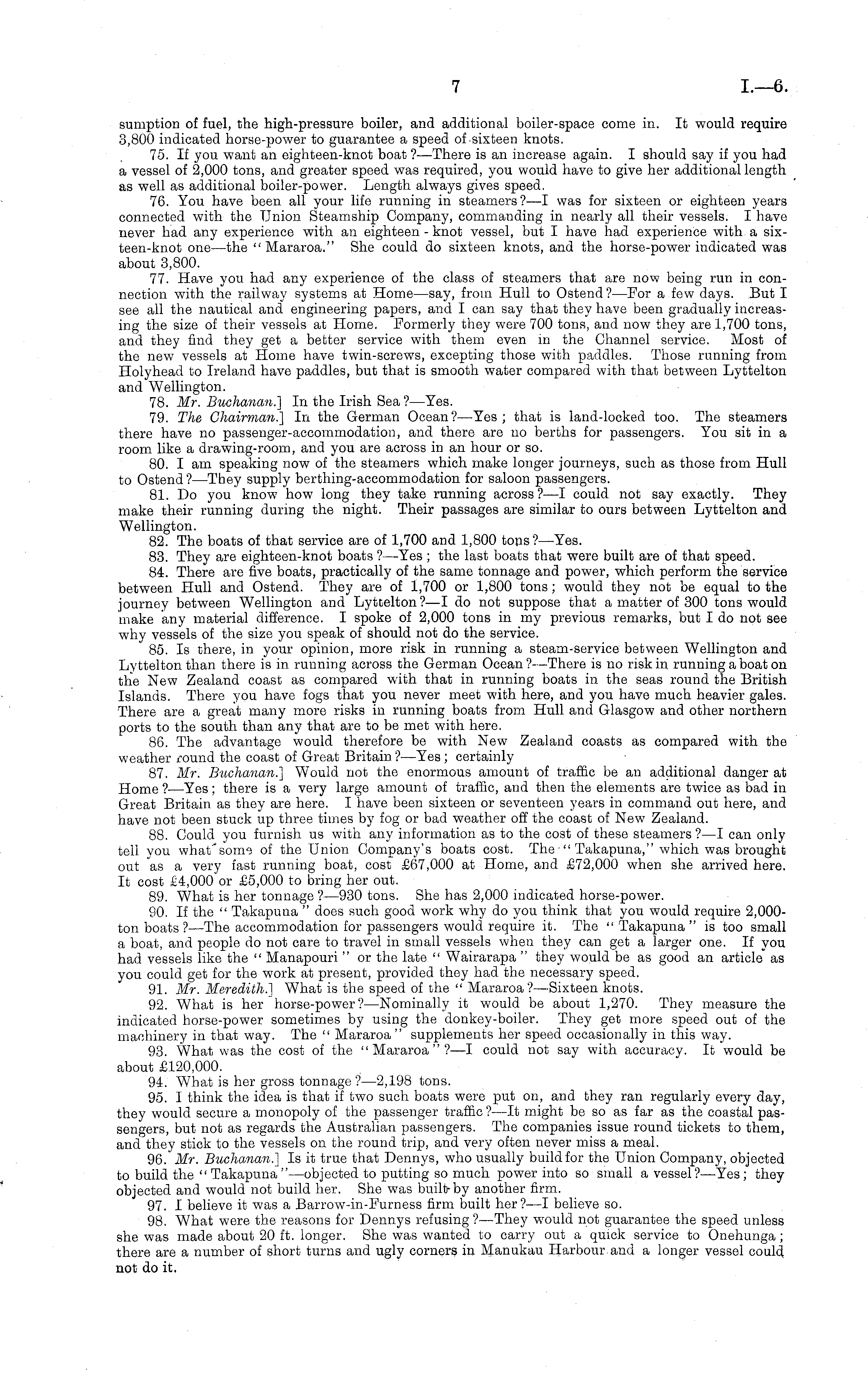 sumption of fuel, the high-pressure boiler, and additional boiler-space come in. It would require 3,800 indicated horse-power to guarantee a speed of sixteen knots. 75. If you want an eighteen-knot boat ? —There is an increase again. I should say if you had a vessel of 2,000 tons, and greater speed was required, you would have to give her additional length as well as additional boiler-power. Length always gives speed. 76. You have been all your life running in steamers?—l was for sixteen or eighteen years connected with the Union Steamship Company, commanding in nearly all their vessels. I have never had any experience with an eighteen - knot vessel, but I have had experience with a six-teen-knot one —the " Mararoa." She could do sixteen knots, and the horse-power indicated was about 3,800. 77. Have you had any experience of the class of steamers that are now being run in connection with the railway systems at Home—say, from Hull to Ostend ?—For a few days. But I see all the nautical and engineering papers, and I can say that they have been gradually increasing the size of their vessels at Home. Formerly they were 700 tons, and now they are 1,700 tons, and they find they get a better service with them even in the Channel service. Most of the new vessels at Home have twin-screws, excepting those with paddles. Those running from Holyhead to Ireland have paddles, but that is smooth water compared with that between Lyttelton and Wellington. 78. Mr. Buchanan.} In the Irish Sea ?—Yes. 79. The Chairman.] In the German Ocean?— Yes; that is land-locked too. The steamers there have no passenger-accommodation, and there are no berths for passengers. You sit in a room like a drawing-room, and you are across in an hour or so. 80. I am speaking now of the steamers which make longer journeys, such as those from Hull to Ostend ? —They supply berthing-accommodation for saloon passengers. 81. Do you know how long they take running across ? —I could not say exactly. They make their running during the night. Their passages are similar to ours between Lyttelton and Wellington. 82. The boats of that service are of 1,700 and 1,800 tons?— Yes. 83. They are eighteen-knot boats ?—Yes; the last boats that were built are of that speed. 84. There are five boats, practically of the same tonnage and power, which perform the service between Hull and Ostend. They are of 1,700 or 1,800 tons; would they not be equal to the journey between Wellington and Lytcelton?—l do not suppose that a matter of 300 tons would make any material difference. I spoke of 2,000 tons in my previous remarks, but Ido not see why vessels of the size you speak of should not do the service. 85. Is there, in your opinion, more risk in running a steam-service between Wellington and Lyttelton than there is in running across the German Ocean?— There is no risk in running a boat on the New Zealand coast as compared with that in running boats in the seas round the British Islands. There you have fogs that you never meet with here, and you have much heavier gales. There are a great many more risks in running boats from Hull and Glasgow and other northern ports to the south than any that are to be met with here. 86. The advantage would therefore be with New Zealand coasts as compared with the weather round the coast of Great Britain ? —Yes ; certainly 87. Mr. Buchanan.] Would not the enormous amount of traffic be an additional danger at Home ?—Yes; there is a very large amount of traffic, and then the elements are twice as bad in Great Britain as they are here. I have been sixteen or seventeen years in command out here, and have not been stuck up three times by fog or bad weather off the coast of New Zealand. 88. Could you furnish us with any information as to the cost of these steamers ? —I can only tell you what'somo of the Union Company's boats cost. The " Takapuna," which was brought out "as a very fast running boat, cost £67,000 at Home, and £72,000 when she arrived here. It cost £4,000 or £5,000 to bring her out. 89. What is her tonnage ?—930 tons. She has 2,000 indicated horse-power. 90. If the " Takapuna " does such good work why do you think that you would require 2,000---ton boats ?—The accommodation for passengers would require it. The " Takapuna " is too small a boat, and people do not care to travel in small vessels when they can get a larger one. If you had vessels like the " Manapouri " or the late " Wairarapa " they would be as good an article as you could get for the work at present, provided they had the necessary speed. 91. Mr. Meredith.} What is the speed of the " Mararoa? —Sixteen knots. 92. What is her horse-power?— Nominally it would be about 1,270. They measure the indicated horse-power sometimes by using the donkey-boiler. They get more speed out of the machinery in that way. The " Mararoa" supplements her speed occasionally in this way. 93. What was the cost of the "Mararoa"?—l could not say with accuracy. It would be about £120,000. 94. What is her gross tonnage ? —2,198 tons. 95. I think the idea is that if two such boats were put on, and they ran regularly every day, they would secure a monopoly of the passenger traffic ?—lt might be so as far as the coastal passengers, but not as regards the Australian passengers. The companies issue round tickets to them, and they stick to the vessels on the round trip, and very often never miss a meal. 96. Mr. Buchanan.] Is it true that Dennys, who usually build for the Union Company, objected to build the " Takapuna" —objected to putting so much power into so small a vessel?— Yes; they objected and would not build her. She was built-by another firm. 97. I believe it was a Barrow-in-Furness firm built her?—l believe so. 98. What were the reasons for Dennys refusing?— They would not guarantee the speed unless she was made about 20 ft. longer. She was wanted to carry out a quick service to Onehunga ; there are a number of short turns 